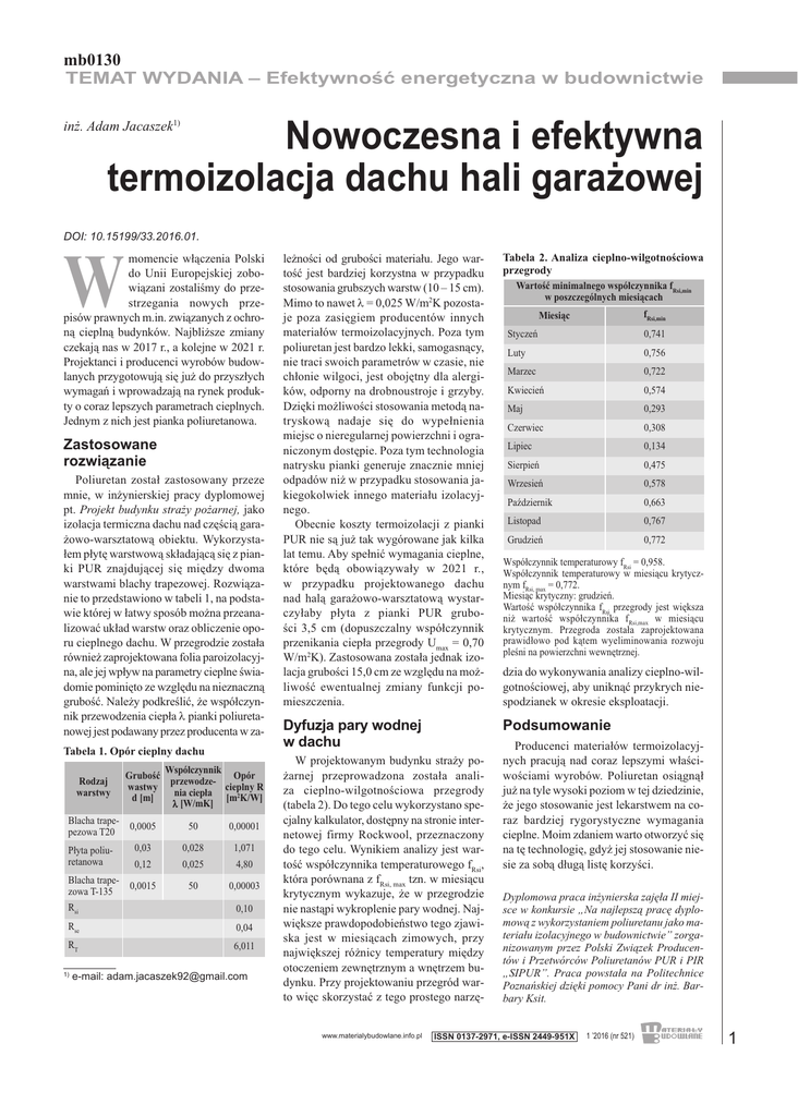 mb0130 TEMAT WYDANIA – Efektywność energetyczna w budownictwie inż. Adam Jacaszek1) Nowoczesna i efektywna termoizolacja dachu hali garażowej DOI: 10.15199/33.2016.01. momencie włączenia Polski do Unii Europejskiej zobowiązani zostaliśmy do przestrzegania nowych przepisów prawnych m.in. związanych z ochroną cieplną budynków. Najbliższe zmiany czekają nas w 2017 r., a kolejne w 2021 r. Projektanci i producenci wyrobów budowlanych przygotowują się już do przyszłych wymagań i wprowadzają na rynek produkty o coraz lepszych parametrach cieplnych. Jednym z nich jest pianka poliuretanowa. W Zastosowane rozwiązanie Poliuretan został zastosowany przeze mnie, w inżynierskiej pracy dyplomowej pt. Projekt budynku straży pożarnej, jako izolacja termiczna dachu nad częścią garażowo-warsztatową obiektu. Wykorzystałem płytę warstwową składającą się z pianki PUR znajdującej się między dwoma warstwami blachy trapezowej. Rozwiązanie to przedstawiono w tabeli 1, na podstawie której w łatwy sposób można przeanalizować układ warstw oraz obliczenie oporu cieplnego dachu. W przegrodzie została również zaprojektowana folia paroizolacyjna, ale jej wpływ na parametry cieplne świadomie pominięto ze względu na nieznaczną grubość. Należy podkreślić, że współczynnik przewodzenia ciepła λ pianki poliuretanowej jest podawany przez producenta w zaTabela 1. Opór cieplny dachu Rodzaj warstwy Blacha trapepezowa T20 Płyta poliuretanowa Blacha trapezowa T-135 Rsi Współczynnik Grubość Opór przewodzewastwy cieplny R nia ciepła d [m] [m2K/W] λ [W/mK] 0,0005 50 0,00001 0,03 0,028 1,071 0,12 0,025 4,80 0,0015 50 0,00003 0,10 Rse 0,04 RT 6,011 1) e-mail: [email protected] leżności od grubości materiału. Jego wartość jest bardziej korzystna w przypadku stosowania grubszych warstw (10 – 15 cm). Mimo to nawet λ = 0,025 W/m2K pozostaje poza zasięgiem producentów innych materiałów termoizolacyjnych. Poza tym poliuretan jest bardzo lekki, samogasnący, nie traci swoich parametrów w czasie, nie chłonie wilgoci, jest obojętny dla alergików, odporny na drobnoustroje i grzyby. Dzięki możliwości stosowania metodą natrysko wą nadaje się do wy pełnienia miejsc o nieregularnej powierzchni i ograniczonym dostępie. Poza tym technologia natrysku pianki generuje znacznie mniej odpadów niż w przypadku stosowania jakiegokolwiek innego materiału izolacyjnego. Obecnie koszty termoizolacji z pianki PUR nie są już tak wygórowane jak kilka lat temu. Aby spełnić wymagania cieplne, które będą obowiązywały w 2021 r., w przypadku projektowanego dachu nad halą garażowo-warsztatową wystarczyłaby płyta z pianki PUR grubości 3,5 cm (dopuszczalny współczynnik przenikania ciepła przegrody Umax = 0,70 W/m2K). Zastosowana została jednak izolacja grubości 15,0 cm ze względu na możliwość ewentualnej zmiany funkcji pomieszczenia. Tabela 2. Analiza cieplno-wilgotnościowa przegrody Dyfuzja pary wodnej w dachu Podsumowanie W projektowanym budynku straży pożarnej przeprowadzona została analiza cieplno-wilgotnościowa przegrody (tabela 2). Do tego celu wykorzystano specjalny kalkulator, dostępny na stronie internetowej firmy Rockwool, przeznaczony do tego celu. Wynikiem analizy jest wartość współczynnika temperaturowego fRsi, która porównana z fRsi, max tzn. w miesiącu krytycznym wykazuje, że w przegrodzie nie nastąpi wykroplenie pary wodnej. Największe prawdopodobieństwo tego zjawiska jest w miesiącach zimowych, przy największej różnicy temperatury między otoczeniem zewnętrznym a wnętrzem budynku. Przy projektowaniu przegród warto więc skorzystać z tego prostego narzęwww.materialybudowlane.info.pl Wartość minimalnego współczynnika fRsi,min w poszczególnych miesiącach fRsi,min Miesiąc Styczeń 0,741 Luty 0,756 Marzec 0,722 Kwiecień 0,574 Maj 0,293 Czerwiec 0,308 Lipiec 0,134 Sierpień 0,475 Wrzesień 0,578 Październik 0,663 Listopad 0,767 Grudzień 0,772 Współczynnik temperaturowy fRsi = 0,958. Współczynnik temperaturowy w miesiącu krytycznym fRsi, max = 0,772. Miesiąc krytyczny: grudzień. Wartość współczynnika fRsi przegrody jest większa niż wartość współczynnika fRsi,max w miesiącu krytycznym. Przegroda została zaprojektowana prawidłowo pod kątem wyeliminowania rozwoju pleśni na powierzchni wewnętrznej. dzia do wykonywania analizy cieplno-wilgotnościowej, aby uniknąć przykrych niespodzianek w okresie eksploatacji. Producenci materiałów termoizolacyjnych pracują nad coraz lepszymi właściwościami wyrobów. Poliuretan osiągnął już na tyle wysoki poziom w tej dziedzinie, że jego stosowanie jest lekarstwem na coraz bardziej rygorystyczne wymagania cieplne. Moim zdaniem warto otworzyć się na tę technologię, gdyż jej stosowanie niesie za sobą długą listę korzyści. Dyplomowa praca inżynierska zajęła II miejsce w konkursie „Na najlepszą pracę dyplomową z wykorzystaniem poliuretanu jako materiału izolacyjnego w budownictwie” zorganizowanym przez Polski Związek Producentów i Przetwórców Poliuretanów PUR i PIR „SIPUR”. Praca powstała na Politechnice Poznańskiej dzięki pomocy Pani dr inż. Barbary Ksit. ISSN 0137-2971, e-ISSN 2449-951X 1 ’2016 (nr 521) 1