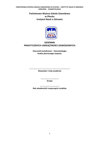 PAŃSTWOWA WYŻSZA SZKOŁA ZAWODOWA W PŁOCKU – INSTYTUT NAUK O ZDROWIU KIERUNEK - KOSMETOLOGIA Państwowa Wyższa Szkoła Zawodowa w Płocku Instytut Nauk o Zdrowiu DZIENNIK PRAKTYCZNYCH UMIEJĘTNOŚCI ZAWODOWYCH Kierunek kształcenia – Kosmetologia studia pierwszego stopnia. ………………………………………………………………….. Nazwisko i imię studenta ……………………………. Grupa ………………………………. Rok akademicki rozpoczęcia studiów 1 PAŃSTWOWA WYŻSZA SZKOŁA ZAWODOWA W PŁOCKU – INSTYTUT NAUK O ZDROWIU KIERUNEK - KOSMETOLOGIA ………………………………………………………………………………………….. Imię i nazwisko ……………………………………………… numer albumu …………………………………………………………….. kierunek studiów ………………………………………………………………………….. rok akademicki rozpoczęcia studiów 2 PAŃSTWOWA WYŻSZA SZKOŁA ZAWODOWA W PŁOCKU – INSTYTUT NAUK O ZDROWIU KIERUNEK - KOSMETOLOGIA 1. SYLWETKA ABSOLWENTA A. Dyplom licencjata kosmetologii uzyskuje absolwent studiów pierwszego stopnia na kierunku kosmetologia, który: 1. w zakresie wiedzy posiada: a. szczegółową wiedzę z zakresu kosmetologii b. ogólną wiedzę z zakresu Innych nauk medycznych, c. znajomość regulacji prawnych i norm etycznych odnoszących się do wykonywania zawodu kosmetologa; 2. w zakresie umiejętności potrafi: a. korzystać z aktualnej wiedzy dla zapewnienia bezpieczeństwa i wysokiego poziomu usług kosmetologicznych, b. udzielać usług w zakresie zachowania zdrowia i dobrej kondycji zwłaszcza dotyczącej skóry i jej przydatków oraz zapobiegania niektórym chorobom np. otyłości, c. samodzielnie wykonywać zawód, zgodnie z zasadami etyki d. organizować pracę własną; nawiązywać współpracę z firmami kosmetycznymi, innymi placówkami prowadzącymi działalność związaną z szeroko rozumianą promocją, profilaktyką i opieką zdrowotną oraz inicjować i wspierać działania społeczności lokalnej na rzecz zdrowia; 3. w zakresie kompetencji społecznych: a. skutecznie i z empatią porozumiewa się z klientem, b. posiada świadomość czynników wpływających na reakcje własne i klienta, c. posiada świadomość konieczności permanentnego, ustawicznego kształcenia się. Absolwent studiów pierwszego stopnia na kierunku kosmetologia jest przygotowany do podjęcia studiów drugiego stopnia. B. W wyniku kształcenia absolwent wykaże się umiejętnością wykorzystania w pracy funkcji zawodowych: 1. zorganizowania i kierowania gabinetami kosmetycznymi, salonami odnowy biologicznej, centrami SPA itp. 2. właściwego zaplanowania i profesjonalnego wykonywania zabiegów kosmetycznych: pielęgnacyjnych, leczniczych i upiększających z uwzględnieniem wskazań i przeciwwskazań; 3. prawidłowego odczytywania składu kosmetyku i ustalania jego zastosowania; 4. stosowania kosmetyków zgodnie z rozpoznaniem; 5. ścisłej współpracy z lekarzem dermatologiem, chirurgiem plastycznym, oraz lekarzami medycyny estetycznej w zakresie pielęgnacji skóry zmienionej chorobowo; 6. udzielania pierwszej pomocy; 7. pełnienia funkcji edukacyjnej mającej na celu promowanie zdrowego stylu życia i dbałości o pielęgnację ciała i urody; 8. udzielania fachowej pomocy i edukacji osobom nie tylko ze skórą zdrową, ale również z jej defektami i chorobami; 3 PAŃSTWOWA WYŻSZA SZKOŁA ZAWODOWA W PŁOCKU – INSTYTUT NAUK O ZDROWIU KIERUNEK - KOSMETOLOGIA 9. edukacji klienta w zakresie doboru odpowiedniej aktywności ruchowej i ćwiczeń fizycznych; 10. nawiązywania właściwego kontaktu z potencjalnymi klientami, oraz zapewnienia im komfortu psychicznego i relaksu podczas wykonywania zabiegów kosmetycznych; 11. pracy związanej z produkcją kosmetyków; 12. twórczego działania w zakresie poprawy estetyki i piękna ludzkiego ciała; 13. podnoszenia swoich kwalifikacji i doskonalenia zawodowego na rynku krajowym i międzynarodowym, 14. bycia świadomym współodpowiedzialności za zdrowie i wygląd klienta, 15. wykonywania zawodu ze szczególną starannością, zgodnie z zasadami etyki i uregulowaniami prawnymi. 16. Absolwent po ukończeniu studiów licencjackich uzyskuje możliwość kształcenia na studiach uzupełniających II stopnia. 4 PAŃSTWOWA WYŻSZA SZKOŁA ZAWODOWA W PŁOCKU – INSTYTUT NAUK O ZDROWIU KIERUNEK - KOSMETOLOGIA Oświadczam, że zapoznałam/em się z Regulaminem zajęć praktycznych i praktyk zawodowych dla Kierunku Kosmetologia ………………………………………………………….. Podpis studenta 5 PAŃSTWOWA WYŻSZA SZKOŁA ZAWODOWA W PŁOCKU – INSTYTUT NAUK O ZDROWIU KIERUNEK - KOSMETOLOGIA 2. OGÓLNE ZASADY ODBYWANIA PRAKTYK ZAWODOWYCH NA KIERUNKU KOSMETOLOGIA Student ma prawo do: 1. Przejawiania własnej aktywności w zdobywaniu wiedzy i umiejętności. 2. Uzyskania wyjaśnień i odpowiedzi w przypadku wątpliwości dotyczących treści nauczania. 3. Efektywnego współdziałania w organizacji procesu kształcenia. 4. Jawnego wyrażania swoich opinii dotyczących problematyki zajęć; nie może to jednak uwłaczać niczyjej godności. 5. Uzyskania jawnej bieżącej i końcowej oceny swojej wiedzy i umiejętności przeprowadzanej przez opiekuna praktyk. 6. Do jednej 30-minutowej przerwy w trakcie zajęć na spożycie posiłku. Student ma obowiązek: 1. 2. 3. 4. 5. 6. 7. 8. 9. 10. 11. 12. 13. 14. 15. 16. 17. 18. 19. Godnego reprezentowania PWSZ w Płocku na zewnątrz; Przejęcia odpowiedzialności za rozwój własnych kompetencji zawodowych (nabycie i doskonalenie praktycznych umiejętności zawodowych); Punktualnego rozpoczynania zajęć; Noszenia estetycznego i pełnego umundurowania (strój ochronny i buty ochronne – stabilne, bezpieczne) wraz z identyfikatorem; Przestrzegania regulaminów i procedur obowiązujących w placówce, w której odbywa praktyk