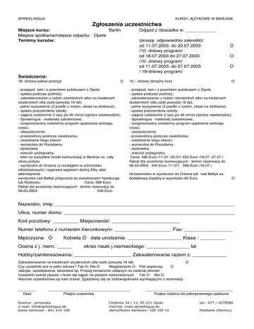 SPREELINGUA KURSY J¢ZYKOWE W BERLINIE Zgłoszenia uczestnictwa Miejsce kursu: Berlin Miejsce spotkania/miejsce odjazdu: Opole Terminy kursów: Odjazd z /dosiadka w: ____________ /prosz´ odpowiednio zakreÊliç/ od 11.07.2003. do 20.07.2003 /10- dniowy program/ od 18.07.2003 do 27.07.2003. /10- dniowy program/ od 11.07.2003. do 27.07.2003 / 18-dniowy program/ O O O Âwiadczenia: 18- dniowy pakiet prze˝yç O - przejazd tam i z powrotem autobusem z Opola - opieka podczas podró˝y; - zakwaterowanie u rodzin niemieckich albo na kwaterach studenckich (dla osób powy˝ej 16 lat); - pełne wy˝ywienie (2 posiłki u rodzin, obiad na stołówce); - opieka pracowników szkoły; - zaj´cia codziennie 3 razy po 45 minut (oprócz weekendów); - Spreelingua - materiały szkoleniowe; - zorganizowany codzienny program sp´dzania wolnego czasu; - ubezpieczenie; - przewodnicy podczas zwiedzania; - zwiedzanie targu staroci - wycieczka do Poczdamu; - dyskoteka; - wieczór po˝egnalny. - bilet na wszystkie Êrodki komunikacji w Berlinie na cały okres pobytu - wycieczka do Drezna (z noclegiem w schronisku młodzie˝owym) i wyprawa kajakiem dolinà Elby albo alternatywnie wycieczka nad Bałtyk połàczona ze zwiedzaniem Hamburga lub Rostocku. Cena: 599 Euro Rabat dla wczeÊniej rezerwujàcych : termin rezerwacji do 08.03.2003. 549 Euro 10 – dniowy doraêny kurs O - przejazd tam i z powrotem autobusem z Opola - opieka podczas podró˝y; - zakwaterowanie u rodzin niemieckich albo na kwaterach studenckich (dla osób powy˝ej 16 lat); - pełne wy˝ywienie (2 posiłki u rodzin, obiad na stołówce); - opieka pracowników szkoły; - zaj´cia codziennie 3 razy po 45 minut (oprócz weekendów); - Spreelingua - materiały szkoleniowe; - zorganizowany codzienny program sp´dzania wolnego czasu; - ubezpieczenie; - przewodnicy podczas zwiedzania; - zwiedzanie targu staroci - wycieczka do Poczdamu; - dyskoteka; - wieczór po˝egnalny. Cena: 460 Euro /11.07.-20.07/ 425 Euro /18.07.-27.07./ Rabat dla wczeÊniej rezerwujàcych : termin rezerwacji do 08.03.2003. 440 Euro /11.07/ 399 Euro /18.07./ Uczestnictwo w wycieczce do Drezna lub nad Bałtyk za dodatkowà dopłatà w wysokoÊci 60 Euro O Nazwisko, imi´: _______________________________________________________________ Ulica, numer domu: ____________________________________________________________ Kod pocztowy: _________ MiejscowoÊç: ________________________ Numer telefonu z numerem kierunkowym: ____________________ Fax: _________________ M´˝czyzna O Kobieta O data urodzenia: ___________________ Klasa : _________ Ocena z j. niem.: _____ okres nauki j.niemieckiego: _______________ lat Hobby/zainteresowania: ____________________ Zakwaterowanie razem z: ____________ Zakwaterowanie na kwaterach studenckich (dla osób powy˝ej 16 lat) O Czy uczestnik jest w pełni zdrowy? Tak O; Nie O Wegetarianin O Pali papierosy O /alergie, upoÊledzenia, lekarstwa itp. Prosz´ koniecznie załàczyç na osobnej stronie/ Uczestnik potrafi pływaç i mo˝e si´ kàpaç na pla˝ach niestrze˝onych Tak O Nie O Warunki uczestnictwa sà nam znane. Zgadzamy si´ ze zobowiàzaniami wynikajàcymi z rezerwacji. _______ Data ________________________________ Podpis uczestnika Ewelina _arnowska e-mail: [email protected] konto bankowe : 651 214 109 __________________________________ Podpis rodzica lub pełnoprawnego opiekuna Chabrów 34 / 13, 45-221 Opole internet: www.spreelingua.de identyfikator bankowy: 100 100 10 tel.: 077 / 4578980 Postbank (Niemcy) SPREELINGUA KURSY J¢ZYKOWE W BERLINIE Warunki umowy 1. Potwierdzenie/ płatnoÊç Moment otrzymania przez organizatora – Szkoł´ Spreelingua w Berlinie potwierdzenia uczestnictwa w kursie j´zykowym jest równoznaczny z zawarciem umowy. Od tego te˝ momentu w ciàgu 14 dni uczestnik jest zobowiàzany do uiszczenia wpłaty zaliczki w wysokoÊci 75 Euro na konto organizatora. Do chwili planowanego wyjazdu musi byç przekazana pełna op_ata za kurs na konto organizatora tzn. w dniu odjazdu cała nale˝noÊç musi znajdowaç si´ na koncie organizatora. W wyjàtkowych sytuacjach,w terminie minimum cztery tygodnie przed odjazdem i po uprzednim ustaleniu z organizatorem, reszta nale˝nej kwoty mo˝e byç wpłacona bezpo_rednio u organizatora w dniu odjazdu. 2. Załàczniki Za__czniki : bilet, plan pobytu, adres rodziny przyjmujàcej danego uczestnika oraz adres szkoły. Załàczniki zostanà przesłane pocztà do uczestników, w terminie nie wczeÊniej jak dwa tygodnie przed planowanym odjazdem. 3. Osoba zast´pcza Do momentu odjazdu w prawa i obowiàzki uczestnika mo˝e wstàpiç trzecia osoba, je˝eli nie wi__e si´ taka zamiana z powstaniem obiektywnych przeszkód. W przypadku zmiany uczestnika b´dà pobierane dodatkowe opłaty manipulacyjne w wysokoÊci 20 Euro. 4. Rezygnacja i przeksi´gowanie Przed rozpocz´ciem kursu /przed odjazdem/ uczestnik mo˝e w ka˝dej chwili zrezygnowaç z uczestnictwa. Rezygnacj´ nale˝y zło˝yç pisemnie z wyjaÊnieniem. W wypadku rezygnacji organizator- Szkoła Spreelingua w Berlinie zgodnie z § 651 niemieckiego kodeksu cywilnego ma prawo do roszczenia odpowiedniego odszkodowania tj. poboru kwoty ryczałtowej. Miernikiem wysokoÊci pobieranej kwoty ryczałtowej jest data odstàpienia od umowy tj. data zg_oszenia o rezygnacji w siedzibie Szkoły Spreelingua w Polsce. W przypadku rezygnacji b´dà pobierane kwoty ryczałtowe w nast´pujàcej wysokoÊci: - w terminie do 30 dni przed planowym odjazdem 15 % - w terminie do 15 dni przed planowym odjazdem 35 % - w terminie do 6 dni przed planowym odjazdem 65 % - w dniu odjazdu 75 % - w przepadku niewstawienia si´ w dniu odjazdu bez zgłoszenia rezygnacji 80 % 5. Minimalna iloÊç uczestników Kursy j´zykowe zakładajà minimalnà iloÊç uczestników. W przypadku kursu 10- dniowego minimalna iloÊç uczestników wynosi 18 osób, zaÊ przy kursie 18- dniowym 15 osób. W przypadku nie osiàgni´cia minimalnej iloÊci uczestników organizator- Szkoła Spreelingua w Ber