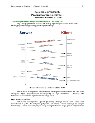 Programowanie Sieciowe 1 – Tomasz Jaworski 1 Zaliczenie przedmiotu Programowanie sieciowe 1 LABORATORIUM ORAZ WYKŁAD Zaliczenie przedmiotu Programowanie Sieciowe 1 na ocenę 3.0: Aby zaliczyć przedmiot na oceną 3.0, należy wykonać parę serwer -klient PING realizującą komunikację według poniższej specyfikacji: Serwer Klient nia ie połącze n a z ią w a N accept recv send "PONG\r\n " closesocket recv send "PONG\r\n " "PING\r\n" recv send send "PING\r\n" "PING\r\n" recv send connect recv send "OK\r\n" Zamknięc ie połączenia recv closesocket Rysunek 1 Komunikacja klient-serwer PING-PONG Serwer może być aplikacją wielowątkową. Może pracować w konsoli lub jako okno dialogowe. Język programowania wykorzystany do jego stworzenia – dowolny. Do testowania serwera można wykorzystać aplikację telnet. Opis działania serwera: Serwer ma skonfigurować system gniazdowy (funkcje socket, bind, listen) oraz nasłuchiwać w pętli. Po nadejściu połączenia od klienta, serwer oczekuje na kolejne komunikaty. Serwer powinien przyjąć każdy tekst przesłany do niego, jednak odpowiedzieć Programowanie Sieciowe 1 – Tomasz Jaworski 2 może tylko na linię zawierającą komunikat PING1. Dla danego klienta serwer odpowiada dwa razy na komunikat PING komunikatem PONG. Przy trzecim odebraniu komunikatu PING od klienta, serwer odpowiada komunikatem OK oraz zamyka połączenie. Serwer nie może wysyłać żadnych danych/komunikatów bez wcześniejszego odebrania żądania od klienta. Opis działania klienta: Klient ma za zadanie połączyć się z serwerem a następnie wysłać mu kolejno 3 komunikaty PING. Pierwszy komunikat ma zostać wysłany zaraz po połączeniu. Dwa kolejne natomiast, jako odpowiedź na komunikat PONG nadesłany przez serwer2. W ten sposób powstaje swoista sytuacja „odbijania piłeczki” (PING->PONG->PING->PONG->PING>OK) pokazana na rys. 1. Wysłane i odebrane komunikaty powinny być wyświetlane na ekranie w postaci tekstów „PING”, „PONG” oraz „OK”, jak w przykładzie: Polaczylem sie z serwerem 127.0.0.1:3301… Wysylam: PING Otrzymałem: PONG Wysylam: PING Otrzymałem: PONG Wysylam: PING Otrzymałem: OK Polaczenie zostalo zamkniete Elementy oceny serwera oraz klienta: ⇒ Serwer odpowiada tylko na komunikat PING. W przypadku odebrania innego komunikatu, serwer może je zignorować lub natychmiast zerwać połączenie. ⇒ Na pierwszy oraz drugi komunikat PING serwer odpowiada komunikatem PONG. Na trzeci komunikat PING serwer odpowiada komunikatem OK. ⇒ Zamknięcie połączenie ma odbywać się po stronie serwera. ⇒ Klient reaguje na komunikaty nadsyłane prze serwer i na komunikat PONG odpowiada komunikatem PING, realizując „odbijanie piłeczki” (jak pokazano na rysunku 1) ⇒ Znajomość poszczególnych elementów kodu klienta oraz serwera. ⇒ Student nie otrzyma zaliczenia, jeśli klient lub serwer będą wysyłały odpowiednio PING/PONG bez oczekiwania na wcześniejsze zdarzenia, jak na rysunku 1. Na mojej stronie umieściłem również gotowe (skompilowane) wersje serwera oraz klienta PING/PONG: http://tjaworski.kis.p.lodz.pl/ps1/wykonywalne/server_ping.exe http://tjaworski.kis.p.lodz.pl/ps1/wykonywalne/client_ping.exe Programy te można wykorzystać do testowania napisanych przez Państwa wersji klientów i serwerów. Proszę również zwrócić uwagę na działanie programu serwerowego. Aby to zrobić, proszę połączyć się programem telnet na adres 127.0.0.1 oraz port 3301. W tym celu należy wybrać z menu Start polecenie Uruchom lub wcisnąć kombinację klawiszy Windows+R, a następnie wpisać „telnet 127.0.0.1 3301”. W oknie programu 1 Podpowiedź: Nie trzeba przesyłać tekstu „PING”, „PONG” oraz „OK”. Stworzony protokół może wykorzystywać identyfikatory zamiast komunikatów, np. PING=1, PONG=2, OK=3. Zastosowanie jednego bajtu do przesyłania takiego komunikatu może znacznie ułatwić zadanie. 2 Wysłanie trzech poleceń PING bez oczekiwania na odpowiedzi PONG oznacza brak zgodności z zadaniem i brak zaliczenia laboratorium. Programowanie Sieciowe 1 – Tomasz Jaworski telnet, wpisując różne komunikaty (potwierdzane klawiszem ENTER) oraz komunikat „PING”, proszę obserwować informacje wyświetlane w oknie programu serwera. 3 Programowanie Sieciowe 1 – Tomasz Jaworski 4 Zaliczenie przedmiotu Programowanie Sieciowe 1 na ocenę 3.5 lub wyższą: Aby uzyskać ocenę 3.5 lub wyższą należy przygotować projekt o temacie wcześniej uzgodnionym z prowadzącym. Temat można ustalić w trakcie zajęć lub mailowo. Projekt należy oddać do końca semestru lub w sesji (proszę pamiętać o terminie złożenia indeksów do dziekanatu!!). Można go również zaprezentować na zajęciach laboratoryjnych. Przykładowe tematy: 1. Czat pozwalający na skomunikowanie się dwóch osób (sugerowany protokół TCP), 2. Czat pozwalający na skomunikowanie się wielu osób (sugerowany protokół UDP), 3. Przesyłanie pliku (klient podaje nazwę pliku a serwer przesyła jego zawartość; sugerowany protokół TCP), 4. Gra internetowa dla dwóch graczy (np. statki, kółko i krzyżk, itp.; sugerowany protokół TCP), 5. Przesyłanie obrazu z kamery internetowej do zdalnego komputera (sugerowany protokół TCP), 6. Przesyłanie obrazu dźwięku z mikrofonu do zdalnego komputera (sugerowany protokół TCP), 7. Zdalny pulpit – klient wysyła informacje o położeniu myszy i stanie przycisków a serwer wysyła zrzuty ekranu (podobnie do programu VNC; sugerowany protokół TCP), Projekt może dotyczyć również każdego innego zastosowania zaproponowanego przez studenta. Ważne jest jednak, aby tworzony program korzystał z biblioteki WinSock. Uwaga! Zaliczenie przedmiotu składa się z dwóch części: 1. przedstawienia działającego programu prowadzącemu 2. oraz omówienie jego działania. Przykładowe pytania, mogące paść podczas omawiania programu: a. Co realizuje funkcja recv? b. Co zwraca funkcja