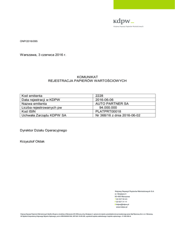 ONP/2016/095 Warszawa, 3 czerwca 2016 r. KOMUNIKAT REJESTRACJA PAPIERÓW WARTOŚCIOWYCH Kod emitenta Data rejestracji w KDPW Nazwa emitenta Liczba rejestrowanych pw Kod ISIN Uchwała Zarządu KDPW SA 2228 2016-06-06 AUTO PARTNER SA 94.000.000 PLATPRT00018 Nr 368/16 z dnia 2016-06-02 Dyrektor Działu Operacyjnego Krzysztof Ołdak Krajowy Depozyt Papierów Wartościowych S.A. ul. Książęca 4 00-498 Warszawa T 22 537 93 43 F 22 627 31 11 E [email protected] www.kdpw.pl Krajowy Depozyt Papierów Wartościowych Spółka Akcyjna z siedzibą w Warszawie (00-498) przy ulicy Książęcej 4, wpisana do rejestru przedsiębiorców prowadzonego przez Sąd Rejonowy dla m. st. Warszawy, XII Wydział Gospodarczy Krajowego Rejestru Sądowego, pod nr KRS 0000081582, NIP526-10-09-528, wysokość kapitału zakładowego i kapitału wpłaconego - 21.000.000 zł.