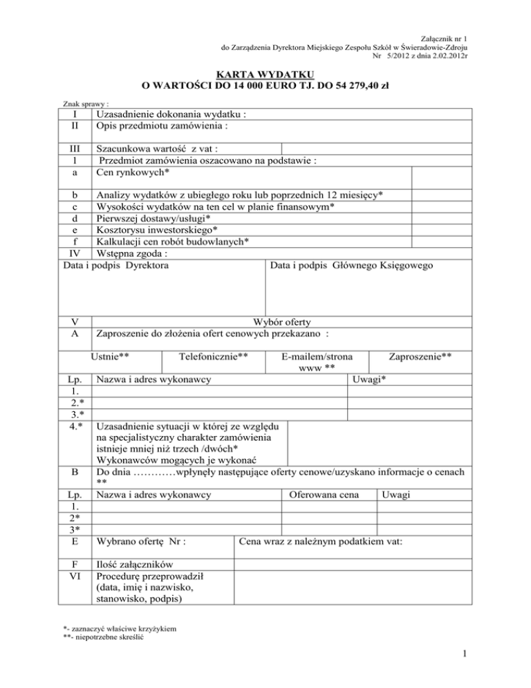 Załącznik nr 1 do Zarządzenia Dyrektora Miejskiego Zespołu Szkół w Świeradowie-Zdroju Nr 5/2012 z dnia 2.02.2012r KARTA WYDATKU O WARTOŚCI DO 14 000 EURO TJ. DO 54 279,40 zł Znak sprawy : I II Uzasadnienie dokonania wydatku : Opis przedmiotu zamówienia : III 1 a Szacunkowa wartość z vat : Przedmiot zamówienia oszacowano na podstawie : Cen rynkowych* b Analizy wydatków z ubiegłego roku lub poprzednich 12 miesięcy* c Wysokości wydatków na ten cel w planie finansowym* d Pierwszej dostawy/usługi* e Kosztorysu inwestorskiego* f Kalkulacji cen robót budowlanych* IV Wstępna zgoda : Data i podpis Dyrektora Data i podpis Głównego Księgowego V A Wybór oferty Zaproszenie do złożenia ofert cenowych przekazano : Ustnie** Lp. 1. 2.* 3.* 4.* B Lp. 1. 2* 3* E F VI Telefonicznie** Nazwa i adres wykonawcy E-mailem/strona Zaproszenie** www ** Uwagi* Uzasadnienie sytuacji w której ze względu na specjalistyczny charakter zamówienia istnieje mniej niż trzech /dwóch* Wykonawców mogących je wykonać Do dnia …………wpłynęły następujące oferty cenowe/uzyskano informacje o cenach ** Nazwa i adres wykonawcy Oferowana cena Uwagi Wybrano ofertę Nr : Cena wraz z należnym podatkiem vat: Ilość załączników Procedurę przeprowadził (data, imię i nazwisko, stanowisko, podpis) *- zaznaczyć właściwe krzyżykiem **- niepotrzebne skreślić 1