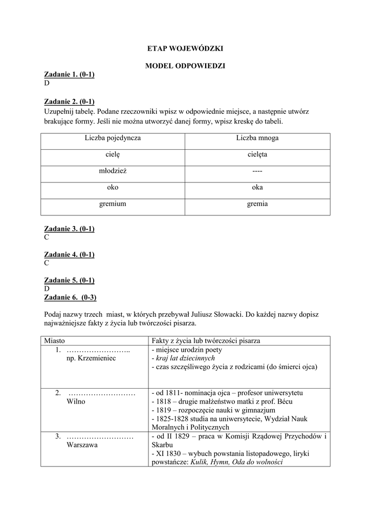 ETAP WOJEWÓDZKI MODEL ODPOWIEDZI Zadanie 1. (0-1) D Zadanie 2. (0-1) Uzupełnij tabelę. Podane rzeczowniki wpisz w odpowiednie miejsce, a następnie utwórz brakujące formy. Jeśli nie można utworzyć danej formy, wpisz kreskę do tabeli. Liczba pojedyncza Liczba mnoga cielę cielęta młodzież ---- oko oka gremium gremia Zadanie 3. (0-1) C Zadanie 4. (0-1) C Zadanie 5. (0-1) D Zadanie 6. (0-3) Podaj nazwy trzech miast, w których przebywał Juliusz Słowacki. Do każdej nazwy dopisz najważniejsze fakty z życia lub twórczości pisarza. Miasto 1. …………………….. np. Krzemieniec 2. ……………………… Wilno 3. ……………………… Warszawa Fakty z życia lub twórczości pisarza - miejsce urodzin poety - kraj lat dziecinnych - czas szczęśliwego życia z rodzicami (do śmierci ojca) - od 1811- nominacja ojca – profesor uniwersytetu - 1818 – drugie małżeństwo matki z prof. Bécu - 1819 – rozpoczęcie nauki w gimnazjum - 1825-1828 studia na uniwersytecie, Wydział Nauk Moralnych i Politycznych - od II 1829 – praca w Komisji Rządowej Przychodów i Skarbu - XI 1830 – wybuch powstania listopadowego, liryki powstańcze: Kulik, Hymn, Oda do wolności Np. Drezno – 1831 - dotarł tam po wyjeździe z Warszawy, w drodze do Londynu Londyn – 1831- przewoził pocztę dyplomatyczną, zafascynowany miastem Paryż - 1831-1832, od 1837 do 1849 (z przerwami) zwiedza miasto, galerie, inwestuje na giełdzie, realizuje się jako twórca Szwajcaria – Genewa, Paquis, okolice Jeziora Lemańskiego – pensjonat pani Pattey, wycieczki w Alpy, widzi Mont Blanc, przygotowuje do druku kolejne tomiki Rzym – przybył w lutym 1836 r. , spotkanie z Zygmuntem Krasińskim podróż na Wschód – Grecja, Egipt, Ziemia Święta – zwiedzanie miejsc historycznych, powstają wówczas np. Hymn (Smutno mi, Boże),Grób Agamemnona Poznań, Wrocław – ostatnia podróż poety, spotkanie z matką (maj 1848) Warszawa, Kraków - Wawel - sprowadzenie prochów poety do kraju, pochówek na Wawelu, uroczysta mowa Józefa Piłsudskiego. Uwaga! Dopuszcza się każdą inną odpowiedź ucznia zgodną z biografią poety. Zadanie 7. (0-2) Skierkę Chochlika Goplana widziana przez postać piękna, eteryczna, złotowłosa dziewica, królowa natury postać dziwna i rybia, wiedźma i jędza, wywiędły schabik galaretowata Uwaga! Dopuszcza się także inne sformułowania, mające uzasadnienie w tekście. Zadanie 8. (0-2) Postacie historyczne: np. król Jan Kazimierz, królowa Maria Kazimiera, Janusz Radziwiłł, Bogusław Radziwiłł, Stefan Czarniecki, Krzysztof Opaliński, itd. Wydarzenia historyczne: najazd Szwedów na Polskę, potop szwedzki, obrona klasztoru jasnogórskiego, kapitulacja pospolitego ruszenia pod Ujściem, ucieczka Jana Kazimierza na Śląsk, Przyznajemy po 1 pkt za prawidłowe przykłady postaci i wydarzeń. Uwaga! Dopuszcza się także inne przykłady, mające uzasadnienie w tekście. Zadanie 9. (0-2) Np. - podział bohaterów na dobrych i złych - walka dobra ze złem - dobro zwycięża, zło zostaje ukarane - postaci przekraczają ludzki wymiar, wychodzą zwycięsko z niebywałych opresji - obowiązuje zasada kara-nagroda za czyny - typowe dla baśni okazywanie się kimś innym (Kmicic-Babinicz) - pokonywanie szeregu przeszkód, by zdobyć nagrodę/rękę ukochanej Uwaga! Przyznajemy 1 pkt za 2 poprawne odpowiedzi, 2 pkt za 3 poprawne odpowiedzi. Zadanie 10. (0-4) W czym są do siebie podobni Jacek Soplica i Andrzej Kmicic? Sytuacja/zdarzenie/ cecha awanturnictwo, zadufanie w sobie piętno zdrajcy Jacek Soplica Jacek przekonany o swojej pozycji, zaufaniu ze strony Stolnika po zabójstwie Stolnika okrzyknięto go zdrajcą rozterki wewnętrzne przyznaje się przed samym sobą do błędów, chce je naprawić przemiana wewnętrzna, zmiana nazwiska staje się kimś innym, zostaje księdzem Robakiem na znak pokuty i pokory udział w walkach toczonych za wolność waszą i naszą, działalność konspiracyjna zyskuje przebaczenie, umiera wśród swoich, staje się bohaterem, odzyskuje szacunek chęć odpokutowania za winy rehabilitacja Andrzej Kmicic buta, zadziorność, wszczynanie kłótni, bójek, nadszarpnięta reputacja Kmicic złożył przysięgę Radziwiłłowi nieświadomy zamiarów magnata, uważano go za zdrajcę uświadamia sobie swoją pomyłkę w ocenie prawdziwych intencji Radziwiłłów zostaje Babiniczem wyrzeczenie się prywaty, pokora, odwaga, ocalenie króla, obrona klasztoru odzyskanie dobrego imienia, staje się człowiekiem honoru Uwaga! Dopuszcza się także inne przykłady, mające uzasadnienie w tekście. Przyznajemy: 4 pkt – 9 poprawnych wskazań 3 pkt za 8 -7 poprawnych wskazań, 2 pkt za 6 - 5 poprawnych wskazań, 1 pkt za 4- 3 poprawne wskazania Zadanie 11. (0-1) Np. 1. Zgłoszenie się na przymusowe roboty do Niemiec w celu odwrócenia uwagi od pochodzenia. 2. Przekupienie szmalcowników, szpicli. 3. Zmiana miejsca zamieszkania, np. krótkotrwały pobyt u Halinki. 4. Zatajenie wykształcenia, znajomości języka, udawanie kogoś innego (podczas podróży, w obozie, w pracy u bauerki). 5. Ucieczka z obozu pracy – pomoc Schulza. 6. Pewność siebie w czasie podróży, udawanie Niemki, obrażonej z powodu kontroli dokumentów. Uwaga! Dopuszcza się także inne przykłady, mające uzasadnienie w tekście. Zadanie 12. (0-1) A Zadanie 13. (0-2) np. - niejednoznacznie pozytywny bohater tytułowy (Antonio - człowiek miłosierny i lojalny przyjaciel, ale lekkomyślny człowiek interesu) - bohater drugoplanowy - Bassanio, który zabiega o rękę Porcji dla jej majątku, którego zachowania narażają innych na kłopoty - zdarzenia rozwijają się w taki sposób, że wydaje się, iż bohater tytułowy poniesie klęskę; pozornie szczęśliwe zakończenie dopiero w akcie IV - kontrowersyjne w komedii rozstrzygnięcie losu Shylocka - człowiek, którego pozbawia się majątku, nakazuje się zmianę wyznania, ojciec, który utracił córkę - podjęcie p