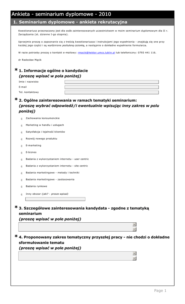 Ankieta - seminarium dyplomowe - 2010 1. Seminarium dyplomowe - ankieta rekrutacyjna Kwestionariusz przeznaczony jest dla osób zainteresowanych uczestnictwem w moim seminarium dyplomowym dla II r. Zarządzania (st. dzienne I-go stopnia). Uprzejmie proszę o zapoznanie się z treścią kwestionariusza i instrukcjami jego wypełnienia - znajdują się one przy k a żdej jego części i są wyróżnione pochyloną czcionką, a nastę pnie o dokładne wypełnienie formularza. W razie potrzeby proszę o kontakt e-mailowy: [email protected] lub telefoniczny: 0793 441 116. dr Radosław Mącik * 1. Informacje ogólne o kandydacie (proszę wpisać w pola poniżej) Imie i nazwisko E-mail Tel. kontaktowy * 2. Ogólne zainteresowania w ramach tematyki seminarium: (proszę wybrać odpowiedź/i ewentualnie wpisując inny zakres w polu poniżej) c d e f g Zachowania konsumenckie c d e f g Marketing w handlu i usługach c d e f g Satysfakcja i lojalność klientów c d e f g Rozwój nowego produktu c d e f g E-marketing c d e f g E-biznes c d e f g Badania z wykorzystaniem internetu - user centric c d e f g Badania z wykorzystaniem internetu - site centric c d e f g Badania marketingowe - metody i techniki c d e f g Badania marketingowe - zastosowania c d e f g Badania rynkowe c d e f g Inny obszar (jaki? - prosze wpisać) * 3. Szczegółowe zainteresowania kandydata - zgodne z tematyką seminarium (proszę wpisać w pole poniżej) * 4. Proponowany zakres tematyczny przyszłej pracy - nie chodzi o dokładne sformułowanie tematu (proszę wpisać w pole poniżej) Page 1 Ankieta - seminarium dyplomowe - 2010 * 5. Znajomość języków obcych umożliwiająca korzystanie z literatury obcojęzycznej (proszę wybrać z listy, ew. wpisać inny język niż podane) c d e f g angielski c d e f g niemiecki c d e f g francuski c d e f g rosyjski c d e f g inny jezyk (jaki? - prosze wpisac) * 6. Umiejętność posługiwania się wybranymi narzędziami informatycznymi (proszę wybrać poziom umiejętności dla każdej z pozycji skali) bardzo żadna słaba przecię tna dobra pakiet biurowy typu Office: Word, Excel, PowerPoint itp. j k l m n j k l m n j k l m n j k l m n j k l m n pakiet statystyczny typu SPSS/Statistica/SAS j k l m n j k l m n j k l m n j k l m n j k l m n pakiet GIS typu MapInfo j k l m n j k l m n j k l m n j k l m n j k l m n jezyk HTML/edytory HTML j k l m n j k l m n j k l m n j k l m n j k l m n dobra * 7. Średnie oceny z dotychczasowych studiów - orientacyjnie (proszę wybrać właściwy przedział) poniżej 3 3,0-3,5 3,51-4 4,01-4,5 powyżej 4,5 ogółe m j k l m n j k l m n j k l m n j k l m n j k l m n przedmioty marketingowe j k l m n j k l m n j k l m n j k l m n j k l m n 8. Inne istotne informacje nie uwzględnione gdzie indziej (proszę wpisać w pole poniżej) Dzię kuję za wypełnienie kwestionariusza. Przypominam, że kolejność zgłoszeń nie jest brana pod uwagę . W przypadku nie wyczerpania limitu miejsc przyję te zostaną wszystkie zgłoszenia chę tnych do uczestnictwa w seminarium. Z poważaniem, dr Radosław Mącik Page 2