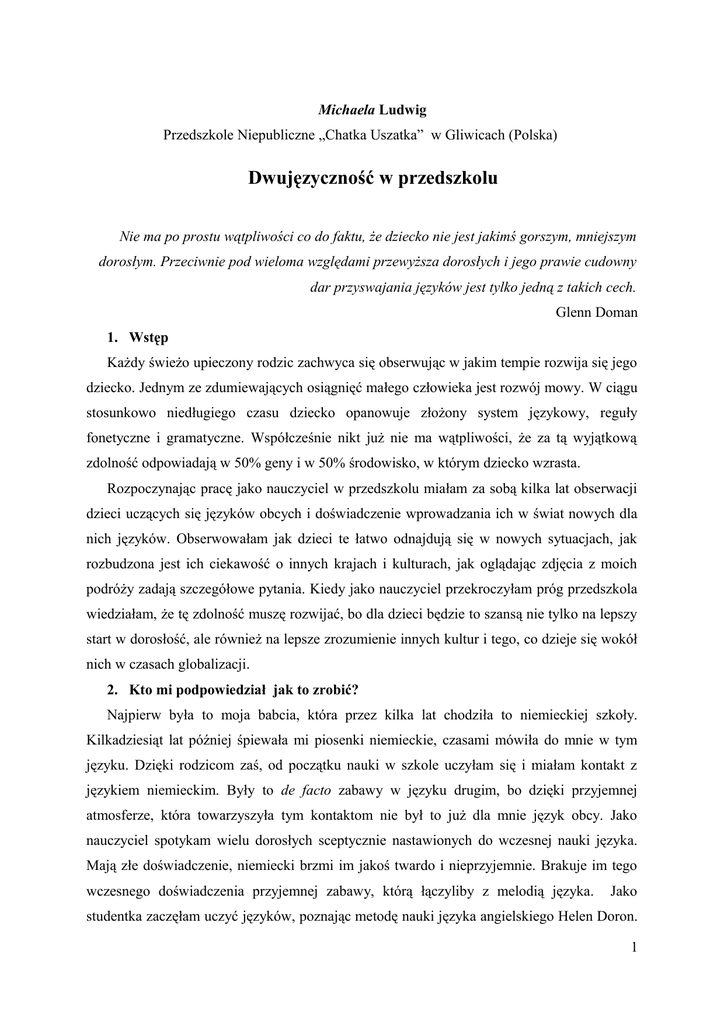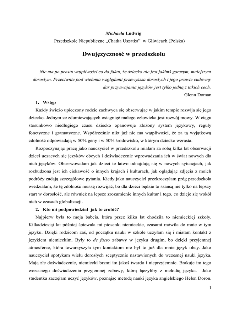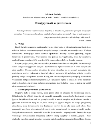 Michaela Ludwig Przedszkole Niepubliczne „Chatka Uszatka” w Gliwicach (Polska) Dwujęzyczność w przedszkolu Nie ma po prostu wątpliwości co do faktu, że dziecko nie jest jakimś gorszym, mniejszym dorosłym. Przeciwnie pod wieloma względami przewyższa dorosłych i jego prawie cudowny dar przyswajania języków jest tylko jedną z takich cech. Glenn Doman 1. Wstęp Każdy świeżo upieczony rodzic zachwyca się obserwując w jakim tempie rozwija się jego dziecko. Jednym ze zdumiewających osiągnięć małego człowieka jest rozwój mowy. W ciągu stosunkowo niedługiego czasu dziecko opanowuje złożony system językowy, reguły fonetyczne i gramatyczne. Współcześnie nikt już nie ma wątpliwości, że za tą wyjątkową zdolność odpowiadają w 50% geny i w 50% środowisko, w którym dziecko wzrasta. Rozpoczynając pracę jako nauczyciel w przedszkolu miałam za sobą kilka lat obserwacji dzieci uczących się języków obcych i doświadczenie wprowadzania ich w świat nowych dla nich języków. Obserwowałam jak dzieci te łatwo odnajdują się w nowych sytuacjach, jak rozbudzona jest ich ciekawość o innych krajach i kulturach, jak oglądając zdjęcia z moich podróży zadają szczegółowe pytania. Kiedy jako nauczyciel przekroczyłam próg przedszkola wiedziałam, że tę zdolność muszę rozwijać, bo dla dzieci będzie to szansą nie tylko na lepszy start w dorosłość, ale również na lepsze zrozumienie innych kultur i tego, co dzieje się wokół nich w czasach globalizacji. 2. Kto mi podpowiedział jak to zrobić? Najpierw była to moja babcia, która przez kilka lat chodziła to niemieckiej szkoły. Kilkadziesiąt lat później śpiewała mi piosenki niemieckie, czasami mówiła do mnie w tym języku. Dzięki rodzicom zaś, od początku nauki w szkole uczyłam się i miałam kontakt z językiem niemieckim. Były to de facto zabawy w języku drugim, bo dzięki przyjemnej atmosferze, która towarzyszyła tym kontaktom nie był to już dla mnie język obcy. Jako nauczyciel spotykam wielu dorosłych sceptycznie nastawionych do wczesnej nauki języka. Mają złe doświadczenie, niemiecki brzmi im jakoś twardo i nieprzyjemnie. Brakuje im tego wczesnego doświadczenia przyjemnej zabawy, którą łączyliby z melodią języka. Jako studentka zaczęłam uczyć języków, poznając metodę nauki języka angielskiego Helen Doron. 1 Dzięki tej metodzie, polegającej na „zanurzeniu” dziecka w języku, milion młodych ludzi w ponad 50 krajach na całym świecie nauczyło się bez większego wysiłku angielskiego, zaczynając ok. drugiego roku życia. Obecnie jako lektor Helen Doron prowadzę zajęcia z dziećmi od 3 miesiąca życia. Sprawdziły się zatem słowa Domana (na jego koncepcji Helen Doron oparła swój program) : Trzylatek nauczy się języka najlepiej. Pięciolatek nauczy się bardzo dużo, ale nie tak dużo jak trzylatek. Dziesięciolatek nauczy się dużo, ale mniej niż pięciolatek1. Glenn Doman w książce „Jak nauczyć małe dziecko czytać. Cicha rewolucja” opisuje historie kilku rodzin amerykańskich oficerów, którzy stacjonowali w obcych krajach. Wielu z nich próbowało opanować nowy język, uczęszczając nawet trzy razy w tygodniu do szkoły językowej. Mimo zatrudniania najlepszych nauczycieli, wysiłku uczących się i codziennego kontaktu z osobami posługującymi się nowym dla oficerów językiem, nie opanowali oni go w takim stopniu jak ich dzieci. Kto nauczył to dziecko? Nikt, naprawdę. Ono tylko przebywało w domu z niemieckojęzyczną nianią. Kto nauczył nianię niemieckiego? Nikt, naprawdę. Tata uczył się niemieckiego i nie mówi w tym języku. Dziecko nie było uczone i potrafi mówić po niemiecku2. Wiele takich obserwacji rodzin dwu i wielojęzycznych doprowadziły do prób naśladowani procesu naturalnego przyswajania mowy w nauczaniu języków obcych. W Polsce w zakresie języka niemieckiego już w latach dziewięćdziesiątych podejmowano próby wprowadzania nauczania języka metodami naturalnymi, tak by uczenie go nie było jedynie poznawaniem reguł gramatycznych i form wypowiedzi, ale naturalną drogą do poznanie i pielęgnowania korzeni i tradycji, dziadków, którzy choć nigdy nie zmieniali miejsca zamieszkania urodzili się w Niemczech, a dziś mieszkają w Polsce. Pierwsze kroki na tej drodze stawiane były we współpracy z kołami terenowymi Związku Niemieckich Stowarzyszeń Społeczno – Kulturalnych w Polsce przede wszystkim na Śląsku Opolskim. Początkowo najbardziej preferowaną formą była dodatkowa nauka języka niemieckiego. Wraz z popularyzacją wychowania dwujęzycznego i możliwością szkolenia nauczyciel w tym zakresie zaczęły powstawać grupy bilingwalne. Według informacji Instytut Stosunków Kulturalnych z Zagranicą (IFA) w Opolu, w Polsce jest obecnie ponad 100 przedszkoli, które prowadzą takie grupy dwujęzyczne. Współpraca z IFA, uczestnictwo w warsztatach metodycznych pozwoliło mi na opracowanie autorskiego programu edukacji dwujęzycznej „1, 2, 3 im Sauseschritt” w przedszkolu. 1 2 Doman G. Jak nauczyć małe dziecko czytać. Cicha rewolucja, Bydgoszcz 1992, s. 70. Ibidem, s. 69. 2 3. Jak wprowadziłam dwujęzyczność w przedszkolu? Istnieje wiele odmian programów wychowania dwujęzycznego. Ich najbardziej radykalną formą jest early total immersion, w której dzieci w momencie rozpoczęcia edukacji przedszkolnej „zanurzane” są w 100% w języku drugim. Staje się on od tej chwili jedynym językiem komunikacji w przedszkolu, jedynym językiem, w którym wychowawcy formułują swoje wypowiedzi kierowane do dzieci (por. http://bilibgual.com.pl// z dnia 15.05.2011). Formą mniej radykalną jest immersja częściowa (ang. early partial immersion). W tym programie język drugi jest używany jako środek komunikacji i interakcji w przedszkolu w co najmniej 50% wszystkich sytuacji komunikacyjnych, a w pozostałych sytuacjach – język ojczysty dzieci (por. http: