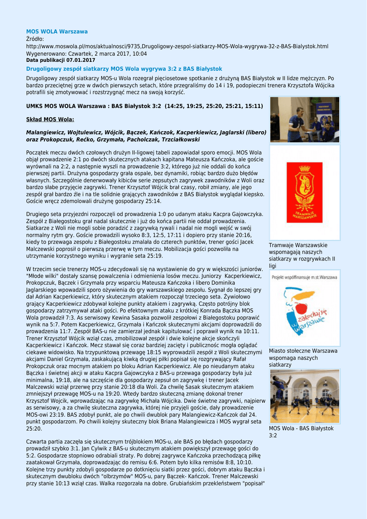 MOS WOLA Warszawa Źródło: http://www.moswola.pl/mos/aktualnosci/9735,Drugoligowy-zespol-siatkarzy-MOS-Wola-wygrywa-32-z-BAS-Bialystok.html Wygenerowano: Czwartek, 2 marca 2017, 10:04 Data publikacji 07.01.2017 Drugoligowy zespół siatkarzy MOS Wola wygrywa 3:2 z BAS Białystok Drugoligowy zespół siatkarzy MOS-u Wola rozegrał pięciosetowe spotkanie z drużyną BAS Białystok w II lidze mężczyzn. Po bardzo przeciętnej grze w dwóch pierwszych setach, które przegraliśmy do 14 i 19, podopieczni trenera Krzysztofa Wójcika potrafili się zmotywować i rozstrzygnąć mecz na swoją korzyść. UMKS MOS WOLA Warszawa : BAS Białystok 3:2 (14:25, 19:25, 25:20, 25:21, 15:11) Skład MOS Wola: Malangiewicz, Wojtulewicz, Wójcik, Bączek, Kańczok, Kacperkiewicz, Jaglarski (libero) oraz Prokopczuk, Rećko, Grzymała, Pacholczak, Trzciałkowski Początek meczu dwóch czołowych drużyn II-ligowej tabeli zapowiadał sporo emocji. MOS Wola objął prowadzenie 2:1 po dwóch skutecznych atakach kapitana Mateusza Kańczoka, ale goście wyrównali na 2:2, a następnie wyszli na prowadzenie 3:2, którego już nie oddali do końca pierwszej partii. Drużyna gospodarzy grała ospale, bez dynamiki, robiąc bardzo dużo błędów własnych. Szczególnie denerwowały kibiców serie zepsutych zagrywek zawodników z Woli oraz bardzo słabe przyjęcie zagrywki. Trener Krzysztof Wójcik brał czasy, robił zmiany, ale jego zespół grał bardzo źle i na tle solidnie grających zawodników z BAS Białystok wyglądał kiepsko. Goście wręcz zdemolowali drużynę gospodarzy 25:14. Drugiego seta przyjezdni rozpoczęli od prowadzenia 1:0 po udanym ataku Kacpra Gajowczyka. Zespół z Białegostoku grał nadal skutecznie i już do końca partii nie oddał prowadzenia. Siatkarze z Woli nie mogli sobie poradzić z zagrywką rywali i nadal nie mogli wejść w swój normalny rytm gry. Goście prowadzili wysoko 8:3, 12:5, 17:11 i dopiero przy stanie 20:16, kiedy to przewaga zespołu z Białegostoku zmalała do czterech punktów, trener gości Jacek Malczewski poprosił o pierwszą przerwę w tym meczu. Mobilizacja gości pozwoliła na utrzymanie korzystnego wyniku i wygranie seta 25:19. W trzecim secie trenerzy MOS-u zdecydowali się na wystawienie do gry w większości juniorów. "Młode wilki" dostały szansę powalczenia i odmienienia losów meczu. Juniorzy Kacperkiewicz, Prokopczuk, Bączek i Grzymała przy wsparciu Mateusza Kańczoka i libero Dominika Jaglarskiego wpowadzili sporo ożywienia do gry warszawskiego zespołu. Sygnał do lepszej gry dał Adrian Kacperkiewicz, który skutecznym atakiem rozpoczął trzeciego seta. Żywiołowo grający Kacperkiewicz zdobywał kolejne punkty atakiem i zagrywką. Często potrójny blok gospodarzy zatrzymywał ataki gości. Po efektownym ataku z krótkiej Konrada Bączka MOS Wola prowadził 7:3. As serwisowy Kewina Sasaka pozwolił zespołowi z Białegostoku poprawić wynik na 5:7. Potem Kacperkiewicz, Grzymała i Kańczok skutecznymi akcjami doprowadzili do prowadzenia 11:7. Zespół BAS-u nie zamierzał jednak kapitulować i poprawił wynik na 10:11. Trener Krzysztof Wójcik wziął czas, zmobilizował zespół i dwie kolejne akcje skończyli Kacperkiewicz i Kańczok. Mecz stawał się coraz bardziej zacięty i publicznośc mogła oglądać ciekawe widowisko. Na trzypunktową przewagę 18:15 wyprowadzili zespół z Woli skutecznymi akcjami Daniel Grzymała, zaskakującą kiwką drugiej piłki popisał się rozgrywający Rafał Prokopczuk oraz mocnym atakiem po bloku Adrian Kacperkiewicz. Ale po nieudanym ataku Bączka i świetnej akcji w ataku Kacpra Gajowczyka z BAS-u przewaga gospodarzy była już minimalna, 19:18, ale na szczęście dla gospodarzy zepsuł on zagrywkę i trener Jacek Malczewski wziął przerwę przy stanie 20:18 dla Woli. Za chwilę Sasak skutecznym atakiem zmniejszył przewagę MOS-u na 19:20. Wtedy bardzo skuteczną zmianę dokonał trener Krzysztof Wojcik, wprowadzając na zagrywkę Michała Wójcika. Dwie świetne zagrywki, najpierw as serwisowy, a za chwilę skuteczna zagrywka, której nie przyjęli goście, dały prowadzenie MOS-owi 23:19. BAS zdobył punkt, ale po chwili dwublok pary Malangiewicz-Kańczok dał 24. punkt gospodarzom. Po chwili kolejny skuteczny blok Briana Malangiewicza i MOS wygrał seta 25:20. Czwarta partia zaczęła się skutecznym trójblokiem MOS-u, ale BAS po błędach gospodarzy prowadził szybko 3:1. Jan Cylwik z BAS-u skutecznym atakiem powiększył przewagę gości do 5:2. Gospodarze stopniowo odrabiali straty. Po dobrej zagrywce Kańczoka przechodzącą piłkę zaatakował Grzymała, doprowadzając do remisu 6:6. Potem było kilka remisów 8:8, 10:10. Kolejne trzy punkty zdobyli gospodarze po dotknięciu siatki przez gości, dobrym ataku Bączka i skutecznym dwubloku dwóch "olbrzymów" MOS-u, pary Bączek- Kańczok. Trener Malczewski przy stanie 10:13 wziął czas. Walka rozgorzała na dobre. Grubiańskim przekleństwem "popisał" Tramwaje Warszawskie wspomagają naszych siatkarzy w rozgrywkach II ligi Miasto stołeczne Warszawa wspomaga naszych siatkarzy MOS Wola - BAS Białystok 3:2 się dobrze grający Kacperkiewicz, za co oczywiście dostał czerwoną kartkę i MOS prowadził już tylko 14:13. Walka była wyrównana do stanu 18:18. Trzy kolejne punkty zdobył MOS po ataku w aut Gajowczyka z BAS-u, punktowej zagrywce Grzymały i skutecznym ataku Kańczoka i było 21:18 dla MOS-u. Dwa punktowe ataki Kacperkiewicza, skuteczna akcja Małachowskiego z BAS-u i wynik na tablicy 23:20 dla siatkarzy z Woli. Atomowym atakiem nad blokiem gości Mateusz Kańczok zdobył 24. punkt. Skuteczną kiwką punkt zdobył Sasak dla gości, ale Małachowski zepsuł zagrywkę i MOS wygrał seta 25:21. O wyniku meczu zadecydował piąty set. Goście dwa piersze punkty podarowali gospodarzom psując zagrywki (Wiczkowski i Małachowski). Po dwóch dobrych akacjach punkty zdobył Kańczok atakiem oraz zagrywką i MOS prowadził 4:2. BAS 