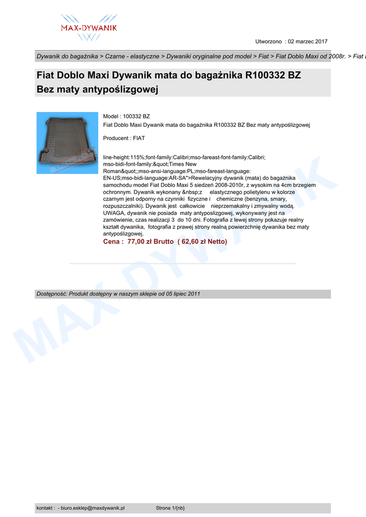 Utworzono : 02 marzec 2017 Dywanik do bagażnika > Czarne - elastyczne > Dywaniki oryginalne pod model > Fiat > Fiat Doblo Maxi od 2008r. > Fiat D Fiat Doblo Maxi Dywanik mata do bagażnika R100332 BZ Bez maty antypoślizgowej Model : 100332 BZ Fiat Doblo Maxi Dywanik mata do bagażnika R100332 BZ Bez maty antypoślizgowej Producent : FIAT line-height:115%;font-family:Calibri;mso-fareast-font-family:Calibri; mso-bidi-font-family:"Times New Roman";mso-ansi-language:PL;mso-fareast-language: EN-US;mso-bidi-language:AR-SA">Rewelacyjny dywanik (mata) do bagażnika samochodu model Fiat Doblo Maxi 5 siedzeń 2008-2010r, z wysokim na 4cm brzegiem ochronnym. Dywanik wykonany  z elastycznego polietylenu w kolorze czarnym jest odporny na czynniki fizyczne i chemiczne (benzyna, smary, rozpuszczalniki). Dywanik jest całkowicie nieprzemakalny i zmywalny wodą. UWAGA, dywanik nie posiada maty antyposlizgowej, wykonywany jest na zamówienie, czas realizacji 3 do 10 dni. Fotografia z lewej strony pokazuje realny kształt dywanika, fotografia z prawej strony realną powierzchnię dywanika bez maty antypoślizgowej. A W K I N Cena : 77,00 zł Brutto ( 62,60 zł Netto) Y D X A M Dostępność: Produkt dostępny w naszym sklepie od 05 lipiec 2011 kontakt : - [email protected] Strona 1/{nb}
