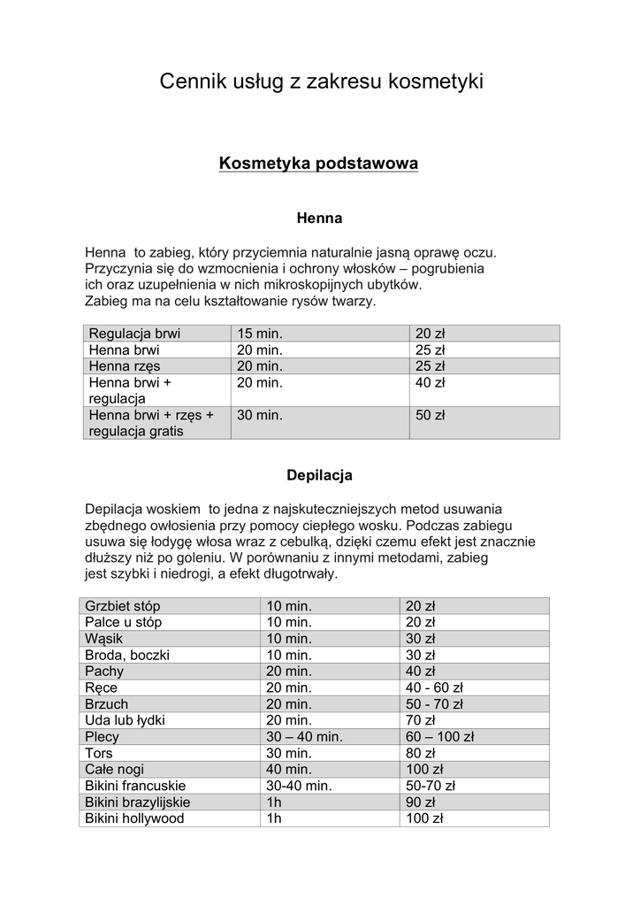 Cennik usług z zakresu kosmetyki Kosmetyka podstawowa Henna Henna to zabieg, który przyciemnia naturalnie jasną oprawę oczu. Przyczynia się do wzmocnienia i ochrony włosków – pogrubienia ich oraz uzupełnienia w nich mikroskopijnych ubytków. Zabieg ma na celu kształtowanie rysów twarzy. Regulacja brwi 15 min. 20 zł Henna brwi 20 min. 25 zł Henna rzęs 20 min. 25 zł Henna brwi + 20 min. 40 zł regulacja Henna brwi + rzęs + 30 min. 50 zł regulacja gratis Depilacja Depilacja woskiem to jedna z najskuteczniejszych metod usuwania zbędnego owłosienia przy pomocy ciepłego wosku. Podczas zabiegu usuwa się łodygę włosa wraz z cebulką, dzięki czemu efekt jest znacznie dłuższy niż po goleniu. W porównaniu z innymi metodami, zabieg jest szybki i niedrogi, a efekt długotrwały. Grzbiet stóp Palce u stóp Wąsik Broda, boczki Pachy Ręce Brzuch Uda lub łydki Plecy Tors Całe nogi Bikini francuskie Bikini brazylijskie Bikini hollywood 10 min. 10 min. 10 min. 10 min. 20 min. 20 min. 20 min. 20 min. 30 – 40 min. 30 min. 40 min. 30-40 min. 1h 1h 20 zł 20 zł 30 zł 30 zł 40 zł 40 - 60 zł 50 - 70 zł 70 zł 60 – 100 zł 80 zł 100 zł 50-70 zł 90 zł 100 zł Pięlęgnacja rąk i dłoni Piękna gładka skóra dłoni jest najlepszą wizytówką czlowieka. Niestety zajęcia dnia codziennege oraz czynniki atmosferyczne sprawiają, że skóra dłoni może zanadto się wysuszać i nie wyglądać dobrze, dlatego tak ważne jest odpowiednie pielęgnowanie i dobre nawilżenie skóry, aby powstrzymać nieubłagany upływ czasu. Pomalowanie paznokci Zdjęcie hybrydy Manicure biologiczny Manicure z malowaniem vinylowym Manicure japoński Manicure hybrydowy Manicure SPA (pelling, masaż, maska) 15 min. 30 min. 40 min. 60 min. 30 zł 30 zł 50 zł 60 zł 60 min. 1h 15 min. 1h 30 min. 80 zł 100 zł 110 – 130 zł* Pięlęgnacja stóp Pedicure to zabieg nie tylko pielęgnacyjno-upiększający, ale i leczniczy. Dzięki niemu stopy stają się aksamitnie gładkie i miękkie, a osoby z ich nadmierną potliwością mogą cieszyć się świeżością i komfortem. Polega on na usunięciu zrogowaciałego naskórka znajdującego się na stopach, pielęgnacji pękających i nadmiernie rogowaciejących pięt oraz nadaniu paznokciom kończyn dolnych odpowiedniej długości i kształtu. Pomaga zachować higienę i komfort stóp, a przy tym zadbać o ich estetyczny wygląd. Pedicure Pedicure z malowaniem vinylowym Pedicure hybrydowy Pedicure SPA (peeling, masaż, maska) 1h 1h 30 min. 100 – 120 zł 120 zł 1h 30 min. 1h 30 min 140 zł 140 – 160 zł Zabiegi na twarz i ciało Oczyszczanie Starzenie się skóry to nieunikniony proces, który dotyka każdego z nas, dlatego tak ważne jest, by podjąć odpowiednie działanie w celu niedopuszczenia do zestarzenia się skóry oraz spowolnienia tych procesów. Oczyszczanie twarzy Oczyszczanie twarzy+dekolt Oczyszczanie pleców 1h 30 min. 1h 30 min. 160 – 190 zł 200 zł 1h 200 zł Mikrodermabrazja diamentowa Bezinwazyjna metoda mechanicznego złuszczania naskórka. Do tego celu wykorzystuje się specjalną głowicę pokrytą skruszonymi diamentowymi kryształkami. Skóra po terapii jest widocznie młodsza, gładsza i nabiera zdrowego kolorytu. Mikrodermabrazja jest również niezastąpioną metodą w przypadku usuwania blizn powodując ich spłycenie oraz wygładzenie. Twarz (ampułka + masaż) Plecy (ampułka + masaż) Twarz,szyja, dekolt (ampułka + masaż) Seria mikrodermabrazji na twarz (3 zabiegi) Seria mikrodermabrazji na twarz (5 zabiegów) Mikrodermabrazja jako dodatek do zabiegów 1h 1h 1h 30 min. 200 zł 200 zł 250 zł - 550 zł - 850 zł - 50 zł Peeling kawitacyjny Bezinwazyjne i delikatne oczyszczanie skóry za pomocą wibracji ultradźwiękowej. Wzbogacony o mikromasaż, usprawnia przepływ krwi i limfy, poprawia dotlenienie komórkowe oraz zwiększa przenikanie substancji aktywnych w głąb skóry. Peeling kawitacyjny + sonoforeza/jonoforeza (ampułka + masaż) Twarz 1h Twarz, szyja, dekolt 1h 30 min. Kawitacja jako dodatek do zabiegu 150 zł 200 zł 40 zł Peeling chemiczny Peeling chemiczny to jeden z rodzajów zabiegów kosmetycznych z użyciem kwasów, których celem jest złuszczenie martwego naskórka i wygładzenie skóry. Zabieg polega na usunięciu defektów kosmetycznych i zmian chorobowych zlokalizowanych w obrębie naskórka, a czasem i skóry właściwej. Kwas migdałowy Kwas azelainowy Retix C Kwas cytrynowy 1h 1h 1h 1h 200 zł 220 zł 250 zł 330 zł Pielęgnacja twarzy i ciała Montibello Profesjonalne zabiegi pielęgnacyjne o udowodnionej skuteczności, dzięki którym doświadczysz piękna w wyjątkowy sposób. Produkty Montibello przeznaczone do pielęgnacji skóry zapewniają unikatowy styl i charakter oraz doskonale łączą wysoką skuteczność z bezpieczeństwem stosowania. Zabieg na ciało złuszczająco - nawilżający Zabieg na ciało redukujący Zabieg upiększający na biust Zabieg na twarz Genuine Cell Zabieg na twarz Oxygen Zabieg na twarz Arûde *zabieg z rytuałem 1h 15min. 260 zł/340 zł* 1h 45 min. 260 zł/340 zł* 1h 15min. 215 zł/300 zł* 1h 15min. 260 zł/340 zł 1h 15min. 1h 45 min. 215 zł/260 zł* 260 zł/340 zł* Wizaż Makijaż Makjaz dla wielu kobiet jest jak druga skóra. Piękny kolor cery, zaznaczone kości policzkowe, uwydatnione oczy i usta to efekt, do któreg dążymy. Niestety, wiele pań nie potrafi się malować, przez co zamiast przewidywanych rezultatów otrzymuje efekt maski. Wykonywanie makijażu to sztuka, dlatego nasi specjaliści wykonają i podpowiedzą jak krok po kroku wykonać idealny makijaz Makijaż dzienny Makijaż wieczorowy Makijaż ślubny Makijaż sesyjny Makijaż próbny+ślubny+sesyjny Makijaż wyjazdowy 1h 1h 1h 1h 3x1h od 130 zł od 130 zł od 150 zł od 150 zł od 380 zł - Indywidualna lekcja makijażu Grupowa lekcja makijażu (max 4 os.) 2h Cena ustalana indywidualnie 300 zł 4h 200 zł od osoby Makijaż permanentny brwi Makijaż permanentny brwi Ma
