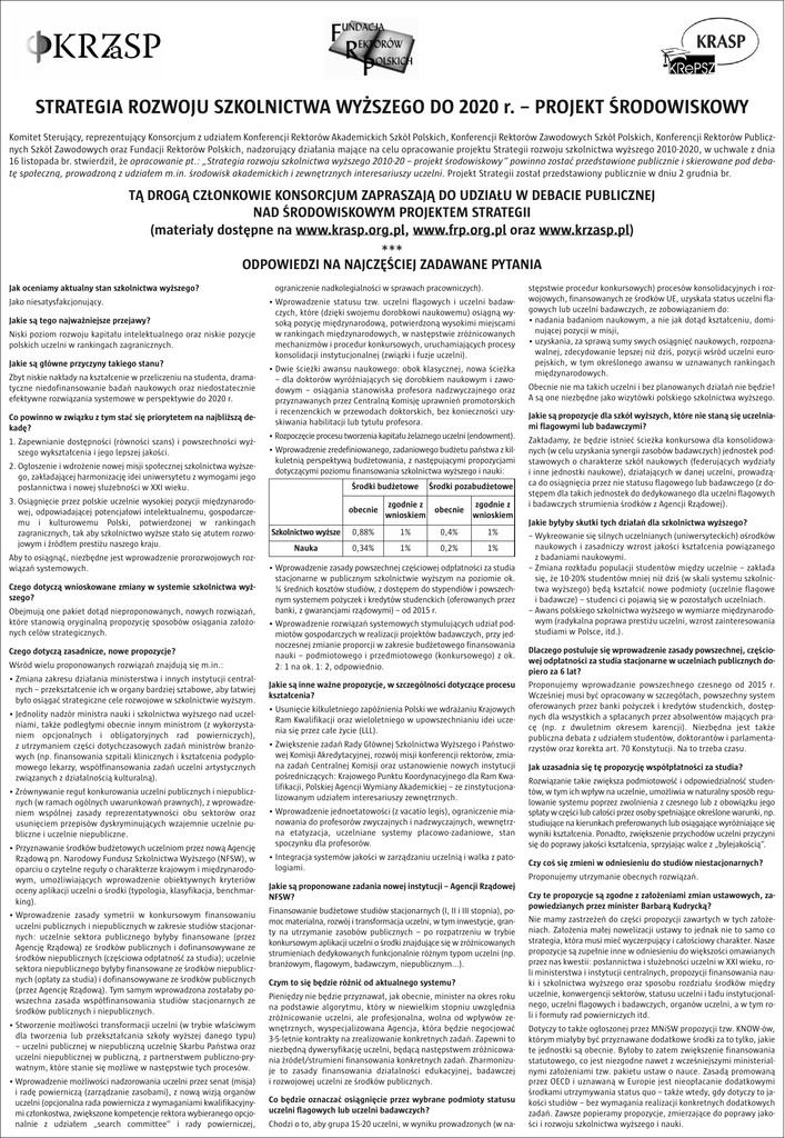 STRATEGIA ROZWOJU SZKOLNICTWA WYŻSZEGO DO 2020 r. – PROJEKT ŚRODOWISKOWY Komitet Sterujący, reprezentujący Konsorcjum z udziałem Konferencji Rektorów Akademickich Szkół Polskich, Konferencji Rektorów Zawodowych Szkół Polskich, Konferencji Rektorów Publicznych Szkół Zawodowych oraz Fundacji Rektorów Polskich, nadzorujący działania mające na celu opracowanie projektu Strategii rozwoju szkolnictwa wyższego 2010-2020, w uchwale z dnia 16 listopada br. stwierdził, że opracowanie pt.: „Strategia rozwoju szkolnictwa wyższego 2010-20 – projekt środowiskowy” powinno zostać przedstawione publicznie i skierowane pod debatę społeczną, prowadzoną z udziałem m.in. środowisk akademickich i zewnętrznych interesariuszy uczelni. Projekt Strategii został przedstawiony publicznie w dniu 2 grudnia br. TĄ DROGĄ CZŁONKOWIE KONSORCJUM ZAPRASZAJĄ DO UDZIAŁU W DEBACIE PUBLICZNEJ NAD ŚRODOWISKOWYM PROJEKTEM STRATEGII (materiały dostępne na www.krasp.org.pl, www.frp.org.pl oraz www.krzasp.pl) *** ODPOWIEDZI NA NAJCZĘŚCIEJ ZADAWANE PYTANIA Jak oceniamy aktualny stan szkolnictwa wyższego? Jako niesatysfakcjonujący. Jakie są tego najważniejsze przejawy? Niski poziom rozwoju kapitału intelektualnego oraz niskie pozycje polskich uczelni w rankingach zagranicznych. Jakie są główne przyczyny takiego stanu? Zbyt niskie nakłady na kształcenie w przeliczeniu na studenta, dramatyczne niedofinansowanie badań naukowych oraz niedostatecznie efektywne rozwiązania systemowe w perspektywie do 2020 r. Co powinno w związku z tym stać się priorytetem na najbliższą dekadę? 1. Zapewnianie dostępności (równości szans) i powszechności wyższego wykształcenia i jego lepszej jakości. 2. Ogłoszenie i wdrożenie nowej misji społecznej szkolnictwa wyższego, zakładającej harmonizację idei uniwersytetu z wymogami jego posłannictwa i nowej służebności w XXI wieku. 3. Osiągnięcie przez polskie uczelnie wysokiej pozycji międzynarodowej, odpowiadającej potencjałowi intelektualnemu, gospodarczemu i kulturowemu Polski, potwierdzonej w rankingach zagranicznych, tak aby szkolnictwo wyższe stało się atutem rozwojowym i źródłem prestiżu naszego kraju. Aby to osiągnąć, niezbędne jest wprowadzenie prorozwojowych rozwiązań systemowych. Czego dotyczą wnioskowane zmiany w systemie szkolnictwa wyższego? Obejmują one pakiet dotąd nieproponowanych, nowych rozwiązań, które stanowią oryginalną propozycję sposobów osiągania założonych celów strategicznych. Czego dotyczą zasadnicze, nowe propozycje? Wśród wielu proponowanych rozwiązań znajdują się m.in.: • Zmiana zakresu działania ministerstwa i innych instytucji centralnych – przekształcenie ich w organy bardziej sztabowe, aby łatwiej było osiągać strategiczne cele rozwojowe w szkolnictwie wyższym. • Jednolity nadzór ministra nauki i szkolnictwa wyższego nad uczelniami, także podległymi obecnie innym ministrom (z wykorzystaniem opcjonalnych i obligatoryjnych rad powierniczych), z utrzymaniem części dotychczasowych zadań ministrów branżowych (np. finansowania szpitali klinicznych i kształcenia podyplomowego lekarzy, współfinansowania zadań uczelni artystycznych związanych z działalnością kulturalną). • Zrównywanie reguł konkurowania uczelni publicznych i niepublicznych (w ramach ogólnych uwarunkowań prawnych), z wprowadzeniem wspólnej zasady reprezentatywności obu sektorów oraz usunięciem przepisów dyskryminujących wzajemnie uczelnie publiczne i uczelnie niepubliczne. • Przyznawanie środków budżetowych uczelniom przez nową Agencję Rządową pn. Narodowy Fundusz Szkolnictwa Wyższego (NFSW), w oparciu o czytelne reguły o charakterze krajowym i międzynarodowym, umożliwiających wprowadzenie obiektywnych kryteriów oceny aplikacji uczelni o środki (typologia, klasyfikacja, benchmarking). • Wprowadzenie zasady symetrii w konkursowym finansowaniu uczelni publicznych i niepublicznych w zakresie studiów stacjonarnych: uczelnie sektora publicznego byłyby finansowane (przez Agencję Rządową) ze środków publicznych i dofinansowywane ze środków niepublicznych (częściowa odpłatność za studia); uczelnie sektora niepublicznego byłyby finansowane ze środków niepublicznych (opłaty za studia) i dofinansowywane ze środków publicznych (przez Agencję Rządową). Tym samym wprowadzona zostałaby powszechna zasada współfinansowania studiów stacjonarnych ze środków publicznych i niepublicznych. • Stworzenie możliwości transformacji uczelni (w trybie właściwym dla tworzenia lub przekształcania szkoły wyższej danego typu) – uczelni publicznej w niepubliczną uczelnię Skarbu Państwa oraz uczelni niepublicznej w publiczną, z partnerstwem publiczno-prywatnym, które stanie się możliwe w następstwie tych procesów. • Wprowadzenie możliwości nadzorowania uczelni przez senat (misja) i radę powierniczą (zarządzanie zasobami), z nową wizją organów uczelni (opcjonalna rada powiernicza z wymaganiami kwalifikacyjnymi członkostwa, zwiększone kompetencje rektora wybieranego opcjonalnie z udziałem „search committee” i rady powierniczej, ograniczenie nadkolegialności w sprawach pracowniczych). • Wprowadzenie statusu tzw. uczelni flagowych i uczelni badawczych, które (dzięki swojemu dorobkowi naukowemu) osiągną wysoką pozycję międzynarodową, potwierdzoną wysokimi miejscami w rankingach międzynarodowych, w następstwie zróżnicowanych mechanizmów i procedur konkursowych, uruchamiających procesy konsolidacji instytucjonalnej (związki i fuzje uczelni). • Dwie ścieżki awansu naukowego: obok klasycznej, nowa ścieżka – dla doktorów wyróżniających się dorobkiem naukowym i zawodowym – osiągania stanowiska profesora nadzwyczajnego oraz przyznawanych przez Centralną Komisję uprawnień promotorskich i recenzenckich w przewodach doktorskich, bez konieczności uzyskiwania habilitacji lub tytułu prof