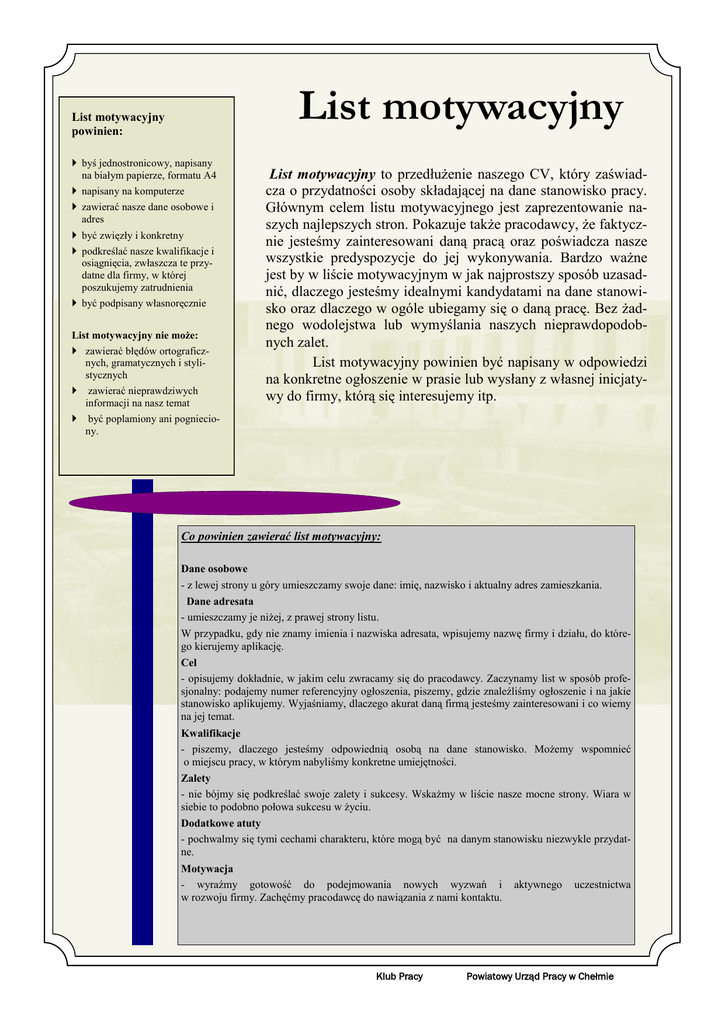 List motywacyjny List motywacyjny powinien: byś jednostronicowy, napisany na białym papierze, formatu A4 napisany na komputerze zawierać nasze dane osobowe i adres być zwięzły i konkretny podkreślać nasze kwalifikacje i osiągnięcia, zwłaszcza te przydatne dla firmy, w której poszukujemy zatrudnienia być podpisany własnoręcznie List motywacyjny nie może: zawierać błędów ortograficznych, gramatycznych i stylistycznych zawierać nieprawdziwych informacji na nasz temat być poplamiony ani pognieciony. List motywacyjny to przedłużenie naszego CV, który zaświadcza o przydatności osoby składającej na dane stanowisko pracy. Głównym celem listu motywacyjnego jest zaprezentowanie naszych najlepszych stron. Pokazuje także pracodawcy, że faktycznie jesteśmy zainteresowani daną pracą oraz poświadcza nasze wszystkie predyspozycje do jej wykonywania. Bardzo ważne jest by w liście motywacyjnym w jak najprostszy sposób uzasadnić, dlaczego jesteśmy idealnymi kandydatami na dane stanowisko oraz dlaczego w ogóle ubiegamy się o daną pracę. Bez żadnego wodolejstwa lub wymyślania naszych nieprawdopodobnych zalet. List motywacyjny powinien być napisany w odpowiedzi na konkretne ogłoszenie w prasie lub wysłany z własnej inicjatywy do firmy, którą się interesujemy itp. Co powinien zawierać list motywacyjny: Dane osobowe - z lewej strony u góry umieszczamy swoje dane: imię, nazwisko i aktualny adres zamieszkania. Dane adresata - umieszczamy je niżej, z prawej strony listu. W przypadku, gdy nie znamy imienia i nazwiska adresata, wpisujemy nazwę firmy i działu, do którego kierujemy aplikację. Cel - opisujemy dokładnie, w jakim celu zwracamy się do pracodawcy. Zaczynamy list w sposób profesjonalny: podajemy numer referencyjny ogłoszenia, piszemy, gdzie znaleźliśmy ogłoszenie i na jakie stanowisko aplikujemy. Wyjaśniamy, dlaczego akurat daną firmą jesteśmy zainteresowani i co wiemy na jej temat. Kwalifikacje - piszemy, dlaczego jesteśmy odpowiednią osobą na dane stanowisko. Możemy wspomnieć o miejscu pracy, w którym nabyliśmy konkretne umiejętności. Zalety - nie bójmy się podkreślać swoje zalety i sukcesy. Wskażmy w liście nasze mocne strony. Wiara w siebie to podobno połowa sukcesu w życiu. Dodatkowe atuty - pochwalmy się tymi cechami charakteru, które mogą być na danym stanowisku niezwykle przydatne. Motywacja - wyraźmy gotowość do podejmowania nowych wyzwań i w rozwoju firmy. Zachęćmy pracodawcę do nawiązania z nami kontaktu. Klub Pracy aktywnego uczestnictwa Powiatowy Urząd Pracy w Chełmie