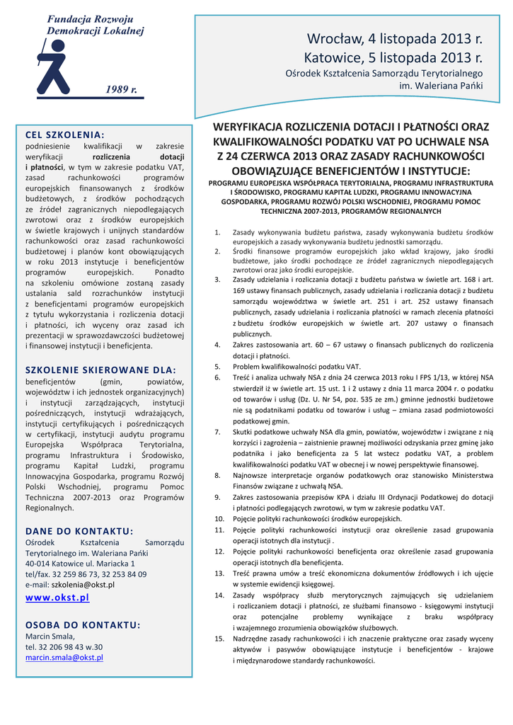 RozwiązaniaWrocław, informatyczne 4 listopada 2013 r. Katowice, 5 listopada 2013 r. Ośrodek Kształcenia Samorządu Terytorialnego im. Waleriana Pańki CEL SZKOLENIA: podniesienie kwalifikacji w zakresie weryfikacji rozliczenia dotacji i płatności, w tym w zakresie podatku VAT, zasad rachunkowości programów europejskich finansowanych z środków budżetowych, z środków pochodzących ze źródeł zagranicznych niepodlegających zwrotowi oraz z środków europejskich w świetle krajowych i unijnych standardów rachunkowości oraz zasad rachunkowości budżetowej i planów kont obowiązujących w roku 2013 instytucje i beneficjentów programów europejskich. Ponadto na szkoleniu omówione zostaną zasady ustalania sald rozrachunków instytucji z beneficjentami programów europejskich z tytułu wykorzystania i rozliczenia dotacji i płatności, ich wyceny oraz zasad ich prezentacji w sprawozdawczości budżetowej i finansowej instytucji i beneficjenta. SZKOLENIE SKIEROWANE D LA: beneficjentów (gmin, powiatów, województw i ich jednostek organizacyjnych) i instytucji zarządzających, instytucji pośredniczących, instytucji wdrażających, instytucji certyfikujących i pośredniczących w certyfikacji, instytucji audytu programu Europejska Współpraca Terytorialna, programu Infrastruktura i Środowisko, programu Kapitał Ludzki, programu Innowacyjna Gospodarka, programu Rozwój Polski Wschodniej, programu Pomoc Techniczna 2007-2013 oraz Programów Regionalnych. DANE DO KONTAKTU: Ośrodek Kształcenia Samorządu Terytorialnego im. Waleriana Pańki 40-014 Katowice ul. Mariacka 1 tel/fax. 32 259 86 73, 32 253 84 09 e-mail: [email protected] www.okst.pl WERYFIKACJA ROZLICZENIA DOTACJI I PŁATNOŚCI ORAZ KWALIFIKOWALNOŚCI PODATKU VAT PO UCHWALE NSA Z 24 CZERWCA 2013 ORAZ ZASADY RACHUNKOWOŚCI OBOWIĄZUJĄCE BENEFICJENTÓW I INSTYTUCJE: PROGRAMU EUROPEJSKA WSPÓŁPRACA TERYTORIALNA, PROGRAMU INFRASTRUKTURA I ŚRODOWISKO, PROGRAMU KAPITAŁ LUDZKI, PROGRAMU INNOWACYJNA GOSPODARKA, PROGRAMU ROZWÓJ POLSKI WSCHODNIEJ, PROGRAMU POMOC TECHNICZNA 2007-2013, PROGRAMÓW REGIONALNYCH 1. 2. 3. 4. 5. 6. 7. 8. 9. 10. 11. 12. 13. 14. OSOBA DO KONTAKTU: Marcin Smala, tel. 32 206 98 43 w.30 [email protected] 15. Zasady wykonywania budżetu państwa, zasady wykonywania budżetu środków europejskich a zasady wykonywania budżetu jednostki samorządu. Środki finansowe programów europejskich jako wkład krajowy, jako środki budżetowe, jako środki pochodzące ze źródeł zagranicznych niepodlegających zwrotowi oraz jako środki europejskie. Zasady udzielania i rozliczania dotacji z budżetu państwa w świetle art. 168 i art. 169 ustawy finansach publicznych, zasady udzielania i rozliczania dotacji z budżetu samorządu województwa w świetle art. 251 i art. 252 ustawy finansach publicznych, zasady udzielania i rozliczania płatności w ramach zlecenia płatności z budżetu środków europejskich w świetle art. 207 ustawy o finansach publicznych. Zakres zastosowania art. 60 – 67 ustawy o finansach publicznych do rozliczenia dotacji i płatności. Problem kwalifikowalności podatku VAT. Treść i analiza uchwały NSA z dnia 24 czerwca 2013 roku I FPS 1/13, w której NSA stwierdził iż w świetle art. 15 ust. 1 i 2 ustawy z dnia 11 marca 2004 r. o podatku od towarów i usług (Dz. U. Nr 54, poz. 535 ze zm.) gminne jednostki budżetowe nie są podatnikami podatku od towarów i usług – zmiana zasad podmiotowości podatkowej gmin. Skutki podatkowe uchwały NSA dla gmin, powiatów, województw i związane z nią korzyści i zagrożenia – zaistnienie prawnej możliwości odzyskania przez gminę jako podatnika i jako beneficjenta za 5 lat wstecz podatku VAT, a problem kwalifikowalności podatku VAT w obecnej i w nowej perspektywie finansowej. Najnowsze interpretacje organów podatkowych oraz stanowisko Ministerstwa Finansów związane z uchwałą NSA. Zakres zastosowania przepisów KPA i działu III Ordynacji Podatkowej do dotacji i płatności podlegających zwrotowi, w tym w zakresie podatku VAT. Pojęcie polityki rachunkowości środków europejskich. Pojęcie polityki rachunkowości instytucji oraz określenie zasad grupowania operacji istotnych dla instytucji . Pojęcie polityki rachunkowości beneficjenta oraz określenie zasad grupowania operacji istotnych dla beneficjenta. Treść prawna umów a treść ekonomiczna dokumentów źródłowych i ich ujęcie w systemie ewidencji księgowej. Zasady współpracy służb merytorycznych zajmujących się udzielaniem i rozliczaniem dotacji i płatności, ze służbami finansowo - księgowymi instytucji oraz potencjalne problemy wynikające z braku współpracy i wzajemnego zrozumienia obowiązków służbowych. Nadrzędne zasady rachunkowości i ich znaczenie praktyczne oraz zasady wyceny aktywów i pasywów obowiązujące instytucje i beneficjentów - krajowe i międzynarodowe standardy rachunkowości. Wrocław, 4.11.2013r., g. 10.00-15.00 (zgłoszenie należy października 2013r.) przesłać do 16. Specyfika zasad rachunkowości budżetowej - podział na rachunkowość organu finansowego (budżetu), rachunkowość jednostki wykonującej budżet, rachunkowość organu podatkowego oraz ich zastosowanie w instytucjach i u beneficjentów. 17. Wzory księgowań środków na wydatki, dotacji, zleceń płatności i ich rozliczenia będącej państwową jednostką budżetową. 18. Wzory księgowań środków na wydatki, dotacji, zleceń płatności i ich rozliczenia w księgach beneficjenta będącego samorządową jednostką budżetową lub samorządowym zakładem budżetowym. 19. Wzory księgowań środków na wydatki, dotacji, zleceń płatności i ich rozliczenia w księgach beneficjenta niebędącego ani państwową, ani samorządową jednostką budżetową. 20. Zasady sporządzania sprawozdawczości budżetowej, sprawozdawczości zadaniowej, sprawozdawczości z operacji finansowych oraz sprawozdawczości finansowej przez instytucje i beneficjen