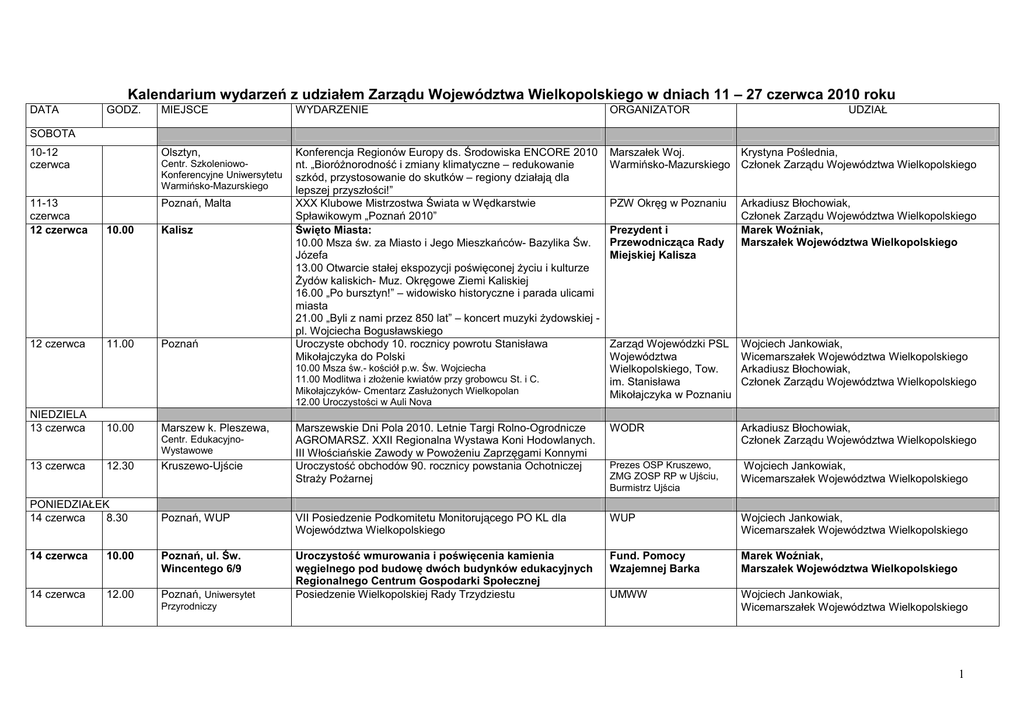 Kalendarium wydarzeń z udziałem Zarządu Województwa Wielkopolskiego w dniach 11 – 27 czerwca 2010 roku DATA GODZ. MIEJSCE WYDARZENIE ORGANIZATOR UDZIAŁ 10-12 czerwca Olsztyn, Marszałek Woj. Krystyna Poślednia, Warmińsko-Mazurskiego Członek Zarządu Województwa Wielkopolskiego 11-13 czerwca 12 czerwca Poznań, Malta 10.00 Kalisz 12 czerwca 11.00 Poznań Konferencja Regionów Europy ds. Środowiska ENCORE 2010 nt. „BioróŜnorodność i zmiany klimatyczne – redukowanie szkód, przystosowanie do skutków – regiony działają dla lepszej przyszłości!” XXX Klubowe Mistrzostwa Świata w Wędkarstwie Spławikowym „Poznań 2010” Święto Miasta: 10.00 Msza św. za Miasto i Jego Mieszkańców- Bazylika Św. Józefa 13.00 Otwarcie stałej ekspozycji poświęconej Ŝyciu i kulturze śydów kaliskich- Muz. Okręgowe Ziemi Kaliskiej 16.00 „Po bursztyn!” – widowisko historyczne i parada ulicami miasta 21.00 „Byli z nami przez 850 lat” – koncert muzyki Ŝydowskiej pl. Wojciecha Bogusławskiego Uroczyste obchody 10. rocznicy powrotu Stanisława Mikołajczyka do Polski SOBOTA Centr. SzkoleniowoKonferencyjne Uniwersytetu Warmińsko-Mazurskiego 10.00 Wojciech Jankowiak, Wicemarszałek Województwa Wielkopolskiego Arkadiusz Błochowiak, Członek Zarządu Województwa Wielkopolskiego Marszewskie Dni Pola 2010. Letnie Targi Rolno-Ogrodnicze AGROMARSZ. XXII Regionalna Wystawa Koni Hodowlanych. III Włościańskie Zawody w PowoŜeniu Zaprzęgami Konnymi Uroczystość obchodów 90. rocznicy powstania Ochotniczej StraŜy PoŜarnej WODR Arkadiusz Błochowiak, Członek Zarządu Województwa Wielkopolskiego Prezes OSP Kruszewo, ZMG ZOSP RP w Ujściu, Burmistrz Ujścia Wojciech Jankowiak, Wicemarszałek Województwa Wielkopolskiego Poznań, WUP VII Posiedzenie Podkomitetu Monitorującego PO KL dla Województwa Wielkopolskiego WUP Wojciech Jankowiak, Wicemarszałek Województwa Wielkopolskiego Uroczystość wmurowania i poświęcenia kamienia węgielnego pod budowę dwóch budynków edukacyjnych Regionalnego Centrum Gospodarki Społecznej Posiedzenie Wielkopolskiej Rady Trzydziestu Fund. Pomocy Wzajemnej Barka Marek Woźniak, Marszałek Województwa Wielkopolskiego UMWW Wojciech Jankowiak, Wicemarszałek Województwa Wielkopolskiego Marszew k. Pleszewa, Centr. EdukacyjnoWystawowe 13 czerwca 12.30 PONIEDZIAŁEK 14 czerwca 8.30 Prezydent i Przewodnicząca Rady Miejskiej Kalisza Arkadiusz Błochowiak, Członek Zarządu Województwa Wielkopolskiego Marek Woźniak, Marszałek Województwa Wielkopolskiego Zarząd Wojewódzki PSL Województwa Wielkopolskiego, Tow. im. Stanisława Mikołajczyka w Poznaniu 10.00 Msza św.- kościół p.w. Św. Wojciecha 11.00 Modlitwa i złoŜenie kwiatów przy grobowcu St. i C. Mikołajczyków- Cmentarz ZasłuŜonych Wielkopolan 12.00 Uroczystości w Auli Nova NIEDZIELA 13 czerwca PZW Okręg w Poznaniu Kruszewo-Ujście 14 czerwca 10.00 Poznań, ul. Św. Wincentego 6/9 14 czerwca 12.00 Poznań, Uniwersytet Przyrodniczy 1 Leszek Wojtasiak, Wicemarszałek Województwa Wielkopolskiego Arkadiusz Błochowiak, Członek Zarządu Województwa Wielkopolskiego Wójt. Gm. Kraszewice, Dyr. Szkoły Podst. w Kuźnicy Grabowskiej Reg. Centrum Krystyna Poślednia, Krwiodawstwa i Członek Zarządu Województwa Wielkopolskiego Krwiolecznictwa w Poznaniu 14 czerwca 14.00 Kuźnica Grabowska Oddanie do uŜytkowania inwestycji „Przebudowa dworu szlacheckiego w Kuźnicy Grabowskiej na cele sali sportowej” 14 czerwca 16.00 Poznań, Ogród Botaniczny UAM Obchody Światowego Dnia Krwiodawcy WTOREK 15 czerwca 11.45 Konin, WSZ w Koninie 11.45 Briefing prasowy 12.00 Otwarcie nowego budynku Wojewódzkiego Szpitala Zespolonego w Koninie Wojewódzki Szpital Zespolony w Koninie 15 czerwca 17.00 Sypniewo k. Margonina Uroczyste Posiedzenie Zarządu Stowarzyszenia Gmin i Powiatów Nadnoteckich z okazji XX-lecia powstania Stowarzyszenie Gmin i Powiatów Nadnoteckich 16 czerwca 11.00 Warszawa, UKE Spotkanie z Panią Anną StróŜyńską, Prezesem UKE UKE 16 czerwca 12.00 Warszawa, MRR 16 czerwca 13.00 Ministerstwo Gospodarki 16 czerwca 16.00 Warszawa, Min. Gospodarki Września Spotkanie Marszałków Województw z ElŜbietą Bieńkowską, Minister Rozwoju Regionalnego w sprawie strategii rozwoju Polski Zachodniej Spotkanie z Hanną Trojanowską - Pełnomocnikiem Rządu ds. Energetyki Jądrowej Uroczystość zakończenia roku szkolnego w Liceum Ogólnokształcącym we Wrześni Leszek Wojtasiak, Wicemarszałek Województwa Wielkopolskiego Marek Woźniak, Marszałek Województwa Wielkopolskiego Leszek Wojtasiak, Wicemarszałek Województwa Wielkopolskiego Krystyna Poślednia, Członek Zarządu Województwa Wielkopolskiego CZWARTEK 17 czerwca 10.00 17 czerwca 11.00 17 czerwca Marek Woźniak, Marszałek Województwa Wielkopolskiego Krystyna Poślednia, Członek Zarządu Województwa Wielkopolskiego Arkadiusz Błochowiak, Członek Zarządu Województwa Wielkopolskiego ŚRODA LO we Wrześni Ślesin, M-G Ośrodek Kultury Poznań, WUW, s. 210 Seminarium „Inicjatywy lokalne na rzecz podnoszenia poziomu Poseł na Sejm RP aktywności zawodowej na obszarach wiejskich” Tomasz Nowak Komisja Strategii Rozwoju Regionalnego i Współpracy SWW Międzynarodowej 12.00 Sterdyń 17 czerwca 12.00 Poznań, ul. Wielka 10 II Posiedzenie Konwentu Marszałków Województw RP Mazowsze 2010 Uroczyste odsłonięcie tablicy upamiętniającej działalność Artura Gustowskiego – kupca, załoŜyciela Stow. Kupców 18 czerwca 9.15 Poznań, Hotel Andersia Wyjazdowe posiedzenie Grupy Europejskiej Partii Ludowej w Komitecie Regionów Krystyna Poślednia, Członek Zarządu Województwa Wielkopolskiego Wojciech Jankowiak, Wicemarszałek Województwa Wielkopolskiego Leszek Wojtasiak, Wicemarszałek Województwa Wielkopolskiego Marszałek Woj. Arkadiusz Błochowiak, Mazowieckiego Członek Zarządu Województwa Wielkopolskiego Wlkp. Zrzeszenie Handlu Wojciech Jankowiak, i Usług w Poznaniu Wicemarszałek Województwa Wielkopols