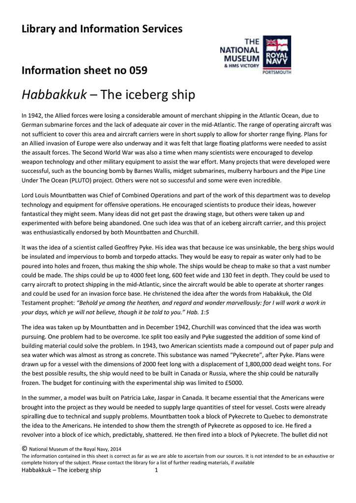 Library and Information Services Information sheet no 059 Habbakkuk – The iceberg ship In 1942, the Allied forces were losing a considerable amount of merchant shipping in the Atlantic Ocean, due to German submarine forces and the lack of adequate air cover in the mid-Atlantic. The range of operating aircraft was not sufficient to cover this area and aircraft carriers were in short supply to allow for shorter range flying. Plans for an Allied invasion of Europe were also underway and it was felt that large floating platforms were needed to assist the assault forces. The Second World War was also a time when many scientists were encouraged to develop weapon technology and other military equipment to assist the war effort. Many projects that were developed were successful, such as the bouncing bomb by Barnes Wallis, midget submarines, mulberry harbours and the Pipe Line Under The Ocean (PLUTO) project. Others were not so successful and some were even incredible. Lord Louis Mountbatten was Chief of Combined Operations and part of the work of this department was to develop technology and equipment for offensive operations. He encouraged scientists to produce their ideas, however fantastical they might seem. Many ideas did not get past the drawing stage, but others were taken up and experimented with before being abandoned. One such idea was that of an iceberg aircraft carrier, and this project was enthusiastically endorsed by both Mountbatten and Churchill. It was the idea of a scientist called Geoffrey Pyke. His idea was that because ice was unsinkable, the berg ships would be insulated and impervious to bomb and torpedo attacks. They would be easy to repair as water only had to be poured into holes and frozen, thus making the ship whole. The ships would be cheap to make so that a vast number could be made. The ships could be up to 4000 feet long, 600 feet wide and 130 feet in depth. They could be used to carry aircraft to protect shipping in the mid-Atlantic, since the aircraft would be able to operate at shorter ranges and could be used for an invasion force base. He christened the idea after the words from Habakkuk, the Old Testament prophet: “Behold ye among the heathen, and regard and wonder marvellously: for I will work a work in your days, which ye will not believe, though it be told to you.” Hab. 1:5 The idea was taken up by Mountbatten and in December 1942, Churchill was convinced that the idea was worth pursuing. One problem had to be overcome. Ice split too easily and Pyke suggested the addition of some kind of building material could solve the problem. In 1943, two American scientists made a compound out of paper pulp and sea water which was almost as strong as concrete. This substance was named “Pykecrete”, after Pyke. Plans were drawn up for a vessel with the dimensions of 2000 feet long with a displacement of 1,800,000 dead weight tons. For the best possible results, the ship would need to be built in Canada or Russia, where the ship could be naturally frozen. The budget for continuing with the experimental ship was limited to £5000. In the summer, a model was built on Patricia Lake, Jaspar in Canada. It became essential that the Americans were brought into the project as they would be needed to supply large quantities of steel for vessel. Costs were already spiralling due to technical and supply problems. Mountbatten took a block of Pykecrete to Quebec to demonstrate the idea to the Americans. He intended to show them the strength of Pykecrete as opposed to ice. He fired a revolver into a block of ice which, predictably, shattered. He then fired into a block of Pykecrete. The bullet did not © National Museum of the Royal Navy, 2014 The information contained in this sheet is correct as far as we are able to ascertain from our sources. It is not intended to be an exhaustive or complete history of the subject. Please contact the library for a list of further reading materials, if available Habbakkuk – The iceberg ship 1 Library and Information Services Information sheet no 059 penetrate the block, rather it ricocheted off the ice, and unfortunately struck the American Chief of Naval Operations in the process, but without injury. The Americans were not convinced about the project. They felt that due to technical problems, the ice ships would not be ready until 1945, and by this time, the conventional carrier fleet would be large enough to make the need for ice aircraft carriers obsolete. Churchill also gave up on the project when he realised that the carriers would cost over £6m. The model in Patricia Lake was “scuttled” in 1943 by removing all the machinery that had been used and leaving it to sink in place. In the 1970’s remains of the model were found and studied and in 1989, a plaque to commemorate the unusual ship was placed on the lake’s shore. © National Museum of the Royal Navy, 2014 The information contained in this sheet is correct as far as we are able to ascertain from our sources. It is not intended to be an exhaustive or complete history of the subject. Please contact the library for a list of further reading materials, if available Habbakkuk – The iceberg ship 2