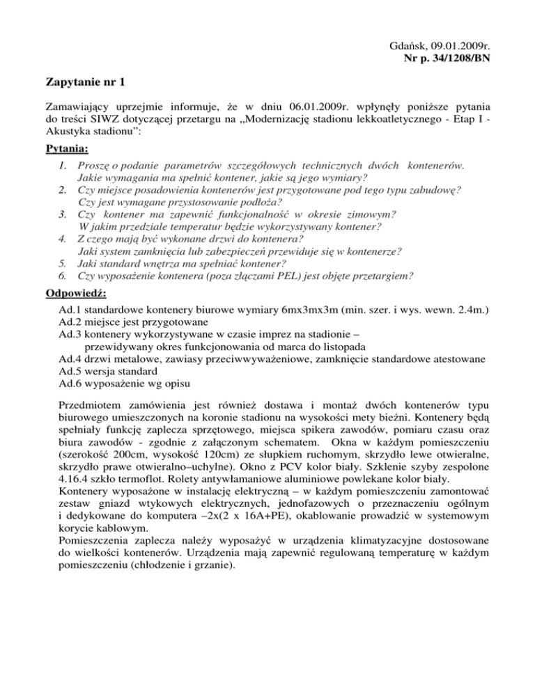 Gdańsk, 09.01.2009r. Nr p. 34/1208/BN Zapytanie nr 1 Zamawiający uprzejmie informuje, Ŝe w dniu 06.01.2009r. wpłynęły poniŜsze pytania do treści SIWZ dotyczącej przetargu na „Modernizację stadionu lekkoatletycznego - Etap I Akustyka stadionu”: Pytania: 1. Proszę o podanie parametrów szczegółowych technicznych dwóch kontenerów. Jakie wymagania ma spełnić kontener, jakie są jego wymiary? 2. Czy miejsce posadowienia kontenerów jest przygotowane pod tego typu zabudowę? Czy jest wymagane przystosowanie podłoŜa? 3. Czy kontener ma zapewnić funkcjonalność w okresie zimowym? W jakim przedziale temperatur będzie wykorzystywany kontener? 4. Z czego mają być wykonane drzwi do kontenera? Jaki system zamknięcia lub zabezpieczeń przewiduje się w kontenerze? 5. Jaki standard wnętrza ma spełniać kontener? 6. Czy wyposaŜenie kontenera (poza złączami PEL) jest objęte przetargiem? Odpowiedź: Ad.1 standardowe kontenery biurowe wymiary 6mx3mx3m (min. szer. i wys. wewn. 2.4m.) Ad.2 miejsce jest przygotowane Ad.3 kontenery wykorzystywane w czasie imprez na stadionie – przewidywany okres funkcjonowania od marca do listopada Ad.4 drzwi metalowe, zawiasy przeciwwywaŜeniowe, zamknięcie standardowe atestowane Ad.5 wersja standard Ad.6 wyposaŜenie wg opisu Przedmiotem zamówienia jest równieŜ dostawa i montaŜ dwóch kontenerów typu biurowego umieszczonych na koronie stadionu na wysokości mety bieŜni. Kontenery będą spełniały funkcję zaplecza sprzętowego, miejsca spikera zawodów, pomiaru czasu oraz biura zawodów - zgodnie z załączonym schematem. Okna w kaŜdym pomieszczeniu (szerokość 200cm, wysokość 120cm) ze słupkiem ruchomym, skrzydło lewe otwieralne, skrzydło prawe otwieralno–uchylne). Okno z PCV kolor biały. Szklenie szyby zespolone 4.16.4 szkło termoflot. Rolety antywłamaniowe aluminiowe powlekane kolor biały. Kontenery wyposaŜone w instalację elektryczną – w kaŜdym pomieszczeniu zamontować zestaw gniazd wtykowych elektrycznych, jednofazowych o przeznaczeniu ogólnym i dedykowane do komputera –2x(2 x 16A+PE), okablowanie prowadzić w systemowym korycie kablowym. Pomieszczenia zaplecza naleŜy wyposaŜyć w urządzenia klimatyzacyjne dostosowane do wielkości kontenerów. Urządzenia mają zapewnić regulowaną temperaturę w kaŜdym pomieszczeniu (chłodzenie i grzanie).