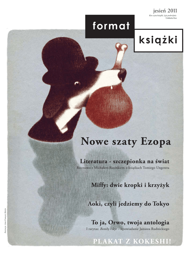 jesień 2011 f o r ma t Kto czyta książki, żyje podwójnie. Umberto Eco k s ią ż k i Nowe szaty Ezopa Literatura - szczepionka na świat Rozmowa z Michałem Rusinkiem o książkach Tomiego Ungerera Miffy: dwie kropki i krzyżyk Ilustracja: Jean-François Martin Aoki, czyli jedziemy do Tokyo To ja, Orwo, twoja antologia I rarytas: Bomby i leje – opowiadanie Janusza Rudnickiego PL AKAT Z KOKESHI! Rozmowa z Michałem Rusinkiem*, tłumaczem książek Tomiego Ungerera Chwała wydawnictwu Format za odkurzenie Ungerera z pożytkiem dla nowych pokoleń. Joanna Olech, „Tygodnik Powszechny” *Michał Rusinek – literaturoznawca, tłumacz, pisarz. Sekretarz Wisławy Szymborskiej. W latach 1991–1996 studiował polonistykę na Uniwersytecie Jagiellońskim. W 2002 roku otrzymał stopień doktora na podstawie pracy Między klasyczną retoryką a ponowoczesną retorycznością. Pracuje w Katedrze Teorii Literatury na Wydziale Polonistyki UJ. Autor m.in. przekładów opowieści o Paddingtonie, Piotrusiu Panu, serii o Fistaszkach i wielu innych arcydzieł dla dzieci. Dla wydawnictwa Format przełożył trzy książki Tomiego Ungerera: Trzej Zbójcy, Otto i Księżycolud. Otto to autobiografia pluszowego misia. O czym w istocie jest ta opowieść? W tej książce autor porusza dość trudny, zwłaszcza dla dzieci, temat – temat wojny. O wojnie opowiada się niełatwo, szczególnie w naszych czasach, kiedy to większości młodych ludzi wojna kojarzy się jednie z grą komputerową albo z czymś, co można obejrzeć w telewizji, co jest zatem bardzo odległe. Pojęcie wojny stanowi coś w rodzaju abstrakcji, a już II wojna światowa jest dzisiejszym odbiorcom tak bliska jak, powiedzmy, epoka dinozaurów… Bardzo się zatem cieszę, że wydawnictwo Format zdecydowało się wydać książkę Otto właśnie teraz, choć jako tłumacz miałem świadomość, że muszę mówić językiem współczesnego dziecka. Na szczęście Ungerer – zarówno w warstwie obrazu, jak i słowa – operuje bardzo prostym przekazem. A propos obrazu… Mamy w tej książce piękne ilustracje. Ilustracje są rzeczywiście niezwykłe, bo niedzisiejsze i zupełnie niedisnejowskie. No ale Ungerer to przecież przede wszystkim ilustrator i to ilustrator z najwyższej półki. Wspomnijmy, że mamy już w polskich księgarniach inne znakomicie ilustrowane książki tego autora, m.in. Trzech Zbójców, Przygody rodziny Mellopsów i Księżycoluda. O czym jest Księżycolud? To historia o tolerancji. Książka opowiada o mieszkańcu srebrnego globu, nieco znudzonym życiem na górze, który pragnie zejść na Ziemię, by dołączyć do ludzi i zabawić się z nimi. Przygoda nie kończy się jednak dla niego dobrze, bo ludzie na Ziemi, owszem, są skłonni do zabawy, ale okazują się szalenie nietolerancyjni. Z jednej strony mamy zatem zabawną historię, z drugiej – gorzką opowieść o tym, jak traktujemy innych. Lubię książki Ungerera, ponieważ są nieoczywiste… Nieoczywiste w tym sensie, że nie są to typowe bajki czy opowieści oparte na utartym schemacie bajkowym czy baśniowym. Przeciwnie, zawsze zawierają element zdziwienia (to u odbiorców dziecięcych), ale także zmuszają odbiorców dorosłych (tych czytających dzieciom) do tego, by – nawiązując do opowiadanej w książce historii – mówili o ważnych sprawach, takich jak wojna czy nietolerancja. To doskonałe preteksty do tego, co najważniejsze: do rozmowy o świecie. To zatem książki do wspólnego czytania. Tak bym sobie pewnie życzył i tak na pewno by sobie życzył Tomi Ungerer. Czy na polskim rynku ukażą się kolejne tytuły tego autora? Ta opowieść to niespodzianka dla tych, którzy myślą, że Księżyc jest zrobiony z sera (z dziurami!) i dla tych, którzy wyobrażają sobie, że mieszka na nim wyłącznie Pan Twardowski. W swej książce Tomi Ungerer opowiada, kto naprawdę żyje na Księżycu... Pewnego dnia Księżycolud postanawia odwiedzić naszą planetę i zakosztować ziemskiego życia. Jednak ludzie, zzamiast serdecznie powitać dostojnego gościa, traktują go jak wroga i skazują na więzienie. Księżycolud użyje jednak swych specjalnych mocy, by wymknąć się z niewoli (użyje fortelu, który jest zbyt oryginalny i sprytny, by można go było tutaj ujawnić). Jego dalsze przygody i – najważniejsze – spotkanie z dziwacznym trzystuletnim naukowcem składają się na pełną humoru, mądrą opowieść, która zachwyci i da do myślenia czytelnikom w każdym wieku. 2 Ungerer dyskretnie wyśmiewa świat tych dorosłych, którzy – w swej pyszałkowatości – boją się wszystkiego (i wszystkich), co odmienne i nieznane. Jego zdolność do wychwytywania absurdu i operowania subtelnym humorem czyni tę książkę dziełem ponadczasowym, odpowiednim dla całego grona najmłodszych (ale i dorosłych) odbiorców. „Outside In” Mam nadzieję. Sprawa jest dość trudna, bo te książki – choć pięknie ilustrowane – są, jak powiedzieliśmy, niedisnejowskie. Tymczasem rynek jest w tej chwili zarzucony wszelkiego rodzaju różowościami, kolorami, które mają uderzać w oczy. A książki Ungerera – jako nierzucające się mocno w oczy – mają kłopot z przebiciem się na rynku. Trudno z nich zrobić bestsellery. Wiele zatem zależy od samych czytelników, a nie tylko od decyzji wydawcy – decyzji skądinąd chwalebnej. Może jestem nadmiernym optymistą, ale wydaje mi się, że Polacy są znudzeni tą dominującą na rynku różowością, od której bolą zęby, że coraz częściej szukają książek innego rodzaju, takich, które są małymi dziełami sztuki, przygotowującymi przecież dzieci do tego, by potem mogły być odbiorcami poważnej sztuki. Jakoś strasznie patetycznie mi wychodzi to, co mówię do Pana… Te książki wychodzą naprzeciw niepokojowi związanemu z problemem: kiedy zacząć mówić dzieciom o tym, że świat nie jest tylko radosną historią… No właśnie, tu zawsze przypomi