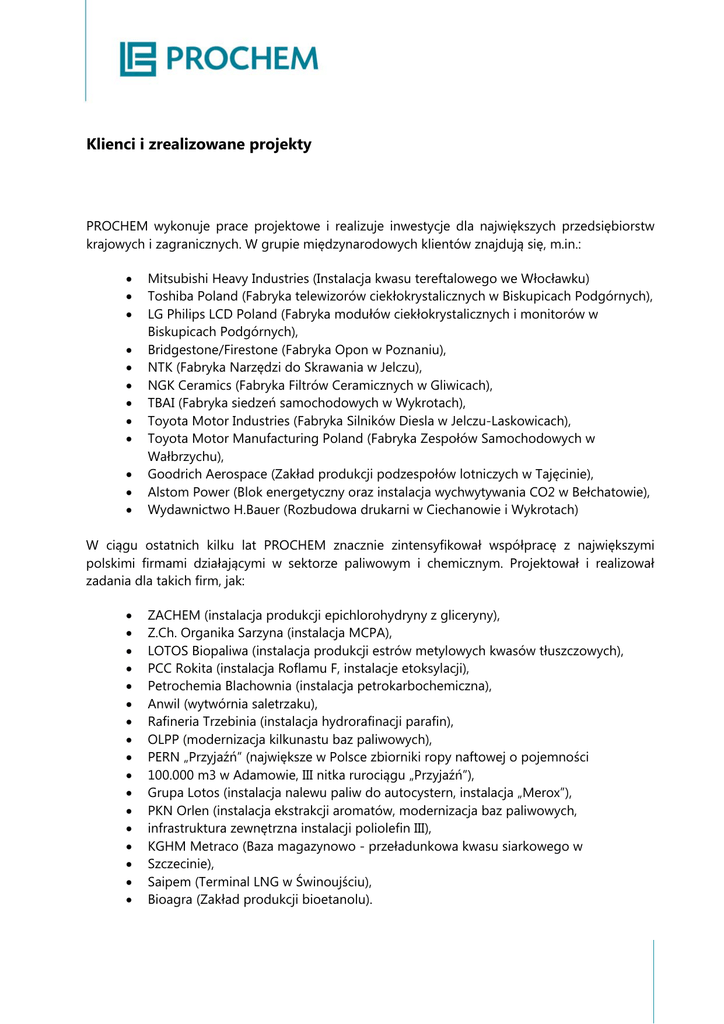 Klienci i zrealizowane projekty PROCHEM wykonuje prace projektowe i realizuje inwestycje dla największych przedsiębiorstw krajowych i zagranicznych. W grupie międzynarodowych klientów znajdują się, m.in.: Mitsubishi Heavy Industries (Instalacja kwasu tereftalowego we Włocławku) Toshiba Poland (Fabryka telewizorów ciekłokrystalicznych w Biskupicach Podgórnych), LG Philips LCD Poland (Fabryka modułów ciekłokrystalicznych i monitorów w Biskupicach Podgórnych), Bridgestone/Firestone (Fabryka Opon w Poznaniu), NTK (Fabryka Narzędzi do Skrawania w Jelczu), NGK Ceramics (Fabryka Filtrów Ceramicznych w Gliwicach), TBAI (Fabryka siedzeń samochodowych w Wykrotach), Toyota Motor Industries (Fabryka Silników Diesla w Jelczu-Laskowicach), Toyota Motor Manufacturing Poland (Fabryka Zespołów Samochodowych w Wałbrzychu), Goodrich Aerospace (Zakład produkcji podzespołów lotniczych w Tajęcinie), Alstom Power (Blok energetyczny oraz instalacja wychwytywania CO2 w Bełchatowie), Wydawnictwo H.Bauer (Rozbudowa drukarni w Ciechanowie i Wykrotach) W ciągu ostatnich kilku lat PROCHEM znacznie zintensyfikował współpracę z największymi polskimi firmami działającymi w sektorze paliwowym i chemicznym. Projektował i realizował zadania dla takich firm, jak: ZACHEM (instalacja produkcji epichlorohydryny z gliceryny), Z.Ch. Organika Sarzyna (instalacja MCPA), LOTOS Biopaliwa (instalacja produkcji estrów metylowych kwasów tłuszczowych), PCC Rokita (instalacja Roflamu F, instalacje etoksylacji), Petrochemia Blachownia (instalacja petrokarbochemiczna), Anwil (wytwórnia saletrzaku), Rafineria Trzebinia (instalacja hydrorafinacji parafin), OLPP (modernizacja kilkunastu baz paliwowych), PERN „Przyjaźń” (największe w Polsce zbiorniki ropy naftowej o pojemności 100.000 m3 w Adamowie, III nitka rurociągu „Przyjaźń”), Grupa Lotos (instalacja nalewu paliw do autocystern, instalacja „Merox”), PKN Orlen (instalacja ekstrakcji aromatów, modernizacja baz paliwowych, infrastruktura zewnętrzna instalacji poliolefin III), KGHM Metraco (Baza magazynowo - przeładunkowa kwasu siarkowego w Szczecinie), Saipem (Terminal LNG w Świnoujściu), Bioagra (Zakład produkcji bioetanolu). PROCHEM działa również w sektorze farmaceutycznym, gdzie zrealizował projekty dla takich klientów, jak: Polfa Tarchomin (modernizacja wydziału żeli farmaceutycznych oraz dozowni, obiekt do produkcji leków psychotropowych), WZF Polfa (magazyn wysokiego składowania), Polpharma (modernizacja wydziału produkcji substancji aktywnych oraz instalacji syntez). Ważnym obszarem działalności spółki jest również sektor budownictwa ogólnego. Do grupy klientów z tego sektora zaliczają się: Uniwersytet Warszawski (Centrum Nowych Technologii, Centrum Nauk BiologicznoChemicznych, Wydział Lingwistyki), SGGW (infrastruktura kampusu, modernizacja budynków naukowodydaktycznych, Centrum Naukowo Dydaktyczne Wydziału Inżynierii i Kształtowania Środowiska), Telewizja Polska (budynek biurowy), PP Porty Lotnicze (Centrum Zarządzania Ruchem Lotniczym, modernizacja ośrodka radiolokacyjnego), Polska Agencja Żeglugi Powietrznej (wieża kontroli ruchu w Poznaniu i Krakowie). Niezależnie od kontraktów realizowanych na terenie Polski, PROCHEM ma również znaczne osiągnięcia we współpracy z firmami poza granicami kraju. M.in. opracował dokumentację projektową prac modernizacyjnych i remontowych w rafinerii w Turkmenistanie oraz modernizacji kilku oczyszczalni ścieków wzdłuż ropociągu w Gruzji. Innym przykładem są zaprojektowane i wykonane przez PROCHEM instalacje granulacji nawozów azotowych oraz neutralizacji dla firmy Nitrogenmuvek w Perfurdo (Węgry).