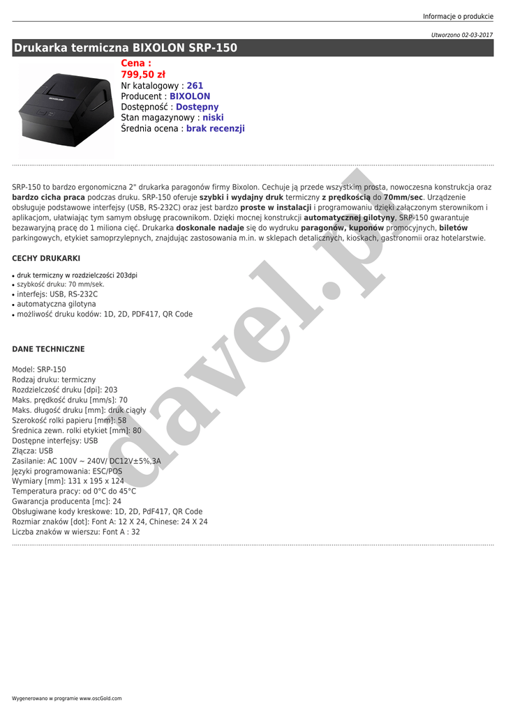 Informacje o produkcie Utworzono 02-03-2017 Drukarka termiczna BIXOLON SRP-150 Cena : 799,50 zł Nr katalogowy : 261 Producent : BIXOLON Dostępność : Dostępny Stan magazynowy : niski Średnia ocena : brak recenzji CECHY DRUKARKI ● ● ● ● druk termiczny w rozdzielczości 203dpi szybkość druku: 70 mm/sek. interfejs: USB, RS-232C automatyczna gilotyna możliwość druku kodów: 1D, 2D, PDF417, QR Code DANE TECHNICZNE ve l ● da Model: SRP-150 Rodzaj druku: termiczny Rozdzielczość druku [dpi]: 203 Maks. prędkość druku [mm/s]: 70 Maks. długość druku [mm]: druk ciągły Szerokość rolki papieru [mm]: 58 Średnica zewn. rolki etykiet [mm]: 80 Dostępne interfejsy: USB Złącza: USB Zasilanie: AC 100V ~ 240V/ DC12V±5%,3A Języki programowania: ESC/POS Wymiary [mm]: 131 x 195 x 124 Temperatura pracy: od 0°C do 45°C Gwarancja producenta [mc]: 24 Obsługiwane kody kreskowe: 1D, 2D, PdF417, QR Code Rozmiar znaków [dot]: Font A: 12 X 24, Chinese: 24 X 24 Liczba znaków w wierszu: Font A : 32 Wygenerowano w programie www.oscGold.com .p l SRP-150 to bardzo ergonomiczna 2" drukarka paragonów firmy Bixolon. Cechuje ją przede wszystkim prosta, nowoczesna konstrukcja oraz bardzo cicha praca podczas druku. SRP-150 oferuje szybki i wydajny druk termiczny z prędkością do 70mm/sec. Urządzenie obsługuje podstawowe interfejsy (USB, RS-232C) oraz jest bardzo proste w instalacji i programowaniu dzięki załączonym sterownikom i aplikacjom, ułatwiając tym samym obsługę pracownikom. Dzięki mocnej konstrukcji automatycznej gilotyny, SRP-150 gwarantuje bezawaryjną pracę do 1 miliona cięć. Drukarka doskonale nadaje się do wydruku paragonów, kuponów promocyjnych, biletów parkingowych, etykiet samoprzylepnych, znajdując zastosowania m.in. w sklepach detalicznych, kioskach, gastronomii oraz hotelarstwie.