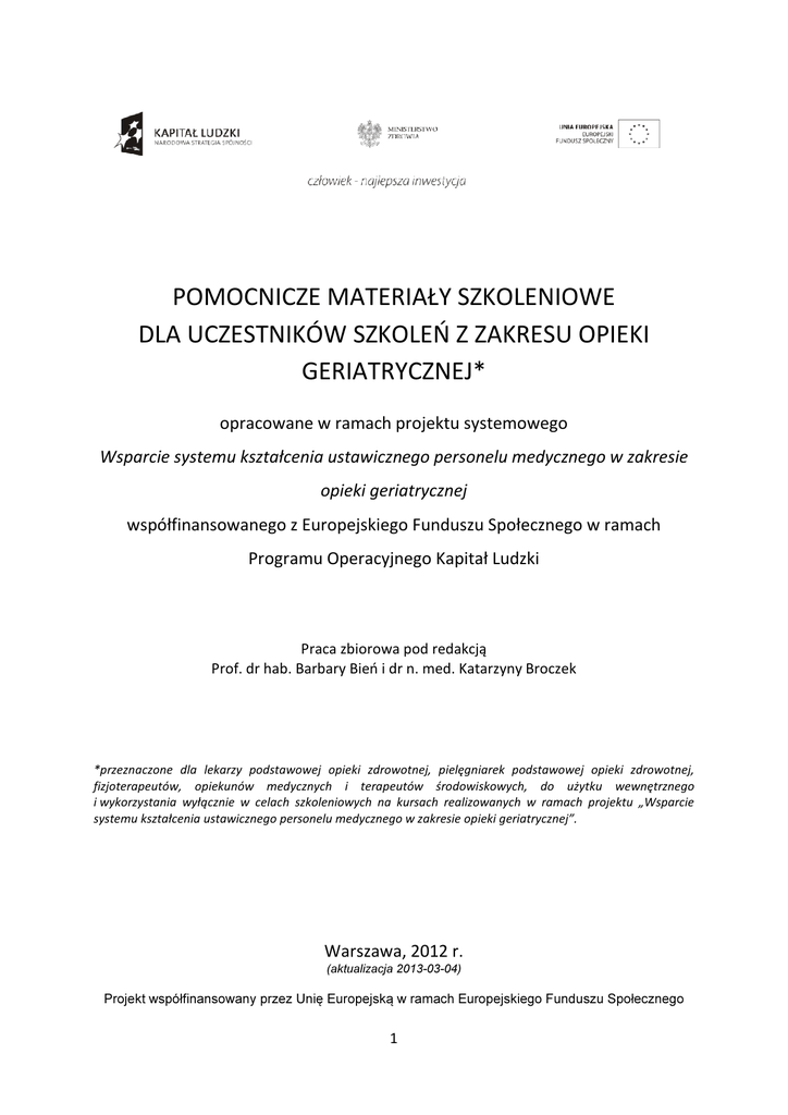 POMOCNICZE MATERIAŁY SZKOLENIOWE DLA UCZESTNIKÓW SZKOLEŃ Z ZAKRESU OPIEKI GERIATRYCZNEJ* opracowane w ramach projektu systemowego Wsparcie systemu kształcenia ustawicznego personelu medycznego w zakresie opieki geriatrycznej współfinansowanego z Europejskiego Funduszu Społecznego w ramach Programu Operacyjnego Kapitał Ludzki Praca zbiorowa pod redakcją Prof. dr hab. Barbary Bień i dr n. med. Katarzyny Broczek *przeznaczone dla lekarzy podstawowej opieki zdrowotnej, pielęgniarek podstawowej opieki zdrowotnej, fizjoterapeutów, opiekunów medycznych i terapeutów środowiskowych, do użytku wewnętrznego i wykorzystania wyłącznie w celach szkoleniowych na kursach realizowanych w ramach projektu „Wsparcie systemu kształcenia ustawicznego personelu medycznego w zakresie opieki geriatrycznej”. Warszawa, 2012 r. (aktualizacja 2013-03-04) Projekt współfinansowany przez Unię Europejską w ramach Europejskiego Funduszu Społecznego 1 Autorzy: 1. Prof. dr hab. Barbara Bień, Klinika Geriatrii, Uniwersytet Medyczny w Białymstoku. 2. Dr n. med. Katarzyna Broczek, Klinika Geriatrii, Warszawski Uniwersytet Medyczny. 3. Dr n. med. Alicja Klich-Rączka, Katedra Chorób Wewnętrznych i Gerontologii, Collegium Medicum Uniwersytet Jagielloński. 4. Dr n. med. Zbigniew Machaj, Katedra i Klinika Chorób Wewnętrznych, Geriatrii i Alergologii, Uniwersytet Medyczny we Wrocławiu. 5. Mgr Ewa Majsterek, Departament Pielęgniarek i Położnych, Ministerstwo Zdrowia. 6. Prof. nadzw. dr hab. Marek Żak, Katedra Rehabilitacji Klinicznej, Akademia Wychowania Fizycznego w Krakowie. Recenzent: Prof. dr hab. Tomasz Grodzicki, Konsultant Krajowy w dziedzinie Geriatrii 2 Spis treści: I. Wprowadzenie…………………………………………………………………………………………………………….…….… 4 II. Opis projektu……………………………………………………………………………………………….…………………...... 5 III. Całościowa Ocena Geriatryczna [COG] standardem w interdyscyplinarnej ocenie i opiece nad pacjentem w wieku starszym…………………………………………………….……………………….……………..… 7 IV. Rola lekarza POZ w ocenie i opiece geriatrycznej……………………………………………..……..……….... 10 V. Rola pielęgniarki POZ w ocenie i opiece geriatrycznej…………………………………………….…….….... 11 VI. Rola fizjoterapeuty w ocenie i opiece geriatrycznej………………………………………………..…...….…. 14 VII. Rola opiekunów medycznych w ocenie i opiece geriatrycznej………………………..………..…..….… 16 VIII.Rola terapeuty środowiskowego w ocenie i opiece geriatrycznej……………………………………..… 17 IX. Wybrane narzędzia Całościowej Oceny Geriatrycznej rekomendowane do stosowania lub interpretacji dla praktyków POZ…………………………………………………………………………….….…. 20 1. Skala oceny instrumentalnych czynności życia codziennego (I-ADL) wg Lawtona..………………………………………………………………………….……………………………….…. 20 2. Skala oceny instrumentalnych czynności życia codziennego (The Duke OARS Assessment of IADL)………………………………………………………………………………………………………….…….…..… 20 3. Skala oceny podstawowych czynności życia codziennego (ADL) wg Katza………………...… 21 4. Indeks oceny podstawowych czynności w życiu codziennym wg Barthel………………………………………………………………………………………………………….…….... 22 5. Geriatryczna skala oceny depresji „Wersja 4-punktowa”…………………………………….…….… 23 6. Geriatryczna skala oceny depresji „Wersja 15-punktowa” wg Yesavage’a JA …….……..… 23 7. Test oceny upośledzenia funkcji poznawczych (UFP) wg Blesseda……………………….……… 24 8. Test rysowania zegara…………………………………………………………………………………………...…... 24 9. Skrócony test sprawności umysłowej (AMTS) wg Hodgkinsona…………………………...…..… 26 10. Skala CAM do oceny jakościowych zaburzeń świadomości: splątanie/majaczenie…………………………………………………………………………………….……………. 26 11. Skala DOS………………………………………………………………………………………………………….….…..… 26 12. Skala Hachinskiego…………………………………………………………………………………….……….…….... 27 13. Skala Norton – ocena ryzyka rozwoju odleżyn……………………………….…………………….….….. 27 14. Test „Wstań i Idź – Timed Up and Go (TUG)………………………………………….…………...….….… 28 15. Ocena chodu, równowagi i ryzyka upadków przy pomocy testu Tinetti (POMA)………………………………………………………………………………………………….……………...…… 28 16. Ocena hipotonii ortostatycznej……………………………………………………………………………....….. 30 17. Ocena widzenia – badanie przesiewowe……………………………………………………………….……. 30 18. Ocena słuchu – badanie przesiewowe …………………………………………………………………........ 31 19. Test Amslera……………………………………………………………………………………………….…….....….… 31 20. Kwestionariusz oceny stopnia odżywienia……………………………………