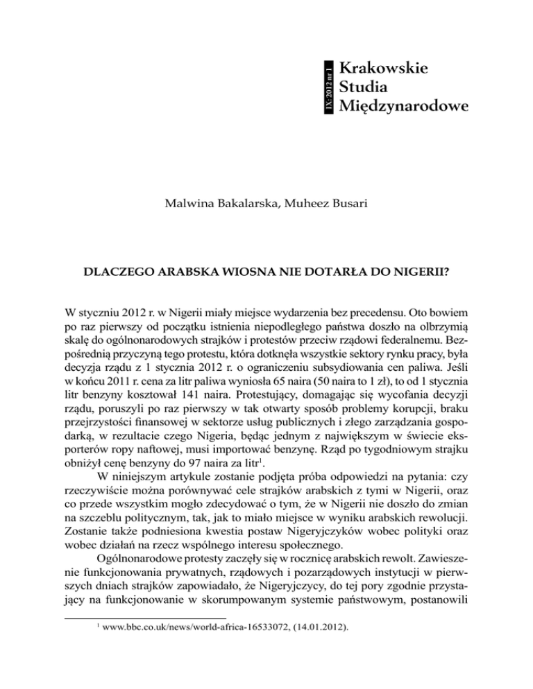 IX: 2012 nr 1 Malwina Bakalarska, Muheez Busari DLACZEGO ARABSKA WIOSNA NIE DOTARŁA DO NIGERII? W styczniu 2012 r. w Nigerii miały miejsce wydarzenia bez precedensu. Oto bowiem po raz pierwszy od początku istnienia niepodległego państwa doszło na olbrzymią skalę do ogólnonarodowych strajków i protestów przeciw rządowi federalnemu. Bezpośrednią przyczyną tego protestu, która dotknęła wszystkie sektory rynku pracy, była decyzja rządu z 1 stycznia 2012 r. o ograniczeniu subsydiowania cen paliwa. Jeśli w końcu 2011 r. cena za litr paliwa wyniosła 65 naira (50 naira to 1 zł), to od 1 stycznia litr benzyny kosztował 141 naira. Protestujący, domagając się wycofania decyzji rządu, poruszyli po raz pierwszy w tak otwarty sposób problemy korupcji, braku przejrzystości finansowej w sektorze usług publicznych i złego zarządzania gospodarką, w rezultacie czego Nigeria, będąc jednym z największym w świecie eksporterów ropy naftowej, musi importować benzynę. Rząd po tygodniowym strajku obniżył cenę benzyny do 97 naira za litr1. W niniejszym artykule zostanie podjęta próba odpowiedzi na pytania: czy rzeczywiście można porównywać cele strajków arabskich z tymi w Nigerii, oraz co przede wszystkim mogło zdecydować o tym, że w Nigerii nie doszło do zmian na szczeblu politycznym, tak, jak to miało miejsce w wyniku arabskich rewolucji. Zostanie także podniesiona kwestia postaw Nigeryjczyków wobec polityki oraz wobec działań na rzecz wspólnego interesu społecznego. Ogólnonarodowe protesty zaczęły się w rocznicę arabskich rewolt. Zawieszenie funkcjonowania prywatnych, rządowych i pozarządowych instytucji w pierwszych dniach strajków zapowiadało, że Nigeryjczycy, do tej pory zgodnie przystający na funkcjonowanie w skorumpowanym systemie państwowym, postanowili 1 www.bbc.co.uk/news/world-africa-16533072, (14.01.2012). 258 MALWINA BAKALARSKA, MUHEEZ BUSARI przeciwstawić się niewydolności zarządzania ich krajem. Żądano zadośćuczynienia za wszelkie krzywdy wyrządzone obywatelom nigeryjskim, spowodowane brakiem przejrzystości w rządzie, endemiczną korupcją, która systematycznie przyczynia się do ubożenia przeciętnego Nigeryjczyka i powstrzymuje rozwój kraju. Rodziły się pytania, czy jest to sprzeciw wobec podwyżek cen, czy też chęć stanowczego naprawienia zasad rządzących Nigerią, wynikająca z osiągnięcia przez Nigeryjczyków dojrzałości w kwestii postaw obywatelskich? W nigeryjskich mediach już pierwszego dnia strajków (9 stycznia 2012 r.) zaczęły pojawiać się optymistyczne wypowiedzi, w których pobrzmiewała nadzieja na znaczące zmiany w kraju. Można było usłyszeć opinię, że „Nigeryjczycy od lat nie byli tak zjednoczeni”2, wyrażoną przez nigeryjskiego publicystę, zaangażowanego w ruch strajkujących i pełne nadziei słowa przewodniczącego nigeryjskiej Socjalistycznej Ligi Pracy: „Tutaj, jak nigdy dotąd, naród [jest] zjednoczony przeciw potędze państwa i bezwstydnym politykom, którzy z miłości do pieniędzy nie słyszą głosu ludzi”3. Uczestnik spotkania organizacji Joint Action Front, dla niezależnych mediów internetowych w Lagos, 5 stycznia 2012 r. wypowiedział znamienne słowa: „Myślę, że po raz pierwszy w historii Nigerii widzę aktywność klasy średniej”4. Wypowiedzi te ukazały dość drażliwy problem solidarności przedstawicieli różnych segmentów społecznych w podzielonej pod względem ekonomicznym Nigerii. W protestach domagano się nie tylko przywrócenia wcześniejszej ceny benzyny, ale także walki z korupcją, sprawiedliwej dystrybucji zysków z wydobycia ropy naftowej, zmniejszenia wysokich pensji politykom oraz przejrzystości w informowaniu narodu o poczynaniach rządu federalnego i rządów stanowych5. Skala protestów i poruszenia Nigeryjczyków zapowiadały wielką rewolucję – strajk ogarnął bowiem wszystkie stany kraju, wszystkie sektory pracy, zawieszono kursy autobusów, targi były puste, odwołano większość lotów linii lokalnych i część zagranicznych6, w Lagos nastąpiły przerwy w dostawach prądu7. Strajk narodowy podzielił społeczeństwo wywołując wewnętrzne dylematy. Policjant mieszkający w Lagos, w wywiadzie dla autorki przyznał, że nieoficjalnie stoi po stronie strajkujących i sam chętnie by się do nich przyłączył, ale jego praca wymaga pilnowania porządku8. Formalnie musiał reprezentować interes rządu, prywatnie natomiast był przeciw. Pomimo zaogniającej się sytuacji na ulicach meS. Jacobs, Occupy Nigeria, www.africasacountry.com/2012/01/09/occupy-nigeria/, (11.01.2012). B. Aye, Revolution in Nigeria: Our day has come!, www.pambazuka.org/en/category/features/79000, (13.01.2012). 4 www.africasacountry.com/2012/03/26/looking-back-on-occupy-nigeria/, 3:35min filmu, (15.03.2012). 5 F. Iyanda, C. Dada, Let Them Chop Cassava, www.chopcassava.com, (30.03.2012). 6 Na podstawie wywiadu ze stewardesą lokalnych linii lotniczych; wywiad przeprowadzony przez M. Bakalarską przez telefon, w drugi dzień strajków 10 stycznia 2012. 7 www.tvn24.pl/12691,1731186,0,1,odetna-od-ropy-usa-i-europe,wiadomosc.html (15.01.2012). 8 Wywiad przeprowadzony przez Internet, 10 stycznia 2012. 2 3 DLACZEGO ARABSKA WIOSNA NIE DOTARŁA DO NIGERII? 259 tropolii, gdzie policja i wojsko strzelając do strajkujących, pozbawiło życia kilka osób, dobrze sytuowani biznesmeni nie zrezygnowali z generowania zysków. Pracownicy hoteli na Victoria Island (biznesowe centrum Lagos) również pozostali na swoich stanowiskach, gdyż nie chcieli stracić pracy9. Ogólnonarodowe powstanie skończyło się szybciej niż się spodziewano. Już po tygodniu protestów ulicznych, w weekend 15–16 stycznia 2012 r. mieszkańcy Lagos postanowili zawiesić strajk. Społeczeństwo Nigerii dało się uspokoić nieznacznymi decyzjami rządu federalnego. Krajowe związki zawodowe, argumentując chęcią ocalenia istnień ludzkich w trakcie zamieszek ul