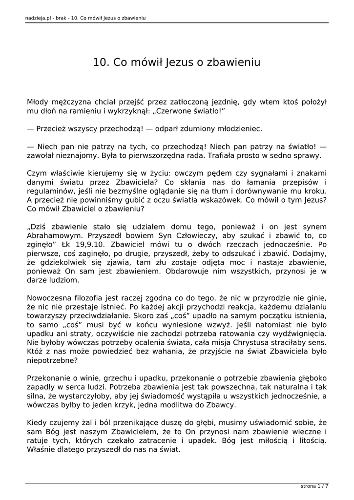 nadzieja.pl - brak - 10. Co mówił Jezus o zbawieniu 10. Co mówił Jezus o zbawieniu Młody mężczyzna chciał przejść przez zatłoczoną jezdnię, gdy wtem ktoś położył mu dłoń na ramieniu i wykrzyknął: „Czerwone światło!” — Przecież wszyscy przechodzą! — odparł zdumiony młodzieniec. — Niech pan nie patrzy na tych, co przechodzą! Niech pan patrzy na światło! — zawołał nieznajomy. Była to pierwszorzędna rada. Trafiała prosto w sedno sprawy. Czym właściwie kierujemy się w życiu: owczym pędem czy sygnałami i znakami danymi światu przez Zbawiciela? Co skłania nas do łamania przepisów i regulaminów, jeśli nie bezmyślne oglądanie się na tłum i dorównywanie mu kroku. A przecież nie powinniśmy gubić z oczu światła wskazówek. Co mówił o tym Jezus? Co mówił Zbawiciel o zbawieniu? „Dziś zbawienie stało się udziałem domu tego, ponieważ i on jest synem Abrahamowym. Przyszedł bowiem Syn Człowieczy, aby szukać i zbawić to, co zginęło” Łk 19,9.10. Zbawiciel mówi tu o dwóch rzeczach jednocześnie. Po pierwsze, coś zaginęło, po drugie, przyszedł, żeby to odszukać i zbawić. Dodajmy, że gdziekolwiek się zjawia, tam złu zostaje odjęta moc i nastaje zbawienie, ponieważ On sam jest zbawieniem. Obdarowuje nim wszystkich, przynosi je w darze ludziom. Nowoczesna filozofia jest raczej zgodna co do tego, że nic w przyrodzie nie ginie, że nic nie przestaje istnieć. Po każdej akcji przychodzi reakcja, każdemu działaniu towarzyszy przeciwdziałanie. Skoro zaś „coś” upadło na samym początku istnienia, to samo „coś” musi być w końcu wyniesione wzwyż. Jeśli natomiast nie było upadku ani straty, oczywiście nie zachodzi potrzeba ratowania czy wydźwignięcia. Nie byłoby wówczas potrzeby ocalenia świata, cała misja Chrystusa straciłaby sens. Któż z nas może powiedzieć bez wahania, że przyjście na świat Zbawiciela było niepotrzebne? Przekonanie o winie, grzechu i upadku, przekonanie o potrzebie zbawienia głęboko zapadły w serca ludzi. Potrzeba zbawienia jest tak powszechna, tak naturalna i tak silna, że wystarczyłoby, aby jej świadomość wystąpiła u wszystkich jednocześnie, a wówczas byłby to jeden krzyk, jedna modlitwa do Zbawcy. Kiedy czujemy żal i ból przenikające duszę do głębi, musimy uświadomić sobie, że sam Bóg jest naszym Zbawicielem, że to On przynosi nam zbawienie wieczne i ratuje tych, których czekało zatracenie i upadek. Bóg jest miłością i litością. Właśnie dlatego przyszedł do nas na świat. strona 1 / 7 nadzieja.pl - brak - 10. Co mówił Jezus o zbawieniu W każdym naszym słowie, w każdej myśli i czynie pojawia się lub może się pojawić zarodek zła, jakiś czynnik czegoś niedobrego, niewłaściwego. Ludzie określają go rozmaicie, ale Pismo Święte podpowiada nam jego najbardziej precyzyjnie sformułowaną nazwę: grzech. Grzech jest chorobą serca i umysłu. Uwolnić nas od niego może jedynie Bóg w całej swej potędze, w całej swej niezmierzonej łasce. Przyszedł na ziemię, żeby „szukać i zbawić to, co zginęło” Łk 19,1. Dlatego właśnie przyjął imię „Jezus”. Anioł, który zwiastował Jego narodzenie, powiedział Marii: „(...) nadasz mu imię Jezus; albowiem On zbawi lud swój od grzechów jego” Mt 1,21. Imię to oznacza „Jahwe Zbawca”. W Ewangelii Jana czytamy: „Albowiem tak Bóg umiłował świat, że Syna swego jednorodzonego dał, aby każdy, kto weń wierzy, nie zginął, ale miał żywot wieczny” J 3,16. Apostoł Paweł powtórzył te słowa o północy dozorcy więziennemu: „Uwierz w Pana Jezusa, a będziesz zbawiony, ty i twój dom” Dz 16,31. Marcin Luter, który próbował osiągnąć pokój serca przez dobre uczynki i wymyślne pokuty, znalazł prawdę o zbawieniu w słowach apostoła Pawła: „Dlatego z uczynków zakonu nie będzie usprawiedliwiony przed nim żaden człowiek” Rz 3,2; „Albowiem czego zakon nie mógł dokonać, w czym był słaby z powodu ciała, tego dokonał Bóg: przez zesłanie Syna swego w postaci grzesznego ciała, ofiarując je za grzech, potępił grzech w ciele” Rz 8,3. Prawda zaczęła świtać, ale on jeszcze nie znalazł pełni światła. W wielkim mieście Rzymie szukał pokory i pobożności. Znalazł jedynie gniazdo ambicji, politycznych intryg i światowych uciech. Z determinacją, w skrusze, na klęczkach wspinał się po schodach Piłata, lecz nawet i ten wyczyn, podobnie jak inne, nie dał mu uwolnienia od grzechu ani pokoju ducha, którego tak pragnął. Wreszcie dotarły do niego słowa Pisma: „Sprawiedliwy z wiary żyć będzie” Rz 1,17. A więc nie tzw. uczynki, lecz wiara, prawdziwa, chrześcijańska wiara. Wtedy Luter powstał z klęczek i wyprostował się. Pojął, że jedynie Chrystus, jedynie Jego sprawiedliwość uwalnia od grzechu, przynosi zbawienie. Wiedział, że Jezus, człowiek bez grzechu i Syn Boży, był prześladowany i męczony właśnie po to, aby nas zbawić. Umarł na krzyżu za grzechy nas wszystkich 1Kor 15,3. On zajął nasze miejsce, przyjął nasz los, który jest konsekwencją złamania prawa, bo grzech to nic innego, jak naruszenie prawa 1J 3,4. Bóg tak umiłował świat, że dał zbawienie jako dar. Pewien nauczyciel próbował wyjaśnić swym uczniom pierwsze wiersze pięćdziesiątego piątego rozdziału Księgi Izajasza: „Nuże, wszyscy, którzy macie pragnienie — czytał — pójdźcie do wód, a którzy nie macie pieniędzy, pójdźcie, kupujcie i jedzcie! Pójdźcie, kupujcie bez pieniędzy i bez płacenia wino i mleko!”. Piękne zaproszenie zawarte w tym tekście wydawało mu się zbyt trudne do wyjaśnienia tym młodym ludziom. Kiedy w cichej modlitwie prosił o pomoc, nasunęły mu się słowa „a mały chłopiec je poprowadzi” Iz 11,6. Zrozumiał, że Bóg zamierza wyjaśnić ten tekst przez jedno z tych dzieci, które zrobi to lepiej niż on. Przeczytał tekst głośno i powoli jeszcze