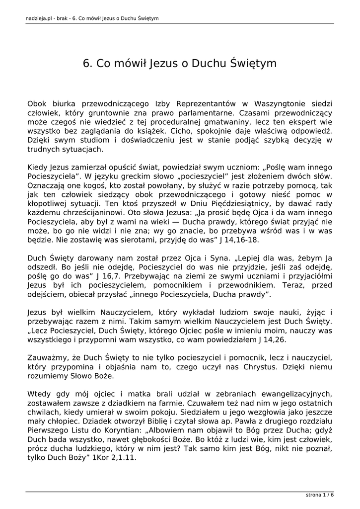 nadzieja.pl - brak - 6. Co mówił Jezus o Duchu Świętym 6. Co mówił Jezus o Duchu Świętym Obok biurka przewodniczącego Izby Reprezentantów w Waszyngtonie siedzi człowiek, który gruntownie zna prawo parlamentarne. Czasami przewodniczący może czegoś nie wiedzieć z tej proceduralnej gmatwaniny, lecz ten ekspert wie wszystko bez zaglądania do książek. Cicho, spokojnie daje właściwą odpowiedź. Dzięki swym studiom i doświadczeniu jest w stanie podjąć szybką decyzję w trudnych sytuacjach. Kiedy Jezus zamierzał opuścić świat, powiedział swym uczniom: „Poślę wam innego Pocieszyciela”. W języku greckim słowo „pocieszyciel” jest złożeniem dwóch słów. Oznaczają one kogoś, kto został powołany, by służyć w razie potrzeby pomocą, tak jak ten człowiek siedzący obok przewodniczącego i gotowy nieść pomoc w kłopotliwej sytuacji. Ten ktoś przyszedł w Dniu Pięćdziesiątnicy, by dawać rady każdemu chrześcijaninowi. Oto słowa Jezusa: „Ja prosić będę Ojca i da wam innego Pocieszyciela, aby był z wami na wieki — Ducha prawdy, którego świat przyjąć nie może, bo go nie widzi i nie zna; wy go znacie, bo przebywa wśród was i w was będzie. Nie zostawię was sierotami, przyjdę do was” J 14,16-18. Duch Święty darowany nam został przez Ojca i Syna. „Lepiej dla was, żebym Ja odszedł. Bo jeśli nie odejdę, Pocieszyciel do was nie przyjdzie, jeśli zaś odejdę, poślę go do was” J 16,7. Przebywając na ziemi ze swymi uczniami i przyjaciółmi Jezus był ich pocieszycielem, pomocnikiem i przewodnikiem. Teraz, przed odejściem, obiecał przysłać „innego Pocieszyciela, Ducha prawdy”. Jezus był wielkim Nauczycielem, który wykładał ludziom swoje nauki, żyjąc i przebywając razem z nimi. Takim samym wielkim Nauczycielem jest Duch Święty. „Lecz Pocieszyciel, Duch Święty, którego Ojciec pośle w imieniu moim, nauczy was wszystkiego i przypomni wam wszystko, co wam powiedziałem J 14,26. Zauważmy, że Duch Święty to nie tylko pocieszyciel i pomocnik, lecz i nauczyciel, który przypomina i objaśnia nam to, czego uczył nas Chrystus. Dzięki niemu rozumiemy Słowo Boże. Wtedy gdy mój ojciec i matka brali udział w zebraniach ewangelizacyjnych, zostawałem zawsze z dziadkiem na farmie. Czuwałem też nad nim w jego ostatnich chwilach, kiedy umierał w swoim pokoju. Siedziałem u jego wezgłowia jako jeszcze mały chłopiec. Dziadek otworzył Biblię i czytał słowa ap. Pawła z drugiego rozdziału Pierwszego Listu do Koryntian: „Albowiem nam objawił to Bóg przez Ducha; gdyż Duch bada wszystko, nawet głębokości Boże. Bo któż z ludzi wie, kim jest człowiek, prócz ducha ludzkiego, który w nim jest? Tak samo kim jest Bóg, nikt nie poznał, tylko Duch Boży” 1Kor 2,1.11. strona 1 / 6 nadzieja.pl - brak - 6. Co mówił Jezus o Duchu Świętym Potem dziadek rzekł: „Pamiętaj synu. Masz być Bożym sługą. Otrzymałeś od Niego wezwanie. Nigdy jednak sam nie zrozumiesz do głębi Biblii, nie będziesz umiał objaśnić jej ludziom, jeśli nie oświeci cię Duch Święty. Musisz być człowiekiem uduchowionym, musisz radzić się Ducha Świętego, jeśli chcesz mieć jako kaznodzieja siłę przekonywania i wpływ na słuchaczy. A jeżeli już Słowo Boże zrozumiesz do głębi, będzie to dzieło i zasługa Ducha Świętego. To za jego sprawą, synu! Słuchaj, co czytam: „A myśmy otrzymali nie ducha świata, lecz Ducha, który jest z Boga, abyśmy wiedzieli, czym nas Bóg łaskawie obdarzył. Głosimy to nie w uczonych słowach ludzkiej mądrości, lecz w słowach, których naucza Duch, przykładając do duchowych rzeczy duchową miarę. Ale człowiek zmysłowy nie przyjmuje tych rzeczy, które są z Ducha Bożego, bo są dlań głupstwem, i nie może ich poznać, gdyż należy je duchowo rozsądzać” 1Kor 2,12-14. Potem dziadek położył Biblię i spokojnie osunął głowę na poduszkę, z której nie podniósł się już nigdy. Jego słowa utkwiły mi głęboko w sercu. Były to przecież słowa Jezusa, podobne do tego, co Jezus powiedział o Duchu Świętym, który „nauczy was wszystkiego i przypomni wam wszystko, co powiedziałem”. Duch Święty daje świadectwo Jezusowi i Jego chwale. Jezus powiedział: „Gdy przyjdzie Pocieszyciel, którego Ja wam poślę od Ojca, Duch Prawdy, który od Ojca wychodzi, złoży świadectwo o mnie” J 15,26. Gdy Zbawiciel wrócił do nieba, pozostał nadal obecny na ziemi przez obecność na niej Pocieszyciela — Ducha Świętego. O przyjściu na świat Ducha powiedział, co następuje: „(...) bo przebywa wśród was i w was będzie. Nie zostawię was sierotami, przyjdę do was” J 14,17.18. Chrystus jest więc wśród nas obecny przez Ducha — Pocieszyciela. Świat nie może tego widzieć, ale w przekonaniu o realnej obecności Chrystusa umacnia nas wiara. Jezus mówił bowiem: „Jeśli kto mnie miłuje, słowa mojego przestrzegać będzie, i Ojciec mój umiłuje go, i do niego przyjdziemy i u niego zamieszkamy” (w. 23). Dzięki obecności wśród nas Ducha Świętego każdy wierzący człowiek może odnaleźć drogę prawdy i jest w stanie zrozumieć Pismo Święte. Warto zauważyć tu trzy rodzaje działania, o których Jezus mówił, zapowiadając nam przysłanie Pocieszyciela na świat. „A On, gdy przyjdzie, przekona świat o grzechu i o sprawiedliwości, i o sądzie; o grzechu, gdyż nie uwierzyli we mnie, o sprawiedliwości, gdyż odchodzę do Ojca i już mnie nie ujrzycie; o sądzie zaś, gdyż książę tego świata został osądzony. Lecz gdy przyjdzie On, Duch Prawdy, wprowadzi was we wszelką prawdę, bo nie sam od siebie mówić będzie, lecz cokolwiek usłyszy, mówić będzie i to, co ma przyjść wam oznajmi. On mnie uwielbi, gdyż z mego weźmie i wam oznajmi” J 16,8-11.13.14. Przede wszystkim więc Duch Święty przekonuje nas o grzechu. Jezus sam również przekonywał ludzi o ich grzechach: „Świat nie może was ni