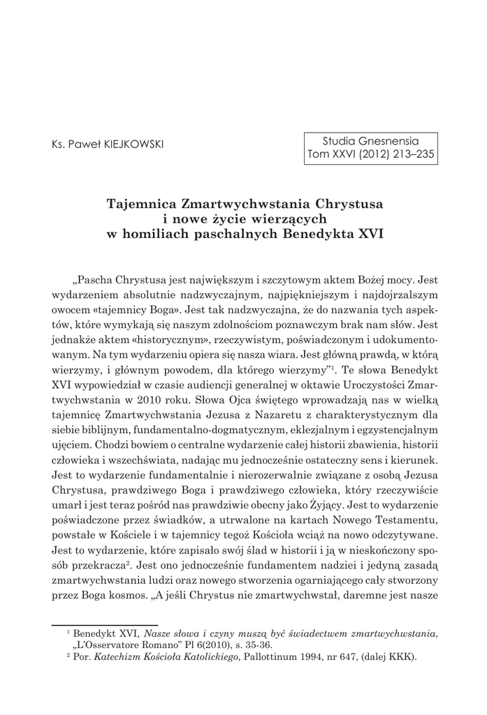 Ks. Paweł KIEJKOWSKI Studia Gnesnensia Tom XXVI (2012) 213–235 Tajemnica Zmartwychwstania Chrystusa i nowe życie wierzących w homiliach paschalnych Benedykta XVI „Pascha Chrystusa jest największym i szczytowym aktem Bożej mocy. Jest wydarzeniem absolutnie nadzwyczajnym, najpiękniejszym i najdojrzalszym owocem «tajemnicy Boga». Jest tak nadzwyczajna, że do nazwania tych aspektów, które wymykają się naszym zdolnościom poznawczym brak nam słów. Jest jednakże aktem «historycznym», rzeczywistym, poświadczonym i udokumentowanym. Na tym wydarzeniu opiera się nasza wiara. Jest główną prawdą, w którą wierzymy, i głównym powodem, dla którego wierzymy”1. Te słowa Benedykt XVI wypowiedział w czasie audiencji generalnej w oktawie Uroczystości Zmartwychwstania w 2010 roku. Słowa Ojca świętego wprowadzają nas w wielką tajemnicę Zmartwychwstania Jezusa z Nazaretu z charakterystycznym dla siebie biblijnym, fundamentalno-dogmatycznym, eklezjalnym i egzystencjalnym ujęciem. Chodzi bowiem o centralne wydarzenie całej historii zbawienia, historii człowieka i wszechświata, nadając mu jednocześnie ostateczny sens i kierunek. Jest to wydarzenie fundamentalnie i nierozerwalnie związane z osobą Jezusa Chrystusa, prawdziwego Boga i prawdziwego człowieka, który rzeczywiście umarł i jest teraz pośród nas prawdziwie obecny jako Żyjący. Jest to wydarzenie poświadczone przez świadków, a utrwalone na kartach Nowego Testamentu, powstałe w Kościele i w tajemnicy tegoż Kościoła wciąż na nowo odczytywane. Jest to wydarzenie, które zapisało swój ślad w historii i ją w nieskończony sposób przekracza2. Jest ono jednocześnie fundamentem nadziei i jedyną zasadą zmartwychwstania ludzi oraz nowego stworzenia ogarniającego cały stworzony przez Boga kosmos. „A jeśli Chrystus nie zmartwychwstał, daremne jest nasze Benedykt XVI, Nasze słowa i czyny muszą być świadectwem zmartwychwstania, „L’Osservatore Romano” Pl 6(2010), s. 35-36. 2 Por. Katechizm Kościoła Katolickiego, Pallottinum 1994, nr 647, (dalej KKK). 1 214 Ks. Paweł KIEJKOWSKI nauczanie, próżna jest także nasza wiara. Okazuje się, że byliśmy fałszywymi świadkami Boga (…)” (1 Kor 15,14-15). Joseph Ratzinger szeroko rozumiany temat Zmartwychwstania podejmował w wielu swoich pracach, choćby wspomnieć tak fundamentalne dla zrozumienia jego teologii dzieło jak Wprowadzenie w chrześcijaństwo3 czy jego Eschatologię4. Benedykt XVI tajemnicy zmartwychwstania Jezusa poświęcił także spory wątek swojej książki Jezus z Nazaretu5, której treść prezentuje jako owoc „mojej długiej wewnętrznej drogi”6. Trzeba przyznać, że zasadnicze tezy dotyczące tajemnicy zmartwychwstania Jezusa Chrystusa, a zapisane w II części Jezusa z Nazaretu, znajdujemy już we wcześniejszych jego publikacjach, przede wszystkim Bóg Jezusa Chrystusa7 oraz Chrystus i Jego Kościół8. Warto zaznaczyć istotną okoliczność powstawania tych tekstów, która wskazuje na ich charakter. Pierwszy z nich jest zapisem rekolekcji wygłoszonych przez J. Ratzingera we Fryburgu w roku 1972, a które następnie z drobnymi poprawkami powtórzył w innych miejscach (Bad Imnau, Kolonia, Maria Laach)9. Drugi z kolei jest zapisem rekolekcji wygłoszonych przez kard. Ratzingera Ojcu świętemu Janowi Pawłowi II i członkom Kurii Rzymskiej na początku Wielkiego Postu 1983 roku10. Nie są to zatem teksty sensu stricte naukowe, ale wpisują się w jego duszpasterskie zaangażowanie i troskę. Jako biskup, kardynał, a obecnie papież wygłosił on wiele homilii, katechez oraz innego rodzaju tekstów przepowiadających i wyjaśniających wielką tajemnicę Zmartwychwstania. W niniejszej pracy pragniemy zatrzymać się tylko na wielkanocnych homiliach Benedykta XVI wygłoszonych w czasie papieskich celebracji Wigilii Paschalnych w latach 2006-2012. Zobaczymy, że te krótkie teksty są teologicznymi perełkami na temat Zmartwychwstania. Spotykamy się z tekstami, które nie pretendują do ogarnięcia i wyczerpania całości tematu. Są to homilie, a zatem teksty słowa przepowiadanego wpisane w żywą liturgię Kościoła, celebrującego tajemnice swojego zbawienia. Napisane są one z charakterystyczną dla RatPor. J. Ratzinger, Wprowadzenie w chrześcijaństwo, tłum. Z. Włodkowa, Kraków 1996, s. 296-304. 4 Por. tenże, Eschatologia. Śmierć i życie wieczne, tłum. M. Węcławski, Poznań 1985, s. 181-212. 5 Por. J. Ratzinger-Benedykt XVI, Jezus z Nazaretu, cz. II, Od wjazdu do Jerozolimy do Zmartwychwstania, tłum. W. Szymona, Kielce 2011, s. 257-294. 6 Tenże, Jezus z Nazaretu, cz. 1, Od chrztu w Jordanie do Przemienienia, tłum. W. Szymona, Kraków 2011, s. 5. 7 Por. J. Ratzinger, Bóg Jezusa Chrystusa, tłum. J. Zychowicz, Kraków 2006, s. 93-103. 8 Por. tenże, Chrystus i jego Kościół, tłum. W. Szymona, Kraków 2005, s. 76-87. 9 Por. tenże, Bóg Jezusa Chrystusa…, s. 7. 10 Por. tenże, Chrystus i Jego Kościół…, s. 6. 3 Tajemnica Zmartwychwstania Chrystusa i nowe życie wierzących 215 zingera precyzją, jasnością, konkretnością zakorzenioną w doświadczeniu11, wyróżniające się znakomitym warsztatem metodologiczno-teologicznym12. Są one także świadectwem jego wewnętrznej drogi wiary i osobistym zaproszeniem Piotra naszych czasów skierowanym do chrześcijan, aby pogłębić, rozwinąć, może na nowo odkryć i przeżyć swoje egzystencjalne doświadczenie wiary w Jezusa Chrystusa, Baranka zabitego a żyjącego. Wyznaczony temat i analiza wielkanocnych homilii Benedykta XVI pozwala zebrać materiał wokół dwóch tematów: a) Zmartwychwstanie Jezusa Chrystusa, b) Zmartwychwstanie i nowe życie wierzących. 1.Zmartwychwstanie Jezusa Chrystusa Wielkie liturgie paschalne uobecniają najważniejsze wydarzenie historii zbawienia – Paschę Jezusa Chrystusa, na którą składają się nierozerwalnie ze sobą związane tajemnice: Jego śmierci, zstąpienia do piekieł, zmar