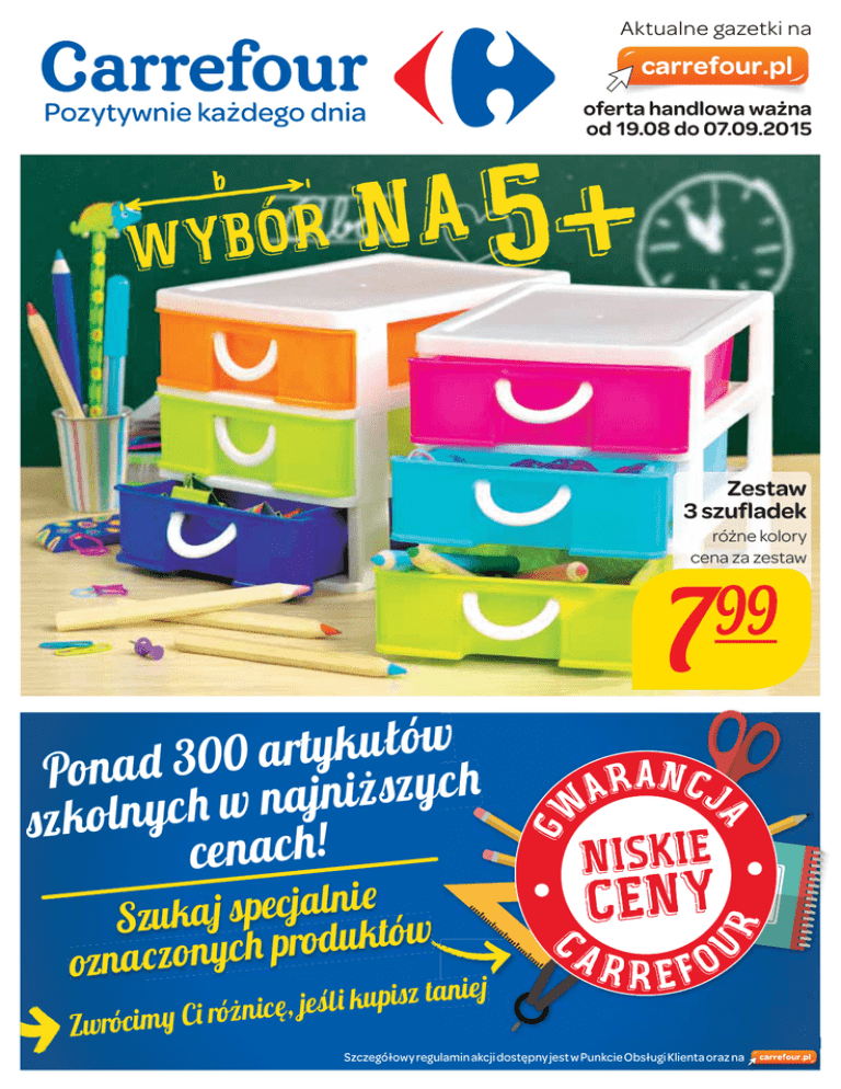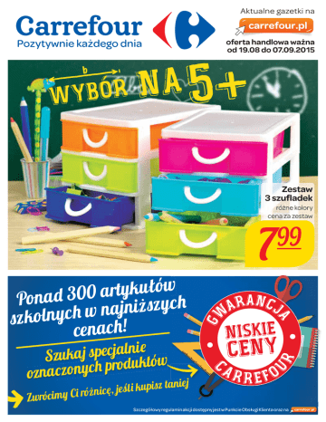 Aktualne gazetki na oferta handlowa ważna od 19.08 do 07.09.2015 R Ó B Y W NA 5+ Zestaw 3 szufladek różne kolory cena za zestaw 99 7 w ó ł u k y t r a Pona d 300 ajniż szyc h n w h c y n l o k sz cenac h! e i n l a j c e p s j a Szuk w ó t k u d o r p h c y ozna czon ie j n a t sz i p u k i l ś nic ę , je ż ó r i C y m i c ó r Zw Szczegółowy regulamin akcji dostępny jest w Punkcie Obsługi Klienta oraz na SUPERBOHATEROWIE NA 5+ SUPER OFERT A Piórnik Plecak szkolno-wycieczkowy mini różne licencje cena za szt. PEPPA różne wzory Twoja przyjaciółka elSa 49 14 99 99 Plecak wycieczkowy tornister - 149,99 zł worek - 21,99 zł piórnik - 29,99 zł KRAINA LODU różne wzory cena za szt. worek - 14,99 zł piórnik - 29,99 zł AVENGERS różne wzory cena za szt. Plecak tornister - 149,99 zł worek - 12,99 zł piórnik 1-komorowy bez wyposażenia - 29,99 zł CARS różne rodzaje cena za szt. 5 rat 0% 10999 99 Plecak szkolny wycieczkowy Plecak FURBY różne rodzaje cena za szt. piórnik z wyposażeniem - 49,99 zł VIOLETTA różne wzory cena za szt. cena od 49 99 99 5 rat 0% 11999 Plecak worek - 21,99 zł piórnik - cena od 24,99 zł STAR WARS różne rodzaje cena za szt. 5 rat 0% 2 119 99 Worek WRÓŻKI różne rodzaje cena za szt. 99 21 Piórnik z wyposażeniem piórnik saszetka - 24,99 zł WRÓŻKI różne rodzaje cena za szt. Naszymi dostawcami są: ST. MAJEWSKI, PASO, DERFORM. Naszymi dostawcami są: ST. MAJEWSKI, VERTE, DERFORM. 59 99 Szczegółowe informacje na temat rat 0% znajdziesz na ostatniej stronie katalogu lub na www.carrefour.pl 64 Plecak 99 layout w opracowaniu Plecak SERIA MY LITTLE FRIEND piórnik - 32,99 zł saszetka - 21,99 zł cena za szt. RTA E F O R SUPE 5 rat 0% 12999 Tornister dziecięcy różne wzory cena za szt. Worek SERIA MY LITTLE FRIEND 19 59 99 99 Mamy wiele różnych wzorów plecaków i piórników Tornister TRANSFORMERS plecak - 79,99 zł cena za szt. Worek TRANSFORMERS Plecak mały różne wzory cena za szt. Szczegółowe informacje na temat rat 0% znajdziesz na ostatniej stronie katalogu lub na www.carrefour.pl 99 11 1499 Piórnik 19 99 11999 Tornister MINI SOFT różne rodzaje cena za szt. u ł ów k y t r a 0 0 3 d Pona szyc h ż i n j a n w h c y szkoln c e n a c h! ie Szuka j specjaln w roduktó ozna czonyc h p różne rodzaje cena za szt. 5 rat 0% ż z w y p os a e ni e m Piórnik szkolny 1-komorowy różnecje lic e n 5 z wyposa że nie m Piórnik z wyposażeniem 31 części różne wzory cena za szt. 34 Piórnik szkolny na jeden zamek cena za szt. 99 1999 różne wzory cena za szt. 99 6999 cena od Piórnik, saszetka TRANSFORMERS różne rodzaje, cena za szt. 1499 Naszymi dostawcami są: PASO, HERLITZ, ST. MAJEWSKI, PBC CONNECT, BENIAMIN, SOVPOL PLUS, EUROTRADE. 3 5-komorowy Plecak młodzieżowy SUPER OFERT A COOLPACK różne wzory cena za szt. 79 99 Saszetka COOLPACK różne wzory cena za szt. 26 99 Szeroka gama plecaków i piórników ł ów u k y t r a 0 0 3 Pona d szyc h ż i n j a n w h c y szkoln c e n a c h! Plecak szkolny różne kolory cena za szt. 6999 r e gul Trolley 10 rat 0% dwukomorowy 249 99 Plecak młodzieżowy PUMA różne kolory wym. 48 x 32 x 21 cm cena za szt. 49 4 99 i Plecak 1-komorowy COOLPACK różne wzory cena za szt. na kółk ach ow z e lk s e n a przednia kieszeń na zamek Plecak młodzieżowy plecak 2-komorowy COOLPACK różne kolory cena za szt. - 89,99 zł cena za szt. 4999 8999 Pamię taj O ŚNIADANIU! Piórnik tuba różne wzory cena za szt. cena od 8 99 Pojemnik do żywności SISTEMA różne rodzaje cena za szt. cena od 999 Naszymi dostawcami są: SEMI LINE, BESTSERVICE, PASO, OTCF, B&S POLSKA, DERFORM. Oferta nie dotyczy sklepów: Gliwice CH FORUM, Grudziądz GALERIA GRUDZIĄDZKA, Kędzierzyn-Koźle, Kutno, Opole CH TURAWA PARK. Szczegółowe informacje na temat rat 0% znajdziesz na ostatniej stronie katalogu lub na www.carrefour.pl ie Szuka j specjaln w roduktó ozna czonyc h p Kredki Kredki TROPICOLORS 2 12 kolorów GLOB COLOR 12 kolorów 18 kolorów - 8,99 zł 12 99 499 Produkt RTA E F O R SUPE Kredki ołówkowe trójkątne JUMBO grube 12 kolorów 4 Kredki ołówkowe 99 Carrefour BAMBINO różne licencje 12 kolorów 14 99 Duży wybór artykułów piśmienniczych i plastycznych z t e mp Kredki świecowe Kredki ołówkowe ASTRINO 12 kolorów + 2 kolory GRATIS 24 kolory - 10,99 zł kredki ołówkowe 18 kolorów- 29,99 zł cena za opak. Kredki BAMBINO 12 kolorów różne licencje cena za opak. 19 99 6 e rówk ą JUMBO 10 kolorów kredki trójkątne 12 kolorów - 16,99 zł kredki trójkątne 24 kolory - 19,99 zł cena za opak. 99 999 Kredki trójkątne Kredki ołówkowe PENMATE 12 kolorów różne rodzaje 399 CRICCO 12 kolorów różne wzory cena za opak. cena od 699 Kredki ołówkowe COLOUR ANIMS 24 kolory cena za opak. 899 5 Naszymi dostawcami są: WIKAM, BESTSERVICE, BIC, NEWELL, ST. MAJEWSKI, AMEX, SOVPOL PLUS. RTA E F O R SUPE Papier ksero A4 POLSPEED ryza 500 kartek Kredki świecowe grube trójkątne JUMBO 12 kolorów 99 5 13 29 1 Kredki świecowe 12 kolorów 99 W naszej ofercie każdy znajdzie coś dla siebie Kredki świecowe COLORINO KIDS 12 kolorów 24 kolory - 4,99 zł R Ó B WY cena od Kredki świecowe 12 kolorów cena za opak. 149 249 NA 5+ Kredki świecowe wykręcane Kredki świecowe 12 kolorów różne licencje cena za opak. 12 kolorów cena za opak. Kredki pastelowe olejowe 99 7 BIC KIDS 12 kolorów 24 kolory - 12,99 zł cena za opak. 6 Kredki woskowe 149 LAMBO SCHOOL 12 kolorów Kucyk Ciastolina MY LITTLE PONY figurka podstawowa różne rodzaje cena za 3 szt. - 45,98 zł PLAY-DOH tuba różne rodzaje cena za 3 szt. - 11,38 zł 3 W CENIE 2 2299 1533 6 99 a ni e w o k opa rąc zk ą z KUPUJĄC 1 szt. KUPUJĄC 3 szt. 3 W CENIE 2 569 379 KUPUJĄC 1 szt. KUPUJĄC 3 szt. Naszymi dostawcami są: WIKAM, AMEX, BIC, SOVPOL PLUS, EUROPAPIER, HASBRO. 8 99 Pastele olejne 24 kolory cena za opak. 1299 Farby plakatowe 9 HERLITZ 8 kolorów 12 kolorów - 9,99 zł różne rodzaje 7 99 DUżY WYBÓR KOLORÓW