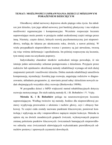 TEMAT: MOŻLIWOŚCI USPRAWNIANIA DZIECI Z MÓZGOWYM PORAŻENIEM DZIECIĘCYM Ośrodkowy układ nerwowy dojrzewa około piątego roku życia. Im młodsze jest dziecko, tym jego układ nerwowy jest bardziej plastyczny i ma większe możliwości regeneracyjne i kompensacyjne. Wcześnie rozpoczęte leczenie usprawniające może pomóc w przejęciu zadań uszkodzonej części mózgu przez inną. Niestety, często dzieci, których rozwój psychomotoryczny jest nieprawidłowy, trafiają do lekarza po ukończeniu roku, dwóch, a nawet później. W wielu przypadkach nieprawidłowe wzorce i postawy są już utrwalone, tworzą się więc wtórne deformacje i upośledzenia. Im później rozpoczyna się leczenie, tym mniej szans na uzyskanie poprawy. Indywidualny charakter skutków uszkodzeń mózgu powoduje, iż nie istnieje jeden uniwersalny schemat postępowania z dzieckiem. Przyjęcie przez rodziców lub opiekunów określonej metody rehabilitacji wymaga od nich dużej znajomości potrzeb i możliwości dziecka. Dobra metoda rehabilitacji umożliwia kompensację, stymulację i korektę jego rozwoju, angażując rodziców w diagnozowanie, układanie programów, tj. stawianie przed sobą i dzieckiem nowych zadań obejmujących wszystkie sfery rozwoju (Borkowska 1989b). W przypadku dzieci z MPD większość metod rehabilitacyjnych dotyczy rozwoju motorycznego. Do nich należą metody K. i B. Bobathów i V. Vojty. Metoda K. i B. Bobathów polega na neurorozwojowym leczeniu usprawniającym. Według twórców tej metody, bodźce dla nieprawidłowej postawy wypływają przeważnie z ułożenia i ruchów głowy, szyi i obręczy barkowej. Te części ciała zostały nazwane punktami kluczowymi, ponieważ kontrolują i wpływają na siłę i nieprawidłowe napięcie mięśni kończyn. Metoda ta opiera się na dwóch zasadniczych grupach ćwiczeń, wykonywanych poprzez zmianę położenia punktów kluczowych: ćwiczeniach hamujących nieprawidłowe odruchy oraz ćwiczeniach ułatwiających wykształcanie prawidłowych odruchów postawy i sprawnych czynności dowolnych. Pracę tą metodą rozpoczyna się od oceny wzorca ruchowego dziecka oraz występowania nieprawidłowych reakcji odruchowych. W metodzie Bobathów przyjmuje się, iż cała działalność ruchowa polega na odruchach i podczas jej kształtowania jedne odruchy ustępują miejsca innym. W związku z tym usprawnianie powinno rozwijać odruchy odpowiednie dla danego etapu fizjologicznego człowieka oraz hamować odruchy patologiczne przetrwałe. Podczas zajęć usprawniających dziecko wspierane przez terapeutę samodzielnie wykonuje ruchy. Usprawnianie ma dostarczać wrażeń poprawnego wykonywania ruchu i postawy. Jednocześnie metoda ta ma zapobiegać narastaniu spastyczności i atetozy. Odchodzi się tu od protezowania dzieci oraz operacji. W omawianej metodzie zasadniczą rolę odgrywają rodzice. Podkreśla się korzystny wpływ prawidłowych doznań uczuciowych i ruchowych na rozwój dziecka. Rodzice uczą się wykonywania z dzieckiem ćwiczeń, które kontynuują w domu. Leczenie dziecka rozpoczyna się już od 3-4 miesiąca życia i trwa 45 minut dziennie. Jak pisze Z. Kułakowska jest to czas niewystarczający, aby dziecko z MPD zaczęło wykorzystywać ćwiczony ruch w sytuacjach życia codziennego. Metoda V. Vojty ma na celu ułatwienie rozwoju pionowej postawy i reakcji równowagi poprzez wyzwalanie wzorców lokomocji odruchowej przez odruchy pojedynczych mięśni. Stan ruchowy dziecka z MPD traktuje się na równi ze stanem noworodka. Przyjmuje się, że przyczyną wystąpienia nieprawidłowości jest zablokowanie rozwoju odruchowego w najwcześniejszym stadium rozwoju. Technika rehabilitacji polega na stymulacji punktów refleksogennych. Stąd w czasie zajęć z dzieckiem stosuje się różnego rodzaju uciski i opory i uzyskuje się w ten sposób odpowiednie ruchy. W technikach metody pojawia się stabilizacja takich ułożeń dziecka, by podczas ćwiczeń poszczególna kończyna czy głowa pozostawała wolna, wykonując oczekiwany ruch. Za zakończenie usprawniania metodą V. Vojty przyjmuje się osiągnięcie przez dziecko stanu, w którym nastąpi u niego prawidłowe pełzanie i początek prawidłowego racz- kowania. Przewiduje się, iż te osiągnięcia pozwolą na normalne kształtowanie rozwoju na dalszych etapach. Metoda ta może być stosowana w warunkach domowych przez matkę przeszkoloną systemem ambulatoryjnym. Proponuje się ją małym dzieciom już od pierwszych dni życia, ale również jest przeznaczona dla dzieci starszych i osób dorosłych. Jednakże w metodzie V. Vojty pomija się uszkodzenie i jego lokalizację w mózgu, traktując wszystkie dzieci z MPD jak noworodki. Leczenie jest bierne, poza świadomością, motywacją i czynnością kory mózgowej. Duży nacisk jest kładziony na usprawnianie ruchowe, pomijając stronę emocjonalną i psychiczną dziecka. Formy ucisków i oporów stosowane podczas ćwiczeń są bolesne dla dzieci, co powoduje, iż ich reakcje psychiczne po zajęciach bywają bardzo silne i długotrwałe. Może stanowić to zagrożenie dla emocjonalnego rozwoju dziecka. Jak wynika z charakterystyki przedstawionych metod, usprawnianie jakie one proponują, dotyczy przede wszystkim rozwoju motorycznego rehabilitowanych dzieci. Kłopot w tym, iż dzieci z MPD wymagają usprawniania także innych niż sama motoryka zakresów działania. Uwzględniają to w swoich metodach A. Petö, G. Doman i J. Baran. Metoda A. Petö, inaczej nazywana nauczaniem kierowanym, jest przeznaczona dla dzieci z MPD w wieku przedszkolnym i szkolnym. Metoda ta łączy usprawnianie lecznicze, psychopedagogiczne i społeczne. Głównym celem jest osiągnięcie jak największej samodzielności przez dziecko. Ćwiczenia ruchowe i inne zajęcia połączone są z głośnym mówieniem, liczeniem lub śpiewaniem, tak więc metoda wykorzystuje proces integracji mowy z ruchem. Dzieci uczą się w małych grupach utworzonych wedłu