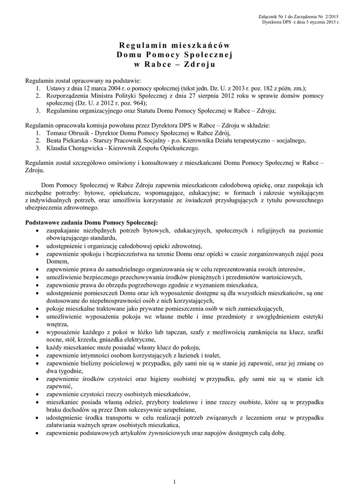 Regulamin mieszkańców Domu Pomocy Spolecznej w Rabce Zdroju