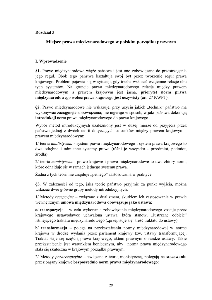 Rozdział 3 Miejsce prawa międzynarodowego w polskim porządku prawnym I. Wprowadzenie §1. Prawo międzynarodowe wiąże państwa i jest ono zobowiązane do przestrzegania jego reguł. Obok tego państwa kształtują swój byt przez tworzenie reguł prawa krajowego. Problem pojawia się w sytuacji, gdy trzeba wskazać wzajemne relacje obu tych systemów. Na gruncie prawa międzynarodowego relacja między prawem międzynarodowym a prawem krajowym jest jasna, priorytet norm prawa międzynarodowego wobec prawa krajowego jest oczywisty (art. 27 KWPT). §2. Prawo międzynarodowe nie wskazuje, przy użyciu jakich „technik” państwo ma wykonywać zaciągnięte zobowiązania; nie ingeruje w sposób, w jaki państwa dokonują introdukcji norm prawa międzynarodowego do prawa krajowego. Wybór metod introdukcyjnych uzależniony jest w dużej mierze od przyjęcia przez państwo jednej z dwóch teorii dotyczących stosunków między prawem krajowym i prawem międzynarodowym: 1/ teoria dualistyczna - system prawa międzynarodowego i system prawa krajowego to dwa odrębne i odmienne systemy prawa (różni je wszystko - przedmiot, podmiot, źródła). 2/ teoria monistyczna - prawo krajowe i prawo międzynarodowe to dwa zbiory norm, które odnajduje się w ramach jednego systemu prawa. Żadna z tych teorii nie znajduje „pełnego” zastosowania w praktyce. §3. W zależności od tego, jaką teorię państwo przyjmie za punkt wyjścia, można wskazać dwie główne grupy metody introdukcyjnych: 1/ Metody recepcyjne – związane z dualizmem, skutkiem ich zastosowania w prawie wewnętrznym umowa międzynarodowa obowiązuje jako ustawa: a/ transpozycja – w celu wykonania zobowiązania międzynarodowego zostaje przez krajowego ustawodawcę uchwalona ustawa, która stanowi „lustrzane odbicie” istniejącego traktatu międzynarodowego („przepisuje się” treść traktatu do ustawy); b/ transformacja – polega na przekształceniu normy międzynarodowej w normę krajową w drodze wydania przez parlament krajowy tzw. ustawy transformującej. Traktat staje się częścią prawa krajowego, aktem prawnym o randze ustawy. Takie przekształcenie jest warunkiem koniecznym, aby norma prawa międzynarodowego stała się skuteczna w krajowym porządku prawnym. 2/ Metody pozarecepcyjne – związane z teorią monistyczną, polegają na stosowaniu przez organy krajowe bezpośrednio norm prawa międzynarodowego: 29 a/ odesłanie – polega na odesłaniu w ustawie do postanowień umowy międzynarodowej („chyba, że umowa międzynarodowa stanowi inaczej” – wtedy stosuje się przepis umowy); b/ inkorporacja – polega na uznaniu bezpośredniej skuteczności międzynarodowych zobowiązań w krajowym porządku prawnym. Norma prawa międzynarodowego uznana jest za źródło praw i obowiązków podmiotów prawa krajowego (nie tylko organów państwa, ale również osób fizycznych i prawnych). W praktyce podział między teorią dualistyczną i monistyczna jest zatarty, dlatego też powszechnie spotyka się wykorzystywanie wszystkich wymienionych metod w praktyce jednego państwa. Jednocześnie rola prawa międzynarodowego jest obecnie tak istotna, że problem wzajemnych relacji prawa międzynarodowego i krajowego jest najczęściej regulowany w konstytucji. §4. Postanowienia Konstytucji RP z 1997 roku nie odnoszą się do wszystkich źródeł prawa międzynarodowego. Ustawodawca koncentruje swoją uwagę tylko na zobowiązaniach traktatowych, a nawet węziej, na traktatach ratyfikowanych (art. 87 ust. 1. KRP). Zgodnie z wolą ustawodawcy konstytucyjnego ratyfikowana umowa międzynarodowa jest samodzielnym, autonomicznym źródłem prawa polskiego, obok „klasycznych” krajowych źródeł prawa jak: konstytucja, ustawy czy rozporządzenia. Ustawodawca uznaje tym samym, że aby umowa bezpośrednio obowiązywała w porządku krajowym nie trzeba jej ujmować w klasyczną formę krajowego źródła prawa. §5. Art. 91 ust. 1 KRP wymienia trzy przesłanki sine qua non bezpośredniego stosowania umowy międzynarodowej przez sądy polskie: 1/ umowa musi być ratyfikowana – ratyfikowane umowy międzynarodowe nie są jednak zbiorem jednolitym, składają się nań zarówno traktaty ratyfikowane przez prezydenta za zgodą parlamentu wyrażoną w ustawie (tzw. „wielka” ratyfikacja - art. 89 ust. 1 KRP), jak i traktaty ratyfikowane przez prezydenta bez konieczności uzyskiwania takiej zgody („zwykła” ratyfikacja). Dla bezpośredniej skuteczności tryb ratyfikacji umowy nie ma znaczenia; 2/ umowa musi być ogłoszona w Dzienniku Ustaw – przed ogłoszeniem, nawet jeśli umowa będzie wiążąca na gruncie prawa międzynarodowego, nie może być bezpośrednio powoływana przed organami krajowymi; 3/ umowa nie może dla swego wykonania wymagać wydania ustawy – normy zawarte w umowie muszą być normami samowykonalnymi, co oznacza, że muszą być na tyle jasne i precyzyjne, by mogły być stosowane przez sądy krajowe – tzn. wprost uprawniać lub zobowiązywać określone podmioty, być samodzielną podstawą formułowanych przez nie roszczeń, a ponadto prawo krajowe musi zapewniać procedurę dochodzenia roszczeń wynikających z tej normy przed sądami krajowymi. §6. Konstytucja RP określa również pozycję umów międzynarodowych w hierarchii źródeł prawa krajowego, uzależniając ją od trybu, w jakim umowa została ratyfikowana. W przypadku umów ratyfikowanych w trybie art. 89 ust. 1 KRP („wielka” ratyfikacja), umowy te w hierarchii źródeł prawa znajdują się powyżej ustaw, 30 mając pierwszeństwo przed ustawą, jeśli ustawy nie da się pogodzić z umową (art. 91 ust. 2 KRP). Ustawodawca nie wskazuje co prawda miejsca pozostałych umów ratyfikowanych, jednakże a contrario wywieść można, że Konstytucja umiejscawia traktaty ratyfikowane bez zgody parlamentu poniżej ustawy (także art.89 ust. 1 pkt. 5 w zw. z art. 188 ust. 3 KRP). §7. Konstytucja precyzuje także pozycję u