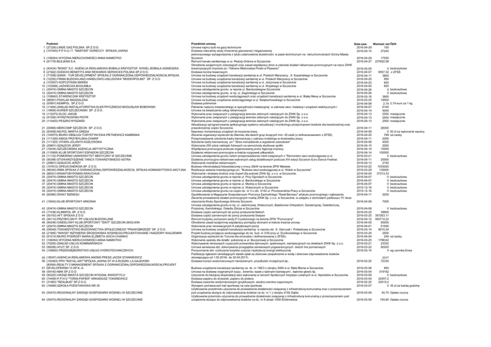 Wykaz umów ZWiK Sp. z o.o. (01.2016