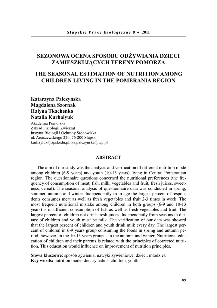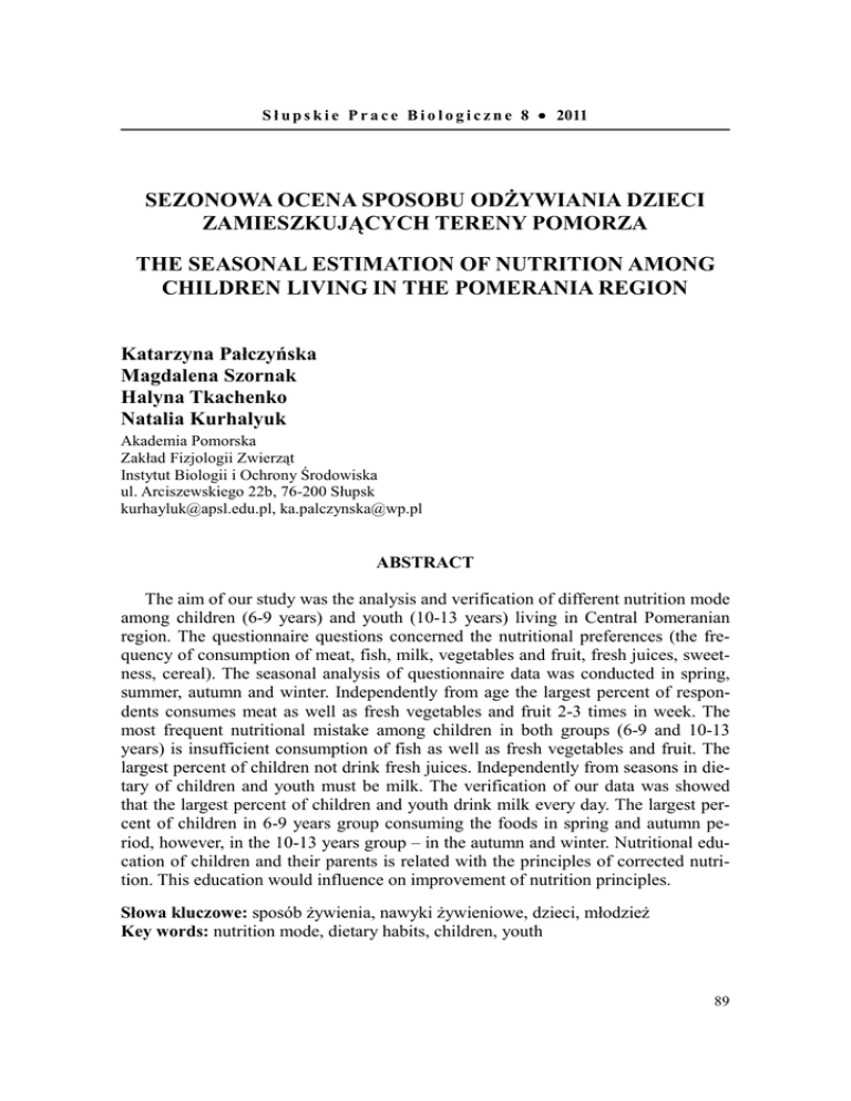 S ł u p s k i e P r a c e B i o l o g i c z n e 8 • 2011 SEZONOWA OCENA SPOSOBU ODŻYWIANIA DZIECI ZAMIESZKUJĄCYCH TERENY POMORZA THE SEASONAL ESTIMATION OF NUTRITION AMONG CHILDREN LIVING IN THE POMERANIA REGION Katarzyna Pałczyńska Magdalena Szornak Halyna Tkachenko Natalia Kurhalyuk Akademia Pomorska Zakład Fizjologii Zwierząt Instytut Biologii i Ochrony Środowiska ul. Arciszewskiego 22b, 76-200 Słupsk [email protected], [email protected] ABSTRACT The aim of our study was the analysis and verification of different nutrition mode among children (6-9 years) and youth (10-13 years) living in Central Pomeranian region. The questionnaire questions concerned the nutritional preferences (the frequency of consumption of meat, fish, milk, vegetables and fruit, fresh juices, sweetness, cereal). The seasonal analysis of questionnaire data was conducted in spring, summer, autumn and winter. Independently from age the largest percent of respondents consumes meat as well as fresh vegetables and fruit 2-3 times in week. The most frequent nutritional mistake among children in both groups (6-9 and 10-13 years) is insufficient consumption of fish as well as fresh vegetables and fruit. The largest percent of children not drink fresh juices. Independently from seasons in dietary of children and youth must be milk. The verification of our data was showed that the largest percent of children and youth drink milk every day. The largest percent of children in 6-9 years group consuming the foods in spring and autumn period, however, in the 10-13 years group – in the autumn and winter. Nutritional education of children and their parents is related with the principles of corrected nutrition. This education would influence on improvement of nutrition principles. Słowa kluczowe: sposób żywienia, nawyki żywieniowe, dzieci, młodzież Key words: nutrition mode, dietary habits, children, youth 89 WPROWADZENIE Wiele przemawia za tym, że wydłużenie życia, którego może spodziewać się człowiek współczesny w stosunku do człowieka w tym samym wieku żyjącego przed 100 czy 200 laty, jest częściowo wynikiem poprawy warunków żywienia, likwidacji lub zmniejszenia niedoborów pokarmowych, ilościowych i jakościowych (Michaelsen 2000, Dare, O’Donowan 2002). Sposób żywienia dzieci i młodzieży jest jednym z decydujących czynników, wpływających na rozwój fizyczny, utrzymanie równowagi psychiczno-nerwowej, a przez to uzyskiwanie lepszych wyników w nauce. Dzieci i młodzież stanowią tę grupę ludności, u której nawet niewielkie wady w żywieniu, ale trwające dłuższy czas, mogą wpłynąć w sposób niekorzystny na prawidłowy wzrost, rozwój oraz odporność organizmu. Od dawna wiązano różnice w rozwoju intelektualnym dzieci pochodzących z różnych rejonów świata z warunkami ich żywienia w okresie życia płodowego, we wczesnym okresie pourodzeniowym oraz dzieciństwie (Ziemiański 1998). Wiadomo, że rozpoczęcie nauki w szkole wprowadza ważne zmiany w stylu życia i sposobie żywienia. Wiek szkolny jest okresem fizycznego i umysłowego rozwoju dziecka. Wraz z rozpoczęciem nauki w szkole sposób odżywiania się dzieci zwykle ulega jednak pogorszeniu (Holden i in. 2000, Dare, O’Donowan 2002). Młodzież w tym wieku jest skłonna do ulegania fałszywym opiniom i praktykom żywieniowym. Chłopcy często w dużych ilościach spożywają chleb i tłuste gatunki mięsa oraz wędlin, które w ich mniemaniu mają wzmóc siłę i przydać im męskości. Z kolei dziewczęta, chcąc mieć szczupłą sylwetkę, zaniedbują spożywanie podstawowych produktów, takich jak: ziemniaki, pieczywo, mleko, i podjadają słodycze i różne modne artykuły, jak np. frytki, prażynki czy chipsy (Hasik, Gawęcki 2003). Intensywnie rozwijający się organizm młodych ludzi jest szczególnie wrażliwy na deficyt energii i składników odżywczych. Niepoprawny sposób odżywiania prowadzi do niedoborów energii, witamin (m.in. B12 i D), pełnowartościowego białka, wapnia, żelaza, cynku, a w konsekwencji do zahamowania wzrostu, rozwoju umysłowego, pogorszenia stanu zdrowia i samopoczucia (Holden i in. 2000, Michaelsen 2000, Dare, O’Donowan 2002, Marotz 2008). Niedożywienie, jakościowe niedobory pokarmowe i przekarmienie stanowią zagrożenie dla przetrwania człowieka, uniemożliwiają jego prawidłowy rozwój psychofizyczny, zmniejszają szansę długiego życia, zwiększają podatność na różne choroby oraz obniżają ogólną aktywność życiową i zdolność do pracy. Stwierdzono w wielu badaniach bezpośredni wpływ diety na metabolizm tkanki mózgowej, rozwój podstawowych funkcji ośrodkowego układu nerwowego, warunkujących m.in. sprawność intelektualną człowieka (Holden i in. 2000, Michaelsen 2000, Dare, O’Donowan 2002, Marotz 2008). Dzieci w wieku 6-9 lat, uczęszczające do pierwszych trzech klas szkoły podstawowej, charakteryzują się wolniejszym tempem rozwoju fizycznego. Dzieci te więcej czasu spędzają w pozycji siedzącej. Mają one mniejsze zapotrzebowanie na energię i często mniejszy apetyt. Należy w związku z tym w ich posiłkach uwzględnić w większej ilości produkty łatwo strawne oraz mające odpowiednią zawartość składników budulcowych i regulujących (Holden i in. 2000, Michaelsen 2000, Dare, 90 O’Donowan 2002, Marotz 2008). Ze względu na wykształcanie się w tym okresie zębów ważna jest odpowiednia dawka wapnia, fosforu, magnezu i fluoru, których dostarczają ryby morskie, zielone warzywa liściaste, a przede wszystkim produkty mleczne (Holden i in. 2000, Hasik, Gawęcki 2003). U dzieci w wieku 10-13 lat następuje przyspieszenie rozwoju fizycznego i umysłowego, któremu towarzyszy wzrost aktywności ruchowej. Ponieważ prowadzą bardziej aktywny tryb życia, dlatego znacznie wyższe są dla nich dzienne normy składników energetycznych, budulcowych, witamin (Michaelsen 2000). W ich posiłkach oprócz mleka, jaj, serów, mi