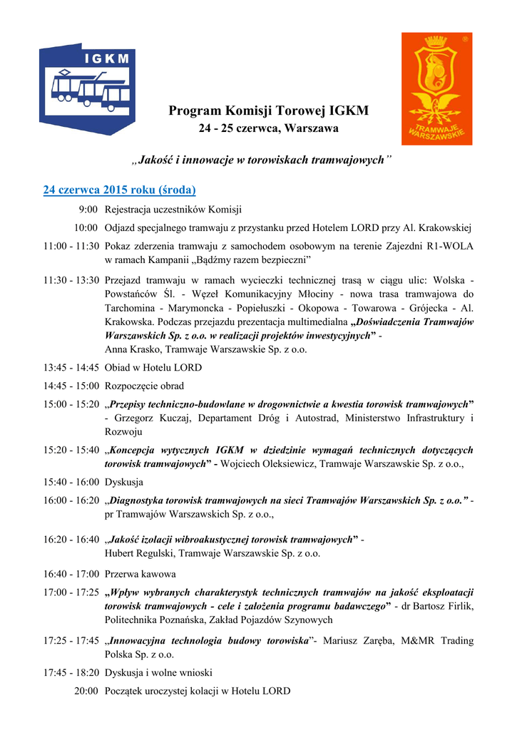 Program Komisji Torowej IGKM 24 - 25 czerwca, Warszawa „Jakość i innowacje w torowiskach tramwajowych” 24 czerwca 2015 roku (środa) 9:00 Rejestracja uczestników Komisji 10:00 Odjazd specjalnego tramwaju z przystanku przed Hotelem LORD przy Al. Krakowskiej 11:00 - 11:30 Pokaz zderzenia tramwaju z samochodem osobowym na terenie Zajezdni R1-WOLA w ramach Kampanii „Bądźmy razem bezpieczni” 11:30 - 13:30 Przejazd tramwaju w ramach wycieczki technicznej trasą w ciągu ulic: Wolska Powstańców Śl. - Węzeł Komunikacyjny Młociny - nowa trasa tramwajowa do Tarchomina - Marymoncka - Popiełuszki - Okopowa - Towarowa - Grójecka - Al. Krakowska. Podczas przejazdu prezentacja multimedialna „Doświadczenia Tramwajów Warszawskich Sp. z o.o. w realizacji projektów inwestycyjnych” Anna Krasko, Tramwaje Warszawskie Sp. z o.o. 13:45 - 14:45 Obiad w Hotelu LORD 14:45 - 15:00 Rozpoczęcie obrad 15:00 - 15:20 „Przepisy techniczno-budowlane w drogownictwie a kwestia torowisk tramwajowych” - Grzegorz Kuczaj, Departament Dróg i Autostrad, Ministerstwo Infrastruktury i Rozwoju 15:20 - 15:40 „Koncepcja wytycznych IGKM w dziedzinie wymagań technicznych dotyczących torowisk tramwajowych” - Wojciech Oleksiewicz, Tramwaje Warszawskie Sp. z o.o., 15:40 - 16:00 Dyskusja 16:00 - 16:20 „Diagnostyka torowisk tramwajowych na sieci Tramwajów Warszawskich Sp. z o.o.” pr Tramwajów Warszawskich Sp. z o.o., 16:20 - 16:40 „Jakość izolacji wibroakustycznej torowisk tramwajowych” Hubert Regulski, Tramwaje Warszawskie Sp. z o.o. 16:40 - 17:00 Przerwa kawowa 17:00 - 17:25 „Wpływ wybranych charakterystyk technicznych tramwajów na jakość eksploatacji torowisk tramwajowych - cele i założenia programu badawczego” - dr Bartosz Firlik, Politechnika Poznańska, Zakład Pojazdów Szynowych 17:25 - 17:45 „Innowacyjna technologia budowy torowiska”- Mariusz Zaręba, M&MR Trading Polska Sp. z o.o. 17:45 - 18:20 Dyskusja i wolne wnioski 20:00 Początek uroczystej kolacji w Hotelu LORD 25 czerwca 2015 roku (czwartek) 7:30 - 9:30 Śniadanie 10:00 - 10:20 „Przedstawienie wyników z przeprowadzonych testów) eksploatacyjnych szyny utwardzonej o podwyższonej wytrzymałości produkcji voestalpine z Austrii” Paweł Pazdro, voestalpine Railway Systems Polska Sp. z o.o. 10:20 - 10:40 „Innowacyjne rozwiązania w rozprowadzaniu i ochronie kabli” Beata Szulfer-Rosiak, ASTE Sp. z o.o. 10:40 - 11:10 Przerwa kawowa 11:10 - 11:30 „Kryteria badania elastycznych wkładek komorowych. Uwagi na temat problematyki związanej ze spoinowaniem” -Teresa Wiśniewska, HET Elastomertechnik GmbH 11:30 - 11:50 „Dwutorowa frezerka do reprofilacji szyn firmy STRABAG” Georg Dobrowolski, STRABAG Rail GmbH 11:50 - 12:30 Dyskusja i podsumowanie obrad 13:00 - 14:00 Obiad i zakończenie obrad Komisji WSPÓŁORGANIZATOR KOMISJI: PARTNERZY KOMISJI: