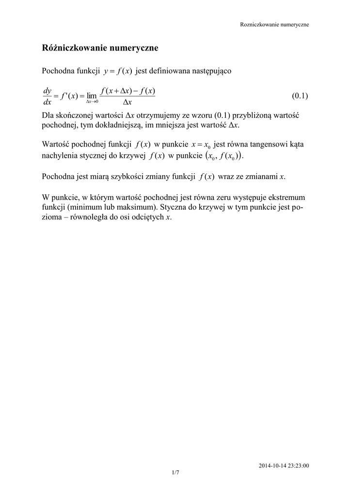 Rozniczkowanie numeryczne Różniczkowanie numeryczne Pochodna funkcji y f (x) jest definiowana następująco dy f ( x x) f ( x) f ' ( x) lim x0 dx x (0.1) Dla skończonej wartości Δx otrzymujemy ze wzoru (0.1) przybliżoną wartość pochodnej, tym dokładniejszą, im mniejsza jest wartość Δx. Wartość pochodnej funkcji f (x) w punkcie x x0 jest równa tangensowi kąta nachylenia stycznej do krzywej f (x) w punkcie x0 , f ( x0 ) . Pochodna jest miarą szybkości zmiany funkcji f (x) wraz ze zmianami x. W punkcie, w którym wartość pochodnej jest równa zeru występuje ekstremum funkcji (minimum lub maksimum). Styczna do krzywej w tym punkcie jest pozioma – równoległa do osi odciętych x. 2014-10-14 23:23:00 1/7 Rozniczkowanie numeryczne 2014-10-14 23:23:00 2/7 Rozniczkowanie numeryczne 1. Różniczkowanie numeryczne - przypadek ciągły Dane: y f ( x) (1.1) oraz h 0 , gdzie h x xi1 xi Pochodna prawostronna f(x) w punkcie x0 f ' x0 f x0 h f x0 h (1.2) Pochodna lewostronna f(x) w punkcie x0 f ' x0 f x0 f x0 h h (1.3) Pochodna centralna f(x) w punkcie x0 f ' x0 f x0 h f x0 h 2h (1.4) 2014-10-14 23:23:00 3/7 Rozniczkowanie numeryczne 2. Różniczkowanie numeryczne - przypadek dyskretny Dane: x0, x1, ..., xn (2.1) oraz y0 = f(x0), y1 = f(x1), ..., yn = f(xn) (2.2) gdzie xi1 xi h dla i 0, 1, , n (2.3) Pochodna prawostronna f ' xi f xi 1 ) f ( xi f xi h f ( xi ) xi 1 xi h (2.4) Pochodna lewostronna 2014-10-14 23:23:00 4/7 Rozniczkowanie numeryczne f ' xi f xi ) f ( xi 1 f xi f ( xi h) xi xi 1 h (2.5) Pochodna centralna f ' xi f xi 1 ) f ( xi 1 f xi h f ( xi h) xi 1 xi 1 2h (2.6) 3. Różniczkowanie numeryczne - rozwinięcie funkcji w szereg Taylora Funkcję y(x) rozwijamy w otoczeniu punktu xi h2 h3 yi1 yi h yi yi yi 2! 3! (3.1) h2 h3 yi1 yi h yi yi yi 2! 3! (3.2) Po podzieleniu wzorów (3.1) i (3.2) przez h otrzymujemy yi 1 yi h h2 yi yi yi h 2! 3! (3.3) yi yi 1 h h2 yi yi yi h 2! 3! (3.4) Po zsumowaniu równań (3.3) i (3.4) i podzieleniu wyniku stronami przez 2 dostajemy yi 1 yi 1 h2 yi yi 2h 3! (3.5) Gdy uwzględnimy tylko pierwsze wyrazy prawych stron równań (3.3) - (3.5) otrzymujemy kolejno - iloraz różnicowy przedni (przybliżenie pochodnej prawostronnej) yi yi 1 yi h e o(h) (3.6) - iloraz różnicowy wsteczny (przybliżenie pochodnej lewostronnej) 2014-10-14 23:23:00 5/7 Rozniczkowanie numeryczne yi yi yi 1 h e o(h) (3.7) - iloraz różnicowy centralny (przybliżenie pochodnej centralnej) yi yi 1 yi 1 2h e o( h 2 ) (3.8) Ilorazy różnicowe przedni i wsteczny mają dokładność pierwszego rzędu, natomiast iloraz różnicowy centralny ma dokładność drugiego rzędu. 4. Ilorazy różnicowe dla pochodnych wyższych rzędów Iloraz różnicowy przedni yi 2 yi 1 yi 1 yi yi1 yi y 2 yi 1 yi h h yi i2 h h h2 (4.1) Iloraz różnicowy wsteczny yi yi 1 yi 1 yi 2 yi yi1 y 2 yi 1 yi 2 h h yi i h h h2 (4.2) Iloraz różnicowy centralny yi yi1 / 2 yi1 / 2 h yi 1 yi yi yi 1 y 2 yi yi 1 h h i 1 h h2 (4.3) 5. Różniczkowanie numeryczne – zastosowanie interpolacji Dane: x0, x1, ..., xn (5.1) oraz y0 = f(x0), y1 = f(x1), ..., yn = f(xn) (5.2) Postać funkcji y = f(x) jest lub nie jest znana. Zakładamy, że funkcja ta ma pochodne aż do rzędu n + 1 w przedziale (a, b) zawierającym punkty x0, x1, ..., xn. 2014-10-14 23:23:00 6/7 Rozniczkowanie numeryczne Należy obliczyć pochodne funkcji różnych rzędów w przedziale xmin x xmax , gdzie xmin = min xi oraz xmax = max xi. Zadanie to można rozwiązać w sposób przybliżony poprzez znalezienie wielomianu interpolacyjnego F(x) i założenie, że f k ( x) Fk ( x) (5.3) Błąd bezwzględny tej metody można oszacować tylko dla węzłów interpolacji wykorzystując poniższe twierdzenie. TWIERDZENIE 1 Jeżeli w przedziale (a, b) f n 1 x M gdzie M jest stałą, to f k M dk x x0 x x1 x xn xi F xi n 1! dx k x xi k (5.4) 2014-10-14 23:23:00 7/7
