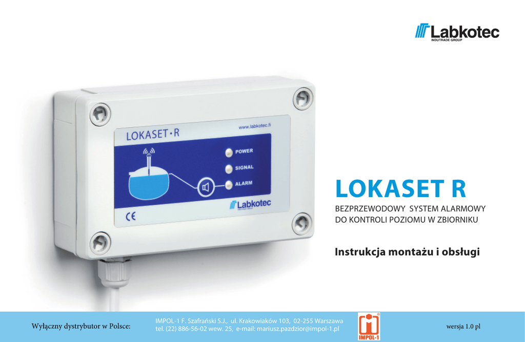 LOKASET R BEZPRZEWODOWY SYSTEM ALARMOWY DO KONTROLI POZIOMU W ZBIORNIKU Instrukcja montażu i obsługi Wyłączny dystrybutor w Polsce: IMPOL-1 F. Szafrański S.J., ul. Krakowiaków 103, 02-255 Warszawa tel. (22) 886-56-02 wew. 25, e-mail: [email protected] wersja 1.0 pl Spis treści 1. Wprowadzenie 2. Zasada działania 3. Montaż 4. Tryb pracy 5. Serwisowanie i naprawa 6. Alarmy 7. Specyfikacja techniczna 2 LOKASET R | Instrukcja montażu i obsługi 3 4 5 7 8 9 10 | IMPOL-1 F. Szafrański S.J., ul. Krakowiaków 103, 02-255 Warszawa tel. (22) 886-56-02 wew. 25, e-mail: [email protected] 1. Wprowadzenie Lokaset R jest przeznaczony do stosowania jako system alarmowy do sygnalizacji przekroczenia ustalonego poziomu cieczy w zbiornikach. Może być używany na przykład do wskazania zbiorników asenizacyjnych lub zapełnienia zamkniętych przepompowni. Lokaset R wyposażony jest w optyczną i akustyczną sygnalizację alarmową oraz wyjście przekaźnikowe które można wykożystać do sterowania innym elementem sygnalizacyjnym lub podłączyć do innego systemu alarmowego. Urządzenie Lokaset R składa się z jednostki centralnej (1), nadajnika (2) i sondy (3). Jednostka centralna jest wykorzystywana do sterowania i monitorowania pracy urządzenia. Załączony nadajnik wysyła sygnał alarmowy bezprzewodowo z sondy do jednostki centralnej. 1 2 Lokaset R może być montowany w nowych i istniejących zbiornikach bez konieczności przeprowadzania robót ziemnych. Instrukcja w formie elektronicznej jest dostępna do ściągnięcia z naszej strony internetowej pod adresem: www.impol-1.pl IMPOL-1 F. Szafrański S.J., ul. Krakowiaków 103, 02-255 Warszawa tel. (22) 886-56-02 wew. 25, e-mail: [email protected] 3 LOKASET R | Instrukcja montażu i obsługi | 3 2. Zasada działania 1 5 4 Lokaset R stosuje się jako alarm sygnalizujący asenizacyjnego. zapełnienie zbiornika Zasada działania: gdy sonda wejdzie w kontakt z płynem, nadajnik przesyła sygnał do jednostki centralna Lokaset R. Sygnał jest wysyłany co 10 minut lub co 30 sekund (definiowane przez użytkownika ), a alarm jest uruchamiany wtedy gdy nastąpi stały kontakt sondy z cieczą które będzie trwało przez dwa kolejne powiadomienia wysyłane z nadajnika do jednostki centralnej. Funkcja ta zapobiega generowaniu podczas przypadkowego zachlapania sondy. alarmu Jednostki centralna (1) ogłasza alarm za pomocą sygnału dźwiękowego i wskaźnika świetlnego (2). Sygnał dźwiękowy można wyłączyć przez przycisk zerowania alarmu (3). Tryb alarmowy może zostać wyłączony poprzez opróżnianie zbiornika. Sonda powinna być zamontowana w zbiorniku na wysokości alarmowej dla poziomu cieczy. 3 Jednostka centralna jest podłączona do sieci elektrycznej (230 V). Gdy zasilanie jest podłączone, zielona kontrolka zasilania (4) i wskaźnik sygnału radiowy (5) są włączone. Nadajnik jest zasilany z baterii. Bateria jest dostarczana wraz z urządzeniem. W normalnych warunkach eksploatacji maksymalny czas pracy na baterii wynosi 10 lat lub ok. 2 lat w przypadku 30-sekundowych odstępów wysyłania. Jednostka centralna włącza alarm, gdy przekaźnik pozostaje bez zasilania lub bateria wymaga wymiany. 2 Sonda w urządzeniu Lokaset R (SET/LV) nie nadaje się do pomiaru cieczy wybuchowych lub żrących. 4 LOKASET R | Instrukcja montażu i obsługi | IMPOL-1 F. Szafrański S.J., ul. Krakowiaków 103, 02-255 Warszawa tel. (22) 886-56-02 wew. 25, e-mail: [email protected] 3. Montaż Jednostka centralna Lokaset R (Rys. 1) jest przystosowana do montażu w suchym, zamkniętym pomieszczeniu. Nie należy zasłaniać niczym jednostki centralnej, gdyż może to zakłócać odbiór sygnału z nadajnika. Jednostka centralna Lokaset R montuje się na ścianie śrubami przechodzącymi przez otwory w dolnej części urządzenia. Pokrywa obudowy musi być otwarta na czas montażu. Urządzenie jest podłączone do sieci elektrycznej 230 V poprzez przewód zasilający. Działanie próbnika i nadajnika powinno być przetestowane podczas montażu w celu zapewnienia swobodnego zasięgu dla sygnału radiowego. Włączyć tryb testowy nadajnika (patrz rozdział "Serwisowanie i naprawa", s. 8). Zanurzyć głowicę pomiarową na chwilę w wodzie. Jeśli jednostka centralna działa, niebieskie światło (sygnał) powinno wyłączać się co 8 sekund, a alarm powinien włączyć się w przeciągu 8 sekund. Montaż nadajnika Lokaset R jest przedstawiony na stronie obok. Nadajnik jest montowany na pokrywie (1) na wyjściu zbiornika przy użyciu dostarczonych śrub (2) - 4 sztuki o rozmiarze 2,9–3 x 25 mm. Rys. 1. Podłączyć przewody próbnika do zacisków śrubowych (5) w nadajniku płytki drukowanej. Biegunowość połączeń kabla nie ma znaczenia dla pracy urządzenia. Dokręcić dławicę kablową próbnika (6). Założyć opaskę zaciskową powyżej dławnicy jako zacisk kabla. Umieścić dołączoną baterię CR123A, w komorze baterii (7), tak aby biegun dodatni ( +) był skierowany w górę. Prawidłowy montaż kabla próbnika i baterii znajduje się na rysunku na stronie 8. Umieścić gumową uszczelkę (3) pomiędzy nadajnikiem a pokrywą. Pokrywa nadajnika podczas montażu musi pozostać otwarta. Dla kabla (4) lub dla całego próbnika należy stworzyć przejście w pokrywie zbiornika. IMPOL-1 F. Szafrański S.J., ul. Krakowiaków 103, 02-255 Warszawa tel. (22) 886-56-02 wew. 25, e-mail: [email protected] LOKASET R | Instrukcja montażu i obsługi | 5 9 10 6 5 8 7 2 4 3 1 11 6 LOKASET R | Instrukcja montażu i obsługi | Za pomocą zworki na płytce drukowanej nadajnika można wybrać, jak często będzie wysyłany sygnał z nadajnika do jednostki centralnej. Gdy zworka jest założona na dwa piny, sygnał jest wysyłany co 30 sekund, a kiedy jest założona na jeden pin lub nie ma jej wcale , sygnał jest wysyłany co 10 minut. W przypadku zmiany ustawienia zworki nadajnik i jednostka centralna muszą zostać sparowane ponownie (patrz: pkt 5: " Serwis