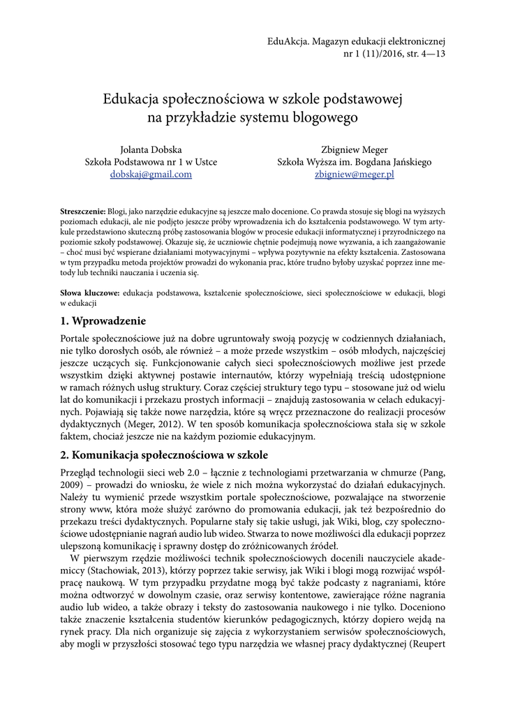 EduAkcja. Magazyn edukacji elektronicznej nr 1 (11)/2016, str. 4—13 Edukacja społecznościowa w szkole podstawowej na przykładzie systemu blogowego Jolanta Dobska Szkoła Podstawowa nr 1 w Ustce [email protected] Zbigniew Meger Szkoła Wyższa im. Bogdana Jańskiego [email protected] Streszczenie: Blogi, jako narzędzie edukacyjne są jeszcze mało docenione. Co prawda stosuje się blogi na wyższych poziomach edukacji, ale nie podjęto jeszcze próby wprowadzenia ich do kształcenia podstawowego. W tym artykule przedstawiono skuteczną próbę zastosowania blogów w procesie edukacji informatycznej i przyrodniczego na poziomie szkoły podstawowej. Okazuje się, że uczniowie chętnie podejmują nowe wyzwania, a ich zaangażowanie – choć musi być wspierane działaniami motywacyjnymi – wpływa pozytywnie na efekty kształcenia. Zastosowana w tym przypadku metoda projektów prowadzi do wykonania prac, które trudno byłoby uzyskać poprzez inne metody lub techniki nauczania i uczenia się. Słowa kluczowe: edukacja podstawowa, kształcenie społecznościowe, sieci społecznościowe w edukacji, blogi w edukacji 1. Wprowadzenie Portale społecznościowe już na dobre ugruntowały swoją pozycję w codziennych działaniach, nie tylko dorosłych osób, ale również – a może przede wszystkim – osób młodych, najczęściej jeszcze uczących się. Funkcjonowanie całych sieci społecznościowych możliwe jest przede wszystkim dzięki aktywnej postawie internautów, którzy wypełniają treścią udostępnione w ramach różnych usług struktury. Coraz częściej struktury tego typu – stosowane już od wielu lat do komunikacji i przekazu prostych informacji – znajdują zastosowania w celach edukacyjnych. Pojawiają się także nowe narzędzia, które są wręcz przeznaczone do realizacji procesów dydaktycznych (Meger, 2012). W ten sposób komunikacja społecznościowa stała się w szkole faktem, chociaż jeszcze nie na każdym poziomie edukacyjnym. 2. Komunikacja społecznościowa w szkole Przegląd technologii sieci web 2.0 – łącznie z technologiami przetwarzania w chmurze (Pang, 2009) – prowadzi do wniosku, że wiele z nich można wykorzystać do działań edukacyjnych. Należy tu wymienić przede wszystkim portale społecznościowe, pozwalające na stworzenie strony www, która może służyć zarówno do promowania edukacji, jak też bezpośrednio do przekazu treści dydaktycznych. Popularne stały się takie usługi, jak Wiki, blog, czy społecznościowe udostępnianie nagrań audio lub wideo. Stwarza to nowe możliwości dla edukacji poprzez ulepszoną komunikację i sprawny dostęp do zróżnicowanych źródeł. W pierwszym rzędzie możliwości technik społecznościowych docenili nauczyciele akademiccy (Stachowiak, 2013), którzy poprzez takie serwisy, jak Wiki i blogi mogą rozwijać współpracę naukową. W tym przypadku przydatne mogą być także podcasty z nagraniami, które można odtworzyć w dowolnym czasie, oraz serwisy kontentowe, zawierające różne nagrania audio lub wideo, a także obrazy i teksty do zastosowania naukowego i nie tylko. Doceniono także znaczenie kształcenia studentów kierunków pedagogicznych, którzy dopiero wejdą na rynek pracy. Dla nich organizuje się zajęcia z wykorzystaniem serwisów społecznościowych, aby mogli w przyszłości stosować tego typu narzędzia we własnej pracy dydaktycznej (Reupert Jolanta Dobska, Zbigniew Meger, Edukacja społecznościowa w szkole podstawowej... i Dalgarno, 2011). Stwierdzono, że wysoko wykwalifikowany personel wykorzystuje dzisiaj powszechnie nowe narzędzia społecznościowe. Według doniesień w literaturze dotyczyć to może nawet 64 % sytuacji dydaktycznych, w których stosuje się rozwiązania bazujące na sieciach Web 2.0 (Cheal, 2011). Nauczyciele pracujący w ten sposób zwracają uwagę, że wiele tego typu rozwiązań wymaga jeszcze solidnej podbudowy pedagogicznej. 3. Blogi w procesach dydaktycznych Blogi są rodzajem strony internetowej, zawierającej chronologiczne wpisy właściciela bloga. Początkowo blogi miały charakter pamiętników, ale obecnie zakres przedstawianych w nich treści znacznie się rozszerzył. O ile wcześniej blogi pisane były przede wszystkim w pierwszej osobie, dzisiaj mogą one występować w dowolnej osobie, a przy tym omawiać praktycznie każdy temat. Uruchomienie usługi typu blog nie stanowi aktualnie problemu, a poprzez dostępne mechanizmy (np. w systemach CMS) można to zrobić nawet na prywatnym serwerze. Niekiedy razem z blogami dostępne są specjalizowane usługi, które rozszerzają możliwości blogowania. Należy tu wymienić między innymi audioblogi (z nagraniami dźwiękowymi), fotoblogi (ze zdjęciami) i wideoblogi (filmy). Blogi mogą być też połączone z innymi elementami sieci (linklogi), a jeżeli są one pisane na zlecenie, mamy do czynienia z flogiem. Blogi można też dzielić przyjmując inne kryteria, np. kryteria poruszanych treści lub tematów, liczby autorów, rodzaju zadania albo częstotliwość publikacji (Trojnar, 2010). Blogi coraz częściej wykorzystywane są w procesach edukacyjnych (Polcyn-Matuszewska, 2014). Nierzadko wykorzystuje się je w kształceniu językowym (Świerczyńska-Kaczor, 2009; Istifci, 2011; Ying et al., 2013). Niekiedy łączy się blogi z tworzonym przez uczniów portfolio (Chuang, 2010). Często wykorzystuje się tego typu narzędzia do komunikacji pomiędzy różnymi szkołami, a nawet krajami o różnych kulturach (Choi, 2007). W ten sposób można na przykład dokumentować międzynarodowe projekty międzyszkolne (Herrera i Casado, 2015). Jednak w większości przypadków działania tego typu realizowane są na uczelniach lub w szkołach wyższych szczebli – w gimnazjach oraz liceach. Praktycznie rzadko spotyka się wykorzystania narzędzi typu blog do prowadzenia rzeczywistych procesów dydaktycznych. W Polsce dosyć wcześnie dostrzeżono wartości blogów, jako narzędz