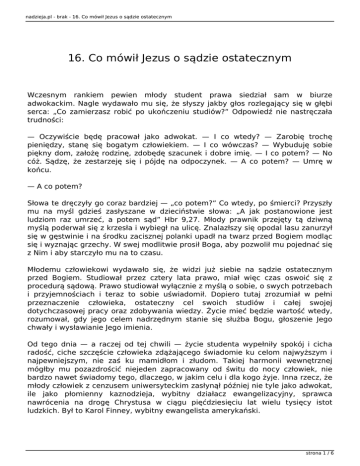 nadzieja.pl - brak - 16. Co mówił Jezus o sądzie ostatecznym 16. Co mówił Jezus o sądzie ostatecznym Wczesnym rankiem pewien młody student prawa siedział sam w biurze adwokackim. Nagle wydawało mu się, że słyszy jakby głos rozlegający się w głębi serca: „Co zamierzasz robić po ukończeniu studiów?” Odpowiedź nie nastręczała trudności: — Oczywiście będę pracował jako adwokat. — I co wtedy? — Zarobię trochę pieniędzy, stanę się bogatym człowiekiem. — I co wówczas? — Wybuduję sobie piękny dom, założę rodzinę, zdobędę szacunek i dobre imię. — I co potem? — No cóż. Sądzę, że zestarzeję się i pójdę na odpoczynek. — A co potem? — Umrę w końcu. — A co potem? Słowa te dręczyły go coraz bardziej — „co potem?” Co wtedy, po śmierci? Przyszły mu na myśl gdzieś zasłyszane w dzieciństwie słowa: „A jak postanowione jest ludziom raz umrzeć, a potem sąd” Hbr 9,27. Młody prawnik przejęty tą dziwną myślą poderwał się z krzesła i wybiegł na ulicę. Znalazłszy się opodal lasu zanurzył się w gęstwinie i na środku zacisznej polanki upadł na twarz przed Bogiem modląc się i wyznając grzechy. W swej modlitwie prosił Boga, aby pozwolił mu pojednać się z Nim i aby starczyło mu na to czasu. Młodemu człowiekowi wydawało się, że widzi już siebie na sądzie ostatecznym przed Bogiem. Studiował przez cztery lata prawo, miał więc czas oswoić się z procedurą sądową. Prawo studiował wyłącznie z myślą o sobie, o swych potrzebach i przyjemnościach i teraz to sobie uświadomił. Dopiero tutaj zrozumiał w pełni przeznaczenie człowieka, ostateczny cel swoich studiów i całej swojej dotychczasowej pracy oraz zdobywania wiedzy. Życie mieć będzie wartość wtedy, rozumował, gdy jego celem nadrzędnym stanie się służba Bogu, głoszenie Jego chwały i wysławianie Jego imienia. Od tego dnia — a raczej od tej chwili — życie studenta wypełniły spokój i cicha radość, ciche szczęście człowieka zdążającego świadomie ku celom najwyższym i najpewniejszym, nie zaś ku mamidłom i złudom. Takiej harmonii wewnętrznej mógłby mu pozazdrościć niejeden zapracowany od świtu do nocy człowiek, nie bardzo nawet świadomy tego, dlaczego, w jakim celu i dla kogo żyje. Inna rzecz, że młody człowiek z cenzusem uniwersyteckim zasłynął później nie tyle jako adwokat, ile jako płomienny kaznodzieja, wybitny działacz ewangelizacyjny, sprawca nawrócenia na drogę Chrystusa w ciągu pięćdziesięciu lat wielu tysięcy istot ludzkich. Był to Karol Finney, wybitny ewangelista amerykański. strona 1 / 6 nadzieja.pl - brak - 16. Co mówił Jezus o sądzie ostatecznym Co Jezus powiedział na temat sądu? Przede wszystkim oznajmił, że na sądzie odpowiedzialność obejmuje każde słowo, myśl, czyn, każdy wybór drogi życiowej, wszystko, gdyż takie jest prawo panujące we wszechświecie. Dzień sądu nadejdzie. Jezus nauczał tego z przekonaniem. Rozważając te słowa zatrzymajmy się myślą przy miastach, o których w Ewangelii Mateusza jest powiedziane: „Biada tobie, Chorazynie, biada tobie, Betsaido, bo gdyby w Tyrze i Sydonie działy się te cuda, które u was się stały, dawno by w worze i w popiele pokutowały. Ale powiadam wam: Lżej będzie Tyrowi i Sydonowi w dniu sądu aniżeli wam. A ty, Kafarnaum, czy aż do nieba wywyższone będziesz? Aż do piekła zostaniesz strącone, bo gdyby się w Sodomie dokonały te cuda, które się stały u ciebie, stałaby jeszcze po dzień dzisiejszy. Ale powiadam wam: Lżej będzie ziemi sodomskiej w dzień sądu aniżeli tobie” Mt 11,21-24. Tak jest — dzień sądu nadejdzie. Zwróćmy uwagę, że w czasach, gdy żył na ziemi Zbawiciel, mówił o dniu sądu w czasie przyszłym. „Lżej będzie Tyrowi i Sydonowi w dniu sądu (...), Lżej będzie ziemi sodomskiej w dzień sądu aniżeli tobie”. Dzień sądu jeszcze nie nadszedł, chociaż Sodoma i Gomora zostały zniszczone ogniem niebieskim, starte z powierzchni ziemi na wiele wieków przed Chrystusem. Dzień sądu dla mieszkańców tych miast jeszcze nie nadszedł. Wszyscy jesteśmy w stanie przyjąć lub odrzucić światło prawdy, które nas oświeca. Będziemy za to odpowiadać przed Bogiem! Będziemy odpowiedzialni za odrzucenie ewangelii. Jeśli odrzucimy to światło prawdy, lżej będzie Sodomie i Gomorze w dzień sądu niż nam, ludziom świadomie zaprzeczającym prawdzie! Ludzie, których Chrystus nauczał chodząc po ziemi, mieli więcej tego światła niż pokolenia poprzednie, żyjące choćby w czasach Jonasza. Jezus powiedział: „Mężowie z Niniwy staną na sądzie wraz z tym pokoleniem i spowodują jego potępienie, gdyż na skutek zwiastowania Jonasza upamiętali się, a oto tutaj więcej niż Jonasz” Mt 12,41. Sam Syn Boży wzywał tych ludzi do upamiętania, podczas gdy w wyniku kazania Jonasza, nie tak wielkiego kaznodziei jak Zbawiciel świata, Niniwa pokutowała. Jezus mówił dalej: „Królowa z Południa stanie na sądzie wraz z tym pokoleniem i potępi je; bo przybyła z krańców ziemi słuchać mądrości Salomona, a oto tutaj więcej niż Salomon” (w. 42). Królowa Saby, jak wiemy, przybyła poznać mądrość Salomona. Jezus, który sam jest prawdziwą mądrością Bożą, nauczał współczesnych sobie, lecz to pokolenie nie posłuchało Go! Wynika stąd jasny wniosek, że na sądzie Bożym sądzić się je będzie stosownie do światła, które temu pokoleniu przez cały czas towarzyszyło. Nie leżało w Bożych zamiarach, aby pierwsze przyjście na świat Chrystusa pociągnęło za sobą potępienie i karę za Jego odrzucenie. „Bo nie posłał Bóg Syna na świat, aby sądził świat, lecz aby świat był przez niego zbawiony” J 3,17. Celem przyjścia na świat Jezusa było zbawienie ludzi i przyjście im z pomocą. Ci, którzy odtrącili od siebie światło, jakie przyniósł Zbawiciel, sami siebie potępili i skazali na