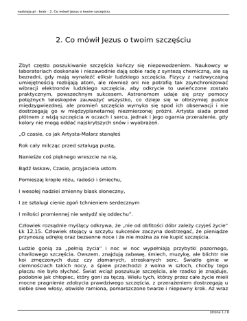 nadzieja.pl - brak - 2. Co mówił Jezus o twoim szczęściu 2. Co mówił Jezus o twoim szczęściu Zbyt często poszukiwanie szczęścia kończy się niepowodzeniem. Naukowcy w laboratoriach doskonale i niezawodnie dają sobie radę z syntezą chemiczną, ale są bezradni, gdy mają wynaleźć eliksir ludzkiego szczęścia. Fizycy z nadzwyczajną umiejętnością rozbijają atom, ale również oni nie potrafią tak zsynchronizować wibracji elektronów ludzkiego szczęścia, aby odkrycie to uwieńczone zostało praktycznym, powszechnym sukcesem. Astronomom udaje się przy pomocy potężnych teleskopów zauważyć wszystko, co dzieje się w olbrzymiej pustce międzygwiezdnej, ale promień szczęścia wymyka się spod ich obserwacji i nie dostrzegają go w międzyplanetarnej niezmierzonej próżni. Artysta siada przed płótnem z wizją szczęścia w oczach i sercu, jednak i jego ogarnia przerażenie, gdy kolory nie mogą oddać najskrytszych snów i wyobrażeń. „O czasie, co jak Artysta-Malarz stanąłeś Rok cały milcząc przed sztalugą pustą, Nanieśże coś pięknego wreszcie na nią, Bądź łaskaw, Czasie, przyjaciela ustom. Pomieszaj krople różu, radości i śmiechu, I wesołej nadziei zmienny blask słoneczny, I ze sztalugi cienie zgoń tchnieniem serdecznym I miłości promiennej nie wstydź się oddechu”. Człowiek rozsądnie myślący odkrywa, że „nie od obfitości dóbr zależy czyjeś życie” Łk 12,15. Człowiek stojący u szczytu sukcesów zaczyna dostrzegać, że pieniądze przynoszą udrękę oraz bezsenne noce i że nie można za nie kupić szczęścia. Ludzie gonią za „pełnią życia” i noc w noc wypełniają przybytki pozornego, chwilowego szczęścia. Owszem, znajdują zabawę, śmiech, muzykę, ale blichtr nie koi zmęczonych dusz czy złamanych, stroskanych serc. Światło ginie w ciemnościach takich nocy, a śpiew przechodzi z wolna w szloch, choćby tego płaczu nie było słychać. Świat wciąż poszukuje szczęścia, ale rzadko je znajduje, podobnie jak chłopiec, który goni za tęczą. Wielu tych, którzy przez całe życie mieli mocne pragnienie zdobycia prawdziwego szczęścia, z przerażeniem dostrzegają u siebie siwe włosy, obwisłe ramiona, pomarszczone twarze i niepewny krok. Aż wraz strona 1 / 8 nadzieja.pl - brak - 2. Co mówił Jezus o twoim szczęściu z ostatnim tchnieniem kończy się wszystko — człowiek dociera do końca swej wędrówki z wciąż nieziszczalnym szczęściem. Salomon, jeden z najmądrzejszych ludzi, także szukał szczęścia. Próbował wszystkich sposobów, aż wreszcie rzekł: „Postanowiłem szczerze mądrością zgłębić i zbadać wszystko, co się działo pod niebem: Jest to żmudne zadanie, jakie zadał Bóg synom ludzkim, aby się nim trudzili” Koh 1,13. „Widziałem wszystkie sprawy, które się dzieją pod słońcem, a wszystko to jest marnością i gonitwą za wiatrem” (w. 14). Czy szukał on rzeczywiście wszędzie? Czy poszukiwania te zostały uwieńczone sukcesem? Salomon był niewątpliwie najmądrzejszym człowiekiem swego czasu, a przy tym uważano go za największego botanika świata. Wieść niosła, że „mówił (...) o drzewach, począwszy od cedru, który rośnie w Libanie, aż do hizopu, który wyrasta z muru”. Był największym na owe czasy autorytetem w dziedzinie zoologii, ornitologii, ichtiologii. „Mówił o zwierzętach i ptakach, o płazach i o rybach” 1Krl 4,33. Niewątpliwie był geniuszem, chodzącą encyklopedią. „Ułożył trzy tysiące przypowieści”. Był chyba jednym z największych pieśniarzy wszystkich czasów. Napisał tysiąc pięć pieśni. Był największym z bibliografów. Zgromadził w swej bibliotece niezliczoną liczbę ksiąg i pism, ale u schyłku życia powiedział z westchnieniem: „Pisaniu wielu ksiąg nie ma końca, a nadmierne rozmyślanie męczy ciało” Koh 12,12. Doświadczył także wszelkich radości życia. „Dał też Bóg Salomonowi bardzo wielką mądrość i roztropność, nadto rozum tak rozległy jak piasek nad brzegiem morza” 1Krl 4,29. Salomon stanął u szczytu mądrości. Gdy królowa z Saby przybyła na jego dwór, aby poznać tę mądrość, zmuszona była przyznać, że nawet połowy tej mądrości jej nie opowiedziano 1Krl 1,7. Czy jednak to wszystko przyniosło Salomonowi szczęście? Nie. Powiedział bowiem: „Bo gdzie jest wiele mądrości, tam jest wiele zmartwienia, a kto pomnaża poznanie, ten pomnaża cierpienie” Koh 1,18. Salomon próbował też gromadzić bogactwa. Jak wynika z Pisma Świętego były warte miliony 1Krl 1,21.27. Czyż jednak przyniosły mu one upragnione szczęście? Powiedział tak: „Kto ufa swemu bogactwu, ten upadnie” Koh 11,28. A oto inna myśl Salomona: „Cenniejsze jest dobre imię niż wielkie bogactwo, lepsza przychylność niż srebro i złoto” Koh 22,1. Nie starczyłoby nam tu miejsca, aby snuć opowieść o wszystkich wielkich budowlach, przedsięwzięciach gospodarczych, rolniczych, hodowlanych i o luksusach, w jakich żył Salomon. A jednak nie znalazł on w tym szczęścia, nie zaznał go, skoro rzekł, iż wszystko to „marność nad marnościami” Koh 12,8. „Potem zwróciłem uwagę na wszystkie moje dzieła, których dokonały moje ręce strona 2 / 8 nadzieja.pl - brak - 2. Co mówił Jezus o twoim szczęściu (...) i oto: wszystko to jest marnością i gonitwą za wiatrem” Koh 2,11. Człowiek rzeczywiście mądry nie znajdzie szczęścia w przyjemnościach czy w samym działaniu. Salomon interesował się muzyką, kompletował instrumenty muzyczne, poszukiwał śpiewaków i śpiewaczek o najwspanialszych uzdolnieniach i zewnętrznych warunkach. Był mecenasem poetów i artystów. Na koniec spróbował poić się alkoholem... i cóż odkrył? „Wino — to szyderca, mocny trunek — to wrzaskliwa kłótnia, i nie jest mądry, kto się od niego zatacza” Koh 20,1. Przykład ten może być ostrzeżeniem i ukierunkowaniem dla tego, kto próbuje sz