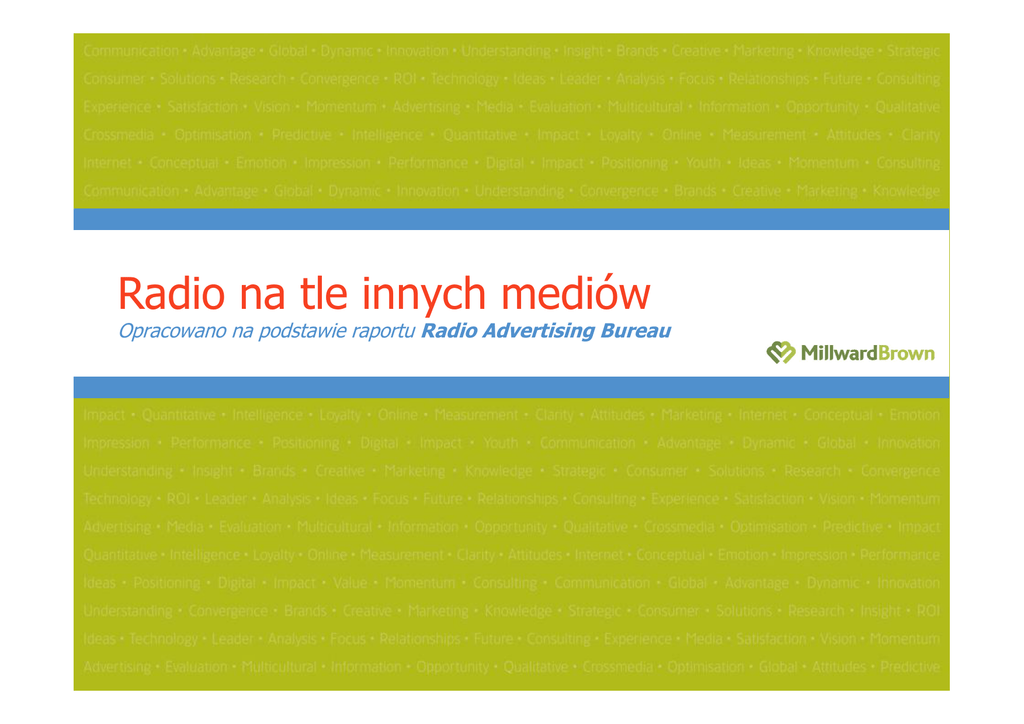 Radio na tle innych mediów Opracowano na podstawie raportu Radio Advertising Bureau W czasach, które charakteryzuje szybkie tempo ¿ycia i ogromna konkurencja kanaùów dotarcia do konsumentów, radio pozostaje medium, z którym spêdzamy najwiêcej czasu. Radio – jako medium towarzysz¹ce - ma przewagê nad pozostaùymi mediami w wielu sytuacjach w ci¹gu dnia (o poranku, w samochodzie, w biurze, na zakupach…). Radio oferuje niezwykùe mo¿liwoœci dotarcia do grupy docelowej. Za poœrednictwem Radia ùatwo identyfikowaã i motywowaã do zakupu nawet w¹skie, niszowe grupy konsumentów z maksymaln¹ dokùadnoœci¹ i precyzj¹. Dodatkowo dzieje siê to w sposób efektywny - gdy¿ koszty reklamy radiowej s¹ niewielkie w porównaniu z reklamowaniem siê np. w telewizji czy prasie codziennej i magazynach. Reklamodawcy doceniaj¹ siùê radia. Wielu z nich ufa radiu w takim stopniu, ¿e stanowi dla nich oczywisty i czêsto jedyny wybór. Powszechnie podkreœla siê równie¿ znaczenie radia jako swoistego medium intensyfikuj¹cego efekty realizowanych kampanii reklamowych. Radio jest jak iskra, która natychmiast tworzy klimat podniecenia i emocji u sùuchaczy oraz zaanga¿owania, które skùania czêsto do dokonywania impulsywnych zakupów. Radio daje mo¿liwoœã przedùu¿enia dziaùania reklamy telewizyjnej, a przez to wzmocnienia jej wizualnego przekazu i niejako jego „unieœmiertelnienia” poprzez swoj¹ wùaœciwoœã tworzenia skojarzeñ. Liczne badania potwierdzaj¹ tezê, która mówi, ¿e nadaj¹c w radio dêwiêkow¹ wersjê popularnej reklamy telewizyjnej stymulujemy sùuchaczy (potencjalnych konsumentów) do odtworzenia w umyœle obrazu zapamiêtanego z telewizji, zachowanego gùêboko w pamiêci. £¹czenie radia z innymi mediami jest bardzo efektywnym sposobem przeprowadzania kampanii reklamowej. Pozwala rozszerzyã zasiêg kampanii, znacznie zwiêkszyã czêstotliwoœã kontaktu z reklam¹ oraz œwiadomoœã reklamowanej marki w czasie trwania kampanii, zmaksymalizowaã zyski z reklamy, a co najwa¿niejsze uùatwiã dotarcie do aktywnych konsumentów, bêd¹cych poza domem, czêsto w sytuacjach dokonywania zakupu. Telewizja Charakterystyka medium Wspóùczesnoœã charakteryzuje tzw. ”ubywanie czasu”. Najbardziej atrakcyjni konsumenci ¿yj¹ szybko, gor¹czkowo i s¹ notorycznie „zabiegani”. Ich codzienne ¿ycie peùne jest wa¿nych spraw i obowi¹zków. Konsumenci nie maj¹ czasu aby korzystaã z mediów w tym samym zakresie jak poprzednie generacje. Dla reklamodawców i media planerów telewizyjnych wyzwaniem staje siê dotarcie do nowego typu konsumenta, który przed telewizorem spêdza coraz mniej czasu. Równie¿ istotne jest odwrócenie relacji pomiêdzy wysokoœci¹ dochodów a czasem poœwiêconym ogl¹daniu telewizji. Im wiêcej ludzie zarabiaj¹, tym mniej czasu spêdzaj¹ na ogl¹daniu TV. Im mniej zarabiaj¹, tym wiêcej ogl¹daj¹. Fakt ten potwierdzaj¹ polskie badania TGI. Dla wielu reklamodawców, których produkty czy usùugi wymagaj¹ od konsumenta uzyskiwania dochodów na okreœlonym poziomie to dzisiaj podstawowy problem. Zalet¹ telewizji jest bez w¹tpienia jej masowoœã i du¿y zasiêg. Telewizja jest powszechnym dobrem wpisanym w nasz¹ codziennoœã. W du¿ej mierze jest to zasùuga audio-wizualnoœci tego medium: poù¹czenia obrazu, dêwiêku i ruchu. Problemem jednak jest ogl¹dalnoœã bloków reklamowych. „Natrêtna” reklama telewizyjna prowokuje „channel surfing” inaczej okreœlane jako „zapping”. Kiedy pojawia siê blok reklamowy widzowie skacz¹ po kanaùach poszukuj¹c innych programów lub zwyczajnie dla zabicia czasu i unikniêcia reklam. Rozwój technologii uùatwia telewidzom eliminowaã emisje bloków reklamowych z programu telewizyjnego. Zalety i wady Zalety • Telewizja jest medium powszechnym i ogólnie dostêpnym • Czas ogl¹dania telewizji pozostaje stabilny Wady • Koszty wyprodukowania i emisji reklamy, s¹ nieporównywalnie wiêksze w stosunku do reklamy w innych mediach • Telewizjê ogl¹damy gùównie w domach, a wiêc ma ona niewielki wpùyw na zwiêkszenie zainteresowania produktem w • Reklama telewizyjna buduje du¿y zasiêg miejscu sprzeda¿y • Reklama telewizyjna buduje napiêcie, • Obraz telewizyjny wydaje siê wa¿niejszy jest intryguj¹ca, symbioza dêwiêku, od dêwiêku, w rzeczywistoœci jednak tak obrazu i ruchu powoduje, ¿e przekaz nie jest. Wystarczy obejrzeã horror bez jest atrakcyjny. dêwiêku, a potem nie ogl¹daj¹c obrazu sùuchaã œcie¿ki dêwiêkowej aby przekonaã siê, ¿e dêwiêk bardziej „straszy” • Widzowie staj¹ siê coraz bardziej wyspecjalizowani w w unikaniu reklam – surfowanie po kanaùach, nagrywanie programu z pominiêciem bloków reklamowych, etc. • Roœnie rola innych mediów – internet, kino domowe, etc. Synergia z radiem Dodaj¹c radio do „media mix” mo¿na rzeczywiœcie zwiêkszyã wpùyw reklamy. Radio wzmaga siùê zapamiêtanego z reklamy telewizyjnej obrazu. Sùuchaj¹c reklamy radiowej czêsto przypominamy sobie jej telewizyjn¹ wersjê (Imagery Transfer). Radio pozwala na obni¿enie kosztów produkcji reklam. Wydaj¹c mniej œrodków na produkcjê, dysponujemy funduszami pozwalaj¹cymi na zwiêkszenie zasiêgu i czêstotliwoœci kampanii. Radio pozwala dotrzeã do tych konsumentów, którzy s¹ atrakcyjni dla reklmodawców, a trudno uchwytni przed telewizorem – mùodzi, mobilni, uposa¿eni. Prasa codzienna, magazyny Charakterystyka medium Czas poœwiêcany na czytanie prasy codziennej i magazynów maleje. Czêsto kontakt z tym medium koñczy siê ju¿ na pierwszej stronie. Mùodzi ludzie nie s¹ ju¿ tak zale¿ni od sùowa drukowanego jak pokolenia ich dziadków - znacznie wiêcej czasu spêdzaj¹ obecnie chocia¿by na sùuchaniu radia czy aktywnoœci w internecie ni¿ czytaniu prasy. Podczas gdy czytelnictwo gazet i czasopism na wielu rynkach maleje, a nakùad czêsto zmniejsza siê, ceny papieru i koszty druku ros