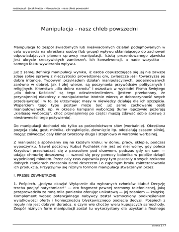 nadzieja.pl - Jacek Matter - Manipulacja - nasz chleb powszedni Manipulacja - nasz chleb powszedni Manipulacja to zespół świadomych lub nieświadomych działań podejmowanych w celu wywarcia na określoną osobę (lub grupę) wpływu skłaniającego do zachowań odpowiadających planom sprawcy manipulacji. Istotą prezentowanego zjawiska jest ukrycie rzeczywistych zamierzeń, ich konsekwencji, a nade wszystko — samego faktu wywierania wpływu. Już z samej definicji manipulacji wynika, iż osoba dopuszczająca się jej nie zawsze zdaje sobie sprawę z nieczystości prowadzonej gry, zwłaszcza jeśli towarzyszą jej dobre intencje. Typowym przykładem działań manipulacyjnych, podejmowanych zarówno w dobrej, jak i złej wierze, są poczynania przywódców politycznych i religijnych. Kłamstwa „dla dobra narodu” i oszustwa w wykładni Pisma Świętego „dla dobra Kościoła” są tego odzwierciedleniem. (Jestem przekonany, że przynajmniej niektórzy z manipulatorów istotnie wierzą w dobroczynność swych przedsięwzięć i w to, że utrzymując masy w niewiedzy działają dla ich szczęścia. Wsparciem tego typu postaw może być już samo zachowanie osób manipulowanych, np. w okresie kampanii wyborczej tłumy łapczywie pożerają „kiełbasę wyborczą”, choć przynajmniej po części muszą zdawać sobie sprawę z niestrawności tego pożywienia). Do manipulacji dochodzi nie tylko za pośrednictwem słów (werbalnie). Określona pozycja ciała, gest, mimika, chrząknięcie, ziewnięcie itp. oddziałują czasem silniej, mogąc zniweczyć cały klimat tworzony długo i stopniowo w warstwie werbalnej. Z manipulacją spotykamy się na każdym kroku: w domu, pracy, sklepie, podczas wypoczynku. Nawet poczciwy Kubuś Puchatek nie jest od niej wolny, gdy poleca Krzysiowi przechadzać się z parasolem pod drzewem, podczas gdy on sam — udając chmurkę deszczową — wznosi się przy pomocy balonika w pobliże dziupli wypełnionej miodem. Przez cały czas zapewnia przy tym pszczoły o swych rzekomo dobrych zamiarach zroszenia ziemi deszczem i o zupełnym braku zainteresowania ich produkcją. Przyjrzyjmy się różnym formom manipulacji stwarzanym przez: I. PRESJE ZEWNĘTRZNE 1. Pośpiech. „Jedyna okazja! Wyłącznie dla wybranych członków klubu! Decyzję trzeba podjąć natychmiast!” — oto fragment pewnej rozmowy telefonicznej, jaką przeprowadziła ze mną miła panienka oferując unikatową — jej zdaniem — książkę. Komplement wobec potencjalnego nabywcy został wzmocniony podkreśleniem wyjątkowości oferty i koniecznością błyskawicznego podjęcia decyzji. Pośpiech z reguły nie jest dobrym doradcą, o czym wie choćby wielu kupujących samochody. Zespół różnych form manipulacji został tu wykorzystany dla uzyskania finalnego strona 1 / 7 nadzieja.pl - Jacek Matter - Manipulacja - nasz chleb powszedni efektu — zakupu książki. Metoda ta jest szeroko stosowana także przez osoby trudniące się tzw. dystrybucją bezpośrednią. Podczas domowych prezentacji wyrobów nakłania się uczestników do natychmiastowego podejmowania decyzji. 2. Komplement. W bajce „Kruk i Lis” chytry rudzielec prezentuje równie prosty, co nienaturalnie przesadny zachwyt nad umiejętnościami wokalnymi kruka. Celem jest trzymany przez ptaka w dziobie ser. Manipulacja jest przejrzysta i aż dziw, że choć wciąż praktykowana przez ludzi, święci triumfy mimo swego oczywistego prostactwa. Widać próżność przyćmiewa nawet elementarne umiejętności samooceny. Istnieją jednak bardziej wyrafinowane sposoby komplementowania, przybierające formę poniżania się (np. w Molierowskim „Świętoszku” tytułowy bohater nieustannie ubolewa nad własną niegodnością, wynosząc zarazem cnoty gospodarza domu, na którego koszt żyje i którym kieruje wedle własnego upodobania). Działaniem odwrotnym, lecz również należącym do grupy manipulacji, jest wywyższanie się — szczególnie często dziś spotykane. Klasycznym przykładem jest „Rewizor” oraz „Kapitan z Koeppenig”. W obu przypadkach przeciętne osoby wcielają się w osobistości o nadzwyczajnych uprawnieniach, dokonując niemałego zamieszania. Niedawno pewna zagraniczna jej mość tak dalece oczarowała władze miasta Książ, iż te zawarły z nią umowę na dzierżawę i restaurację zamku. Wielomiesięczny pobyt rzekomej prominentki zaowocował dalszą dewastacją obiektu. 3. Zaakcentowanie. „Izrael zerwał porozumienie pokojowe! Dziś rano Izrael zaatakował bazy bojowników palestyńskich w odpowiedzi na ich ostrzał pozycji położonych na wzgórzach Golan” — podobne komunikaty co pewien czas pojawiają się w mass mediach. Manipulacja kryje się w sposobie przekazania informacji. Fakty świadczą, iż pierwotny atak Palestyńczyków spowodował reakcję Izraela, co zaowocowało zerwaniem układu. Wyciągając jednak skutek na pierwsze miejsce, ukrywa się istotną przyczynę zajścia. Czytelnik lub słuchacz zapamięta pierwszą kwestię: „Izrael złamał porozumienie pokojowe”, gdyż taka jest natura rejestrowania informacji. Pozostała część wypowiedzi traktowana jest nieświadomie jako komentarz lub balast i podlega usunięciu. W ten sposób można poprzez samo tylko przestawienie faktów spowodować odpowiednią reakcję opinii publicznej w dowolnej kwestii. Tym samym traci wiarygodność twierdzenie o rzekomej obiektywności samych faktów. 4. Przeciwieństwa. Na tym skrzyżowaniu zielone światło dla skręcających w lewo zapala się rzadko i na krótko. Wie o tym około dwudziestoletnia dziewczyna ubrana w bluzkę umożliwiającą szybkie odsłonięcie zniekształconej lewej kończyny. Spaceruje po pasie zieleni rozdzielającym jezdnie. Podchodzi kolejno do samochodów i bez słowa prezentuje kalectwo; zdrową ręką inkasuje datki. Prawie nikt nie opiera się ostremu zestawieniu fizycznej normalności i bogactwa z podstawioną pod nos ułomnością kojarzoną natychm