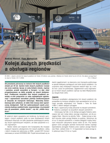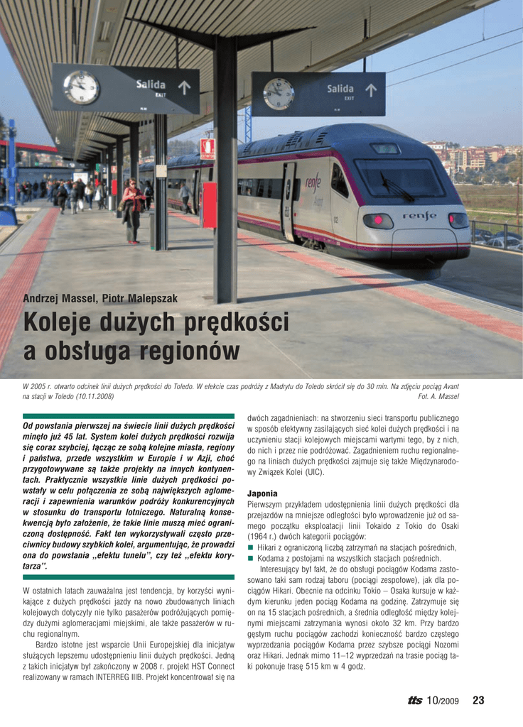Andrzej Massel, Piotr Malepszak Koleje dużych prędkości a obsługa regionów W 2005 r. otwarto odcinek linii dużych prędkości do Toledo. W efekcie czas podróży z Madrytu do Toledo skrócił się do 30 min. Na zdjęciu pociąg Avant na stacji w Toledo (10.11.2008) Fot. A. Massel Od powstania pierwszej na świecie linii dużych prędkości minęło już 45 lat. System kolei dużych prędkości rozwija się coraz szybciej, łącząc ze sobą kolejne miasta, regiony i państwa, przede wszystkim w Europie i w Azji, choć przygotowywane są także projekty na innych kontynentach. Praktycznie wszystkie linie dużych prędkości powstały w celu połączenia ze sobą największych aglomeracji i zapewnienia warunków podróży konkurencyjnych w stosunku do transportu lotniczego. Naturalną konsekwencją było założenie, że takie linie muszą mieć ograniczoną dostępność. Fakt ten wykorzystywali często przeciwnicy budowy szybkich kolei, argumentując, że prowadzi ona do powstania „efektu tunelu”, czy też „efektu kory tarza”. W ostatnich latach zauważalna jest tendencja, by korzyści wynikające z dużych prędkości jazdy na nowo zbudowanych liniach kolejowych dotyczyły nie tylko pasażerów podróżujących pomiędzy dużymi aglomeracjami miejskimi, ale także pasażerów w ruchu regionalnym. Bardzo istotne jest wsparcie Unii Europejskiej dla inicjatyw służących lepszemu udostępnieniu linii dużych prędkości. Jedną z takich inicjatyw był zakończony w 2008 r. projekt HST Connect realizowany w ramach INTERREG IIIB. Projekt koncentrował się na dwóch zagadnieniach: na stworzeniu sieci transportu publicznego w sposób efektywny zasilających sieć kolei dużych prędkości i na uczynieniu stacji kolejowych miejscami wartymi tego, by z nich, do nich i przez nie podróżować. Zagadnieniem ruchu regionalnego na liniach dużych prędkości zajmuje się także Międzynarodowy Związek Kolei (UIC). Japonia Pierwszym przykładem udostępnienia linii dużych prędkości dla przejazdów na mniejsze odległości było wprowadzenie już od samego początku eksploatacji linii Tokaido z Tokio do Osaki (1964 r.) dwóch kategorii pociągów: Hikari z ograniczoną liczbą zatrzymań na stacjach pośrednich, Kodama z postojami na wszystkich stacjach pośrednich. Interesujący był fakt, że do obsługi pociągów Kodama zastosowano taki sam rodzaj taboru (pociągi zespołowe), jak dla pociągów Hikari. Obecnie na odcinku Tokio – Osaka kursuje w każdym kierunku jeden pociąg Kodama na godzinę. Zatrzymuje się on na 15 stacjach pośrednich, a średnia odległość między kolejnymi miejscami zatrzymania wynosi około 32 km. Przy bardzo gęstym ruchu pociągów zachodzi konieczność bardzo częstego wyprzedzania pociągów Kodama przez szybsze pociągi Nozomi oraz Hikari. Jednak mimo 11–12 wyprzedzań na trasie pociąg taki pokonuje trasę 515 km w 4 godz. 10/2009 23 Włochy Choć Włochy były pierwszym krajem w Europie, który rozpoczął budowę linii dużych prędkości, jej budowa trwała bardzo długo. Pierwszy odcinek magistrali Diretissima Rzym – Florencja, od stacji Sette Bagni do Città della Pieve (122 km) uruchomiono 24 lutego 1977 r., natomiast całkowite ukończenie linii nastąpiło dopiero w 1992 r. Cechą szczególną linii Direttissima jest jej rozplanowanie i schemat funkcjonalny. Magistrala ta w 10 miejscach łączy się z konwencjonalną linią Rzym – Florencja za pośrednictwem dwutorowych, bezkolizyjnych łącznic, na których prędkość jazdy wynosi 100 km/h. W ten sposób zapewniony został dojazd do istniejących stacji kolejowych w miejscowościach zlokalizowanych na „starej” linii i obsługa obszarów ciążenia: Orte (posterunki odgałęźne Orte Sud, Orte Nord), Orvieto (posterunki odgałęźne Orvieto Sud i Orvieto Nord), Chiusi (posterunki odgałęźne Chiusi Sud, Chiusi Nord), Arezzo (posterunki odgałęźne Arezzo Sud i Arezzo Nord), Montevarchi, San Giovanni Valdarno, Figline (posterunki odgałęźne Valdarno Sud i Valdarno Nord). Z wymienionych miast najwięcej mieszkańców ma Arezzo (97,5 tys), Orvieto liczy niecałe 21 tys. mieszkańców a Montevarchi 23,5 tys. Najszybsze pociągi międzyaglomeracyjne, osiągające na linii prędkość 250 km/h (Eurostar Italia Alta Velocità oraz Eurostar Italia), pokonują odległość od Rzymu do Florencji bez zatrzymania. Pojedyncze postoje mają jedynie pierwsze i ostatnie pociągi w porze dziennej. Oprócz nich, w cyklu dwugodzinnym kursują konwencjonalne pociągi Intercity prowadzone lokomotywami i osiągające prędkość 200 km/h. Pociągi te zatrzymują się na wybranych stacjach pośrednich, co wymaga zjazdu na magistrali. Typowe postoje zaplanowane są w Orte, Orvieto, Chiusi oraz Arezzo. O ile w poprzednich latach pociągi Intercity po zatrzymaniu się na którejś z tych stacji pośrednich wracały na linię Direttissima, to w rozkładzie jazdy na 2009 r., w związku ze zwiększeniem liczby pociągów Eurostar Italia i skróceniem czasu ich jazdy, znaczna część trasy: od Orte do Arezzo jest pokonywana linią konwencjonalną. Na wybranych odcinkach linii poza pociągami międzyaglomeracyjnymi kursują również pociągi regionalne obsługiwane konwencjonalnymi składami wagonowymi prowadzonymi lokomotywami elektrycznymi (prędkość 160 km/h). Dotyczy to szczególnie odcinka Rzym – Orte (84 km), który w dzień roboczy jest obsługiwany przez ponad 20 par takich pociągów kursujących w relacji Rzym – Florencja oraz Rzym – Ancona. Przykład linii Direttissima wskazuje, że współistnienie na jednym układzie torowym ruchu pociągów o zróżnicowanej charakterystyce, przy wzroście natężenia ruchu i wzroście różnicy prędkości pomiędzy nimi jest bardzo utrudnione. Z tego powodu faktyczne wykorzystanie linii odbiega od pierwotnych założeń, w myśl których „stara” linia i Direttissima miały współpracować ze sobą i praktycznie funkcjonować jako linia