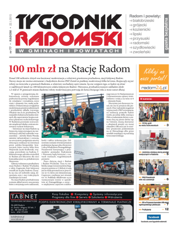 GMINACH I POWIATACH gazeta bezpłatna nr 77 • RADOM • 22. I. 2015 W Radom i powiaty: białobrzeski grójecki kozienicki lipski przysuski radomski szydłowiecki zwoleński 100 mln zł na Stację Radom Ponad 100 milionów złotych ma kosztować modernizacja, a właściwie gruntowna przebudowa, stacji kolejowej Radom. Nazwy stacja nie można utożsamiać z budynkiem dworca PKP. Został on poddany modernizacji kilka lat temu. Rozpoczęły się już roboty na torowisku w granicach Radomia, a właściwie wschodniej części miasta. Są one wstępem tego, co będzie się dziać w najbliższych latach na 100-kilometrowym szlaku kolejowym Radom–Warszawa, przebudowywanym nakładem około 1,5 mld zł. W granicach miasta Radomia roboty modernizacyjne potrwają do końca bieżącego roku a może nawet dłużej. W oparciu o przygotowaną dokumentację zostaną wykonane podwyższone perony, wygodniejsze do wsiadania i wysiadania, nowe wiaty i elementy tzw. małej architektury. Dokumentacja uwzględnia modernizację przejść podziemnych i przebudowę układu torowego. Obejmie ona m.in. przebudowę 38 rozjazdów kolejowych, bardzo istotnych dla zapewnienia bezpieczeństwa i płynności ruchu kolejowego. W Radomiu powstanie nowocześnie urządzone lokalne centrum sterowania ruchem kolejowym. – Inwestycje na stacji Radom są forpocztą rozpoczynającej się modernizacji całej linii radomsko-warszawskiej – mówiła Maria Wasiak, minister infrastruktury i rozwoju, na uroczystości podpisania umowy dotyczącej realizacji tej inwestycji przez polsko-hiszpańskie konsorcjum, które tworzy kilka firm. Wojewoda Jacek Kozłowski, wręczając pozwolenie na budowę 3kilometrowego odcinka stwierdził, że Radom jest kluczowy dla sieci komunikacyjnej na południowym Mazowszu. Główny wykonawca przebudowy stacji Radom i Radom Wschodni, a także fragmentu linii kolejowej wszedł już na plac budowy. Zaczęła się ona od rozbiórki ramp, demontażu szyn i sieci trakcyjnych. Zamknięto też tunel. Na stacji Radom przebudowany zostanie układ torowy oraz perony, które z otrzymają nowe zadaszenie, nego toru nr 14. Nad peronem nr 3 zdemontowano oprawy świetlówkowe z wiaty, a na torze nr 8 – elementy bram. Nieczynny jest dworcowy tunel, nie ma tu przejścia dla pieszych. Choć radomski magistrat wypracował z PKP rozwiązanie, na realizację pomysłu będzie trzeba poczekaj kilka miesięcy Póki co radomianie, którzy z centrum chcą się pieszo dostać np. na Ustronie, muszą skorzystać z okrężnych przejść czy raczej objazdów. Obecnie jest to możliwe przejściem podziemnym na ul. Słowackiego albo przez wiadukt znajdujący się nad aleją Grzecznarowskiego. ławki i tablice informacyjne. Odnowione zostanie również przejście podziemne, łączące plac dworcowy z ulicą Władysława Domagalskiego. Pasażerowie korzystający z przystanków pomiędzy Radomiem i Warszawą będą korzystać z nowych wyższych, wygodniejszych peronów. Prace dotyczą stacji i Radom i Radom Wschodni. Trwa tu rozbiórka rampy towarowej, która biegnie przy peronie nr 5. Roboty trwają już na wielu peronach m.in. przy torze nr 12, który jest demontowany. Częściowo rozebrany jest również tor 14. Podkłady składowane są na wyznaczonym terenie w sąsiedztwie ul. Domagalskiego, a szyny – w międzytorzu częściowo rozebra- W numerze: W Iłży grali na wielu instrumentach 3 Jesteśmy wiodącą siecią poradni medycznych w Radomiu 5 Wójt Kowalczyk mile nas zaskakuje 6 BS w Przysusze laureatem VIII edycji ogólnopolskiego plebiscytu 7 Po(d)glądy 12 facebook.com/tygodnikradomski 2 AKTUALNOŚCI Nr 77 Plac Jagielloński – kolejna odsłona W zamierzchłej przeszłości wybudowano tu stajnie a obok nich była ujeżdżalnie, później część placu przeznaczono na targowisko i popularnie nazywano go „Rajtszula”. Sam plac nosił nazwę Jagielloński. W czasie okupacji był to „Plac Rzeszy”. Po wojnie nadano mu nazwę „Placu Zwycięstwa”, a pod pomnikiem wdzięczności odbywały się demonstracje polityczne. W dobie transformacji, pomnik zlikwidowano (jego miejsce miał zastąpić „Radomski powiew”), a plac odzyskał swoją przedwojenną nazwę „Placu Jagiellońskiego”. Dziś czeka nas kolejna odsłona. Ale nie taka szybka. – Moją ambicją jest, by pozyskać na tę przebudowę pieniądze unijne w ramach rewitalizacji miast. Czekamy na ogłoszenie konkursów – wyjaśniał na konferencji prasowej wiceprezydent Konrad Frysztak. Przetarg ogłoszony przez miasto na opracowanie dokumentacji projektowo-kosztorysowej tej przestrzeni wygrała radomska firma Embi Architektura. Zaproponowała, że główną osią placu będzie ciąg pieszy prowadzący od ul. Struga, która od Resursy zosta- nie przedłużona – poprzez tereny zielone pod Teatr Powszechny. U zbiegu przedłużonej ulicy Struga i pl. Jagiellońskiego wyznaczono miejsce pod pomnik Kazimierza Jagiellończyka. – Ciekawym jej elementem jest bardzo nowoczesna fontanna, na skalę europejską, umożliwiająca pokazy filmów – stwierdził wiceprezydent Frysztak. Koncepcja uwzględnia także m.in. podziemny parking na 200 samochodów z dwoma wjazdami oraz parking dla autokarów na tyłach teatru, od strony ulicy Pileckiego. Po przebu- Wiceprezydent Konrad Frysztak przedstawił wizualizację pl. Jagiellońskiego dowie plac byłby jeszcze większy, bo część okalających go ulic zostałaby zamknięta. Koncepcja przebudowy poddana zostanie jednak jeszcze konsultacjom społecznym. – Założeniem tych konsultacji jest wsłuchanie się w opinię, propozycje i uwagi mieszkańców, co do sposobu jego zagospodarowania. To możliwość uzyskania odpowiedzi, jakie są oczekiwania co do tej bardzo ważnej części miasta wszystkich zainteresowanych – powiedział wiceprezydent Konrad Frysztak. Konsultacje społeczne dotyczące tego tematu potrwają od 30 stycznia do 14 lutego. Zorganizowane zostaną dwa spotkania w Urzędzie Miejskim (ul. Kilińskiego 30,