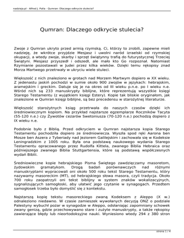nadzieja.pl - Alfred J. Palla - Qumran: Dlaczego odkrycie stulecia? Qumran: Dlaczego odkrycie stulecia? Zwoje z Qumran ukryto przed armią rzymską. Ci, którzy to zrobili, zapewne mieli nadzieję, że wkrótce przyjdzie Mesjasz i uwolni naród izraelski od rzymskiej okupacji, a wtedy zwoje, skarby i sprzęt świątynny trafią do futurystycznej Trzeciej Świątyni. Mesjasz przyszedł i odszedł, ale mało kto Go rozpoznał. Natomiast Rzymianie pozostawali w Judei przez kilka wieków. Dzięki temu rękopisy znad Morza Martwego przetrwały w ukryciu wiele stuleci. Większość z nich znaleziono w grotach nad Morzem Martwym dopiero w XX wieku. Z jedenastu jaskiń pochodzi w sumie około 900 zwojów w językach: hebrajskim, aramejskim i greckim. Datuje się je na okres od III wieku p.n.e. po I wieku n.e. Wśród nich są 233 manuskrypty biblijne, które reprezentują wszystkie księgi Starego Testamentu (z wyjątkiem księgi Estery). Kopie tak bliskie oryginałom, jak znalezione w Qumran księgi biblijne, są bez precedensu w starożytnej literaturze. Większość starożytnych ksiąg przetrwała do naszych czasów dzięki ich średniowiecznym kopiom. Na przykład najstarsze egzemplarze Roczników Tacyta (55-120 n.e.) czy Żywotów cezarów Swetoniusza (70-120 n.e.) pochodzą dopiero z IX wieku n.e. Podobnie było z Biblią. Przed odkryciem w Qumran najstarsza kopia Starego Testamentu pochodziła dopiero ze średniowiecza. Wyszła spod ręki Aarona ben Mosze ben Aszera z Tyberiady nad Jeziorem Galilejskim i zachowała się w Kodeksie Leningradzkim z 1005 roku. Była ona podstawą naukowego wydania Starego Testamentu opracowanego przez Rudolfa Kittela, zwanego Biblia Hebraica oraz późniejszego zwanego Biblia Stuttgartensia, które są podstawą współczesnych wydań Biblii. Średniowieczne kopie hebrajskiego Pisma Świętego zawdzięczamy masoretom, żydowskim gramatykom. Drogą badań porównawczych nad różnymi manuskryptami wypracowali oni około 500 roku tekst Starego Testamentu, który nazywamy masoreckim (MT), od hebrajskiego słowa masora, czyli tradycja. Około 700 roku zaopatrzyli oni tekst biblijny w system znaków wokalizacyjnych, sygnalizujących samogłoski, aby ułatwić jego czytanie w synagogach. Przedtem samogłosek trzeba było domyślić się z kontekstu. Najstarszą kopię tekstu masoreckiego zwaną Kodeksem z Aleppo (X w.) odnaleziono niedawno. W czasie zamieszek wywołanych decyzją ONZ o podziale Palestyny wybuchł pożar w synagodze w Aleppo, odsłaniając zapomniany schowek zwany genizą, gdzie przechowywano stare i zużyte manuskrypty, a także rękopisy zawierające błędy lub nieortodoksyjne nauki. Wyniesiono wtedy 294 z 380 stron strona 1 / 4 nadzieja.pl - Alfred J. Palla - Qumran: Dlaczego odkrycie stulecia? tego manuskryptu. Paradoksalnie, główną przyczyną, dla której nie zachowały się do naszych czasów kopie Starego Testamentu sprzed X wieku, była niemal zabobonna cześć, z jaką Żydzi traktowali Pismo Święte, ze względu na zawarte w nim Słowo Boże. Skrybowie nie niszczyli ksiąg zużytych przez wieki używania ich jako wzoru do kopiowania, ani rabini tych, które nie nadawały się już do użytku w synagodze. Grzebali je w ziemi jak zmarłego lub składali w genizie, skąd raz na kilkaset lat usuwali je i ceremonialnie grzebali. W rezultacie najstarsze zachowane kopie Starego Testamentu pochodziły dopiero ze średniowiecza. Sceptycy byli przekonani, że ponad tysiąc lat przepisywania ksiąg biblijnych znacznie oddaliło kopie od oryginałów (autografów), a zatem Pismo Święte nie może być uważane za tekst wiarygodny. Wielu z nich, gdyby doczekało odkrycia z Qumran, przeżyłoby szok, widząc, jak dalekie od prawdy były ich założenia, tezy i wnioski. Niektórzy ztych, którzy go dożyli przez pewien czas próbowali się uchwycić twierdzenia, że zwoje z Qumran muszą być fałszerstwem. Masoreci, czyli średniowieczni gramatycy żydowscy, kopiując tekst, przestrzegali skrupulatnych zasad. Mimo to nawet ich kopie różniły się między sobą niewielkimi szczegółami, które nazywamy wariantami. Z ogromną ciekawością bibliści oczekiwali publikacji rękopisów znad Morza Martwego, aby porównać je z tekstem masoreckim. Co się okazało? Dr Randall Price napisał: "Rozczarowanie spotkało tych, którzy oczekiwali, że zwoje ujawnią radykalne zmiany w tekście biblijnym, bo ich treść potwierdziła tylko wiarygodność i stabilność Starego Testamentu, jakim dysponujemy we współczesnych przekładach."[1] Porównanie zwoju księgi Izajasza z Qumran z jego późniejszą o tysiąc lat masorecką kopią dowiodło, że są identyczne w 99 procentach! Podobna zbieżność cechuje inne kopie ksiąg biblijnych znalezione nad Morzem Martwym, co potwierdza niezwykłą wiarygodność tekstu masoreckiego, na którym opierały się dotychczasowe przekłady Biblii. Ale co z tym 1 procentem? Na czym polegają owe różnice? W większości przypadków chodzi o różną pisownię tego samego słowa albo o inny szyk wyrazów w zdaniu. Już jednak w starożytności istniało kilka form pisowni niektórych słów. Tam, gdzie różnice są większe, kopie znad Morza Martwego pozwalają nieraz wyjaśnić pewne pozorne sprzeczności w Biblii. Na przykład, qumrańskie manuskrypty księgi Samuela (4QSamb), datowane na III wiek p.n.e. podają, że Goliat mierzył znacznie ponad 2 m, ale nie ponad 3 m, jak by wynikało z tekstu masoreckiego. Inny tekst z qumrańskiej kopii 1 Księgi Samuela (4QSama) zawiera dwa zdania, których nie ma w naszych Bibliach, gdyż brak ich w tekście masoreckim. W tym przypadku ich brak nieco utrudnia pełne zrozumienie strona 2 / 4 nadzieja.pl - Alfred J. Palla - Qumran: Dlaczego odkrycie stulecia? poniższego tekstu biblijnego: "Nadciągnął Nachasz Ammonita i oblegał miasto Jabesz w Gileadzie. Oznajmili Nachaszowi wszyscy mieszkańcy Jabesz: Zawrzyj z nami przymierze, a będziemy ci służyć. Odrzekł im Nac