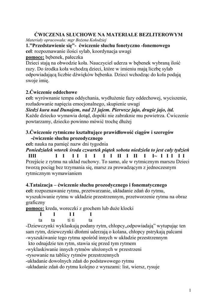 ĆWICZENIA SŁUCHOWE NA MATERIALE BEZLITEROWYM Materiały opracowała: mgr BoŜena Kołodziej 1.”Przedstawienie się”- ćwiczenie słuchu fonetyczno -fonemowego cel: rozpoznawanie ilości sylab, koordynacja uwagi pomoce: bębenek, pałeczka Dzieci stają na obwodzie koła. Nauczyciel uderza w bębenek wybraną ilość razy. Do środka koła wchodzą dzieci, które w imieniu mają liczbę sylab odpowiadającą liczbie dźwięków bębenka. Dzieci wchodząc do koła podają swoje imię. 2.Ćwiczenie oddechowe cel: wyrównanie tempa oddychania, wydłuŜenie fazy oddechowej, wyciszenie, rozładowanie napięcia emocjonalnego, skupienie uwagi Siedzi kura nad Dunajem, nad 21 jajem. Pierwsze jajo, drugie jajo, itd. KaŜde dziecko wymawia dotąd, dopóki nie zabraknie mu powietrza. Ćwiczenie powtarzamy, dziecko powinno mówić trochę dłuŜej 3.Ćwiczenie rytmiczne kształtujące prawidłowość ciągów i szeregów -ćwiczenie słuchu prozodycznego cel: nauka na pamięć nazw dni tygodnia Poniedziałek wtorek środa czwartek piątek sobota niedziela to jest cały tydzień IIII I I I I I I I I II I II I I~ I I I I I Przejście z rytmu na układ ruchowy. To samo, ale w rytmicznym marszu Dzieci tworzą pociąg bez trzymania się, marsz za prowadzącym z jednoczesnym rytmicznym wymawianiem 4.Tataizacja – ćwiczenie słuchu prozodycznego i fonematycznego cel: rozpoznawanie rytmu, przetwarzanie, układanie zdań do rytmu, wyszukiwanie rytmu w układzie przestrzennym, przetworzenie rytmu na obraz graficzny pomoce: kreda, woreczki z grochem lub duŜe klocki I I II I ta ta ti ti ta -Dziewczynki wyklaskują podany rytm, chłopcy„odpowiadają” wytupując ten sam rytm, dziewczynki dłońmi uderzają o kolana, chłopcy pstrykają palcami -wyszukiwanie tego rytmu spośród innych w układzie przestrzennym kto odnajdzie ten rytm, stawia się przed tym rytmem -wyklaskiwanie innych rytmów ułoŜonych w przestrzeni -rysowanie na tablicy rytmów przestrzennych -układanie dowolnych zdań do podstawowego rytmu -układanie zdań do rytmu kolejno z wyrazami: list, wiersz, rysuje 1 5.Zabawa „Puszysty kot” –ćwiczenie słuchu fonematycznego cel: analiza głoskowa, synteza wzrokowa Puszysty kot, kochany kot raz przyjaciela miał I Bingo on się zwał B-i n-g-o i Bingo on się zwał Bin-go. I Bingo on się zwał Opis zabawy w wersji zmodyfikowanej: Dzieci śpiewając maszerują rytmicznie po kole parami. Na słowo Bingo zatrzymują się, stają naprzeciw siebie. Głoskują „Bingo” uderzając skrzyŜnie w dłonie sąsiada. „I Bingo” wyskok do góry. MoŜna nadawać inne imiona: Ciapek, Reksio, Puszek itp. 6.Układanie i czytanie wyrazów –ćwiczenie słuchu fonematycznego, ćwiczenie pamięci słuchowej cel: analiza i synteza głoskowa, rozróŜnianie brzmienia głosek, tworzenie nowych wyrazów, ćwiczenie koordynacji wzrokowo-słuchowo-ruchowej pomoce: pianka styropianowa (patyczki, guziczki) UłóŜ dźwięki słowa „tama”. Sprawdź pokazując palcem. Podnieś do góry dźwięk m. OdłóŜ na miejsce. Podnieś do góry dźwięk a. OdłóŜ na miejsce. Zabierz dźwięk t i w to miejsce połóŜ r. Przeczytaj wyraz Tama – rama- rasa –kasa –kara – kora- kura –rura –bura- burza Do słowa burza dołóŜ m, dołóŜ i – przeczytaj wyraz OdłóŜ m, odłóŜ i –przeczytaj wyraz Zabierz a, dołóŜ o, dołóŜ w, dołóŜ e –przeczytaj 7.Czytanie zdania w linii melodycznej – ćwiczenie słuchu prozodycznego cel: ćwiczenie intonacji, modulacji głosu pomoce: znaki interpunkcyjne Mama piecze tort Czytanie zdania ze znakami interpunkcyjnymi, ze smutkiem, z radością itp. 8. Rozpoznawanie dźwięków nagranych na kasecie – ćwiczenie słuchu fonetycznego cel: rozpoznawanie i nazywanie dźwięków pomoce: magnetofon, kaseta Dzieci kolejno rozpoznają dźwięki, podają źródło pochodzenia 9.RozróŜnianie dźwięków z otoczenia – ćwiczenie słuchu fonetycznego cel: rozpoznawanie dźwięków ze względu na ich specyficzne właściwości – dźwięk „dźwięczny”, „bezdźwięczny” pomoce: parawan, szklanka, pałeczka, klocek drewniany, bębenek 2 Nauczyciel kolejno uderza pałeczką w zgromadzone przedmioty, nazywa je, uczniowie słuchają i obserwują. Następnie za parawanem nauczyciel uderza w wybrany przedmiot, uczniowie rozpoznają dźwięk 10.Wyodrębnianie wyrazów w zdaniu – ćwiczenie słuchu fonematycznego cel: rozpoznawanie ilości wyrazów w zdaniu pomoce: paski papieru, noŜyczki dla kaŜdego ucznia Cały pasek to zdanie (Mała Kasia układa ksiąŜki) Potnij pasek na tyle części, ile słyszysz słów -Ile części otrzymaliśmy po pocięciu paska? -ile mamy wyrazów w zdaniu? -Jaki wyraz rozpoczyna zdanie? -Który wyraz jest pierwszy? -Jaki wyraz kończy zdanie? Zdania moŜna rozwijać- postępowanie analogiczne Potnij pasek na 4 części. UłóŜ do niego zdanie. Uczniowie prezentują ułoŜone zdania. 11. „Łańcuch sylabowy” – ćwiczenie słuchu fonematycznego cel: tworzenie wyrazów dwusylabowych na podstawie sylaby wygłosowej UłóŜ wyraz na dwa klaśnięcia, który zaczyna się ostatnią sylabą słyszanego wyrazu (nauczyciel prezentuje przykład: mapa –2 razy klaszcze, druga sylaba „pa”, układamy wyraz zaczynający się na 2 klaśnięcia np. para) Wata –tama- maki- kije- jemy- mydło .......aŜ do wyczerpania pomysłów 12.Fikcyjne opowiadanie – ćwiczenie słuchu fonematyczno- fonetycznego i fonologicznego cel: uzupełnianie zdań wyrazem we właściwej formie, uwraŜliwienie na melodię zdania i pauzę fonetyczną Za kaŜdym razem, gdy nauczyciel robi przerwę w opowiadaniu, dzieci wypowiadają umówiony wyraz, np. Staszek Idę ulicą, patrzę, a tu idzie ...........(Staszek). Co tu robisz ............(Staszku)? – pytam. Idę do szkoły – odpowiada .......(Staszek). 13. Posłuchaj uwaŜnie i popraw popełnione przeze mnie błędy – kształtowanie słuchu fonologicznego cel: rozróŜnianie głosek naleŜących do
