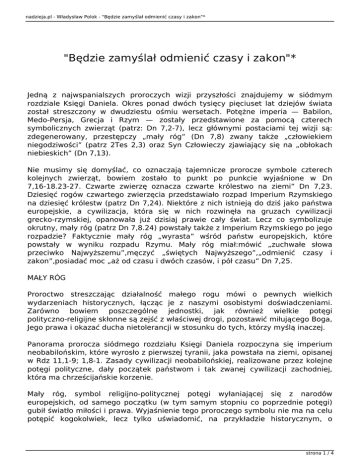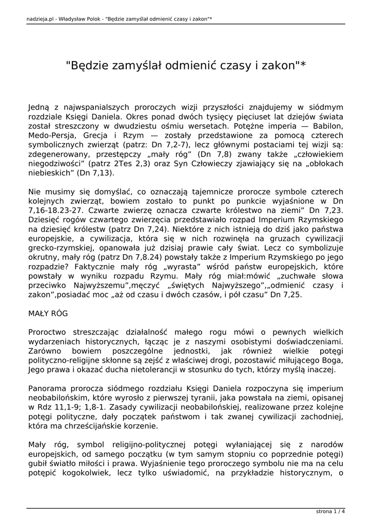 nadzieja.pl - Władysław Polok - "Będzie zamyślał odmienić czasy i zakon"* "Będzie zamyślał odmienić czasy i zakon"* Jedną z najwspanialszych proroczych wizji przyszłości znajdujemy w siódmym rozdziale Księgi Daniela. Okres ponad dwóch tysięcy pięciuset lat dziejów świata został streszczony w dwudziestu ośmiu wersetach. Potężne imperia — Babilon, Medo-Persja, Grecja i Rzym — zostały przedstawione za pomocą czterech symbolicznych zwierząt (patrz: Dn 7,2-7), lecz głównymi postaciami tej wizji są: zdegenerowany, przestępczy „mały róg” (Dn 7,8) zwany także „człowiekiem niegodziwości” (patrz 2Tes 2,3) oraz Syn Człowieczy zjawiający się na „obłokach niebieskich” (Dn 7,13). Nie musimy się domyślać, co oznaczają tajemnicze prorocze symbole czterech kolejnych zwierząt, bowiem zostało to punkt po punkcie wyjaśnione w Dn 7,16-18.23-27. Czwarte zwierzę oznacza czwarte królestwo na ziemi” Dn 7,23. Dziesięć rogów czwartego zwierzęcia przedstawiało rozpad Imperium Rzymskiego na dziesięć królestw (patrz Dn 7,24). Niektóre z nich istnieją do dziś jako państwa europejskie, a cywilizacja, która się w nich rozwinęła na gruzach cywilizacji grecko-rzymskiej, opanowała już dzisiaj prawie cały świat. Lecz co symbolizuje okrutny, mały róg (patrz Dn 7,8.24) powstały także z Imperium Rzymskiego po jego rozpadzie? Faktycznie mały róg „wyrasta” wśród państw europejskich, które powstały w wyniku rozpadu Rzymu. Mały róg miał:mówić „zuchwałe słowa przeciwko Najwyższemu”,męczyć „świętych Najwyższego”,„odmienić czasy i zakon”,posiadać moc „aż od czasu i dwóch czasów, i pół czasu” Dn 7,25. MAŁY RÓG Proroctwo streszczając działalność małego rogu mówi o pewnych wielkich wydarzeniach historycznych, łącząc je z naszymi osobistymi doświadczeniami. Zarówno bowiem poszczególne jednostki, jak również wielkie potęgi polityczno-religijne skłonne są zejść z właściwej drogi, pozostawić miłującego Boga, Jego prawa i okazać ducha nietolerancji w stosunku do tych, którzy myślą inaczej. Panorama prorocza siódmego rozdziału Księgi Daniela rozpoczyna się imperium neobabilońskim, które wyrosło z pierwszej tyranii, jaka powstała na ziemi, opisanej w Rdz 11,1-9; 1,8-1. Zasady cywilizacji neobabilońskiej, realizowane przez kolejne potęgi polityczne, dały początek państwom i tak zwanej cywilizacji zachodniej, która ma chrześcijańskie korzenie. Mały róg, symbol religijno-politycznej potęgi wyłaniającej się z narodów europejskich, od samego początku (w tym samym stopniu co poprzednie potęgi) gubił światło miłości i prawa. Wyjaśnienie tego proroczego symbolu nie ma na celu potępić kogokolwiek, lecz tylko uświadomić, na przykładzie historycznym, o strona 1 / 4 nadzieja.pl - Władysław Polok - "Będzie zamyślał odmienić czasy i zakon"* zgubnych skłonnościach naszej ludzkiej, grzesznej natury. Słowo Boże podkreśla, że odejście od pierwotnych zasad chrześcijańskich następowało w sposób nieunikniony wtedy, gdy początkowa gorliwość dla Chrystusa poczęła maleć. Wśród ludu Bożego miało to miejsce nie po raz pierwszy...Wkrótce po potopie większość potomków uratowanej rodziny zjednoczyła się w odstępstwie pod wieżą Babel (patrz Rdz 11,1-8). Wkrótce po nadaniu przez Boga prawa Izraelitom na górze Synaj lud wybrany popadł w tragiczne odstępstwo —zaczął praktykować bałwochwalczy kult złotego cielca (patrz Wj 19,7-8; 32,1-9). W czasie pierwszego adwentu najbardziej religijni ludzie, jacy kiedykolwiek żyli na ziemi, popadli w formalizm i zaczęli podziwiać własną sprawiedliwość. Ci najbardziej religijni ludzie ukrzyżowali Pana chwały.Nie minęło nawet jedno pokolenie po Chrystusie, gdy apostołowie już zaczęli pisać do zborów ostrzeżenia przed utratą pierwszej gorliwości (patrz Ap 2,4) i powoli zarysowującym się odstępstwem (patrz Dz 2,28-3; 2Tes 2,2-7). Wspomniane odstępstwo, przed którym ostrzegali apostołowie, potęgowało się szybko w nadchodzących stuleciach. Wraz z formalnym nawróceniem się cesarza Konstantyna Wielkiego Kościół wszedł w bliski związek z państwem (sojusz ołtarza z tronem). Ustalone zostały zasady, które dominowały w średniowiecznej Europie aż do okresu reformacji, powodując stagnację wszelkiego życia duchowego. Ponieważ Pismo Święte stawało się coraz bardziej niedostępne dla ludzi, naturalne, egoistyczne pragnienia serca ludzkiego zbyt często zastępowały boskie zasady. Wiele pozostałości po pogańskich kultach szybko znalazło się w chrześcijańskim Kościele. Duch nietolerancji — tak naturalny dla nieodrodzonego serca — rozwinął się do zastraszających rozmiarów. Chrystus miał do zaoferowania swoim naśladowcom tylko krzyż (patrz Łk 14,25-27), lecz Kościół zapomniał o tym. Już w trzecim-czwartym wieku naszej ery wyznawcy chrześcijaństwa byli pozyskiwani przez zacieranie różnic w zasadach wiary pomiędzy religią Chrystusa a innymi religiami. Tak kształtowała się potęga, którą w proroczej Księdze Daniela określono jako „mały róg”. Prorok podał również charakterystykę jego działalności: „Będzie mówił zuchwałe słowa przeciwko Najwyższemu, będzie męczył świętych Najwyższego, będzie zamyślał odmienić czasy i zakon; i będą wydani w jego moc aż do czasu i dwóch czasów, i pół czasu” Dn 7,25. ZUCHWAŁE SŁOWA PRZECIW NAJWYŻSZEMU To zuchwalstwo polega nie tylko na tym, że istota ludzka przypisuje sobie tytuły boskie, odbiera cześć, która należy się wyłącznie Bogu, ale wchodzi również w zakres Jego kompetencji takich jak: nieomylność, przebaczanie grzechów, „zamykanie i otwieranie” nieba i wiele innych. BĘDZIE MĘCZYŁ ŚWIĘTYCH NAJWYŻSZEGO Sens tej działalności małego rogu został wyjaśniony w Dn 7,21. Ów róg prowadził strona 2 / 4 nadzieja.pl - Władysław