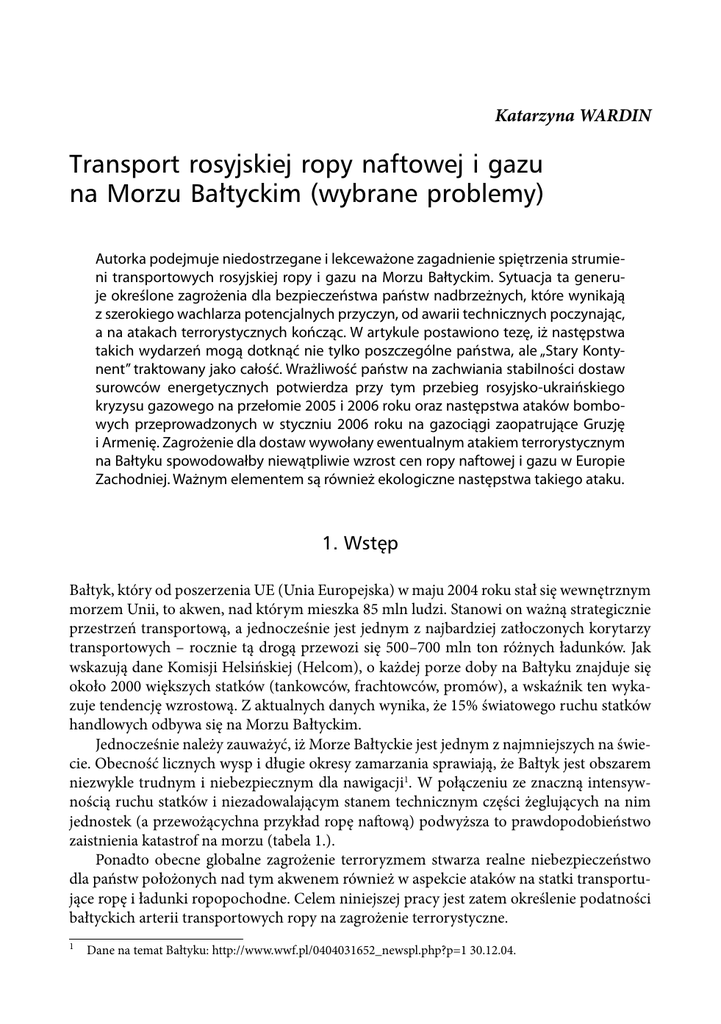 Katarzyna WARDIN Transport rosyjskiej ropy naftowej i gazu na Morzu Bałtyckim (wybrane problemy) Autorka podejmuje niedostrzegane i lekceważone zagadnienie spiętrzenia strumieni transportowych rosyjskiej ropy i gazu na Morzu Bałtyckim. Sytuacja ta generuje określone zagrożenia dla bezpieczeństwa państw nadbrzeżnych, które wynikają z szerokiego wachlarza potencjalnych przyczyn, od awarii technicznych poczynając, a na atakach terrorystycznych kończąc. W artykule postawiono tezę, iż następstwa takich wydarzeń mogą dotknąć nie tylko poszczególne państwa, ale „Stary Kontynent” traktowany jako całość. Wrażliwość państw na zachwiania stabilności dostaw surowców energetycznych potwierdza przy tym przebieg rosyjsko-ukraińskiego kryzysu gazowego na przełomie 2005 i 2006 roku oraz następstwa ataków bombowych przeprowadzonych w styczniu 2006 roku na gazociągi zaopatrujące Gruzję i Armenię. Zagrożenie dla dostaw wywołany ewentualnym atakiem terrorystycznym na Bałtyku spowodowałby niewątpliwie wzrost cen ropy naftowej i gazu w Europie Zachodniej. Ważnym elementem są również ekologiczne następstwa takiego ataku. 1. Wstęp Bałtyk, który od poszerzenia UE (Unia Europejska) w maju 2004 roku stał się wewnętrznym morzem Unii, to akwen, nad którym mieszka 85 mln ludzi. Stanowi on ważną strategicznie przestrzeń transportową, a jednocześnie jest jednym z najbardziej zatłoczonych korytarzy transportowych – rocznie tą drogą przewozi się 500–700 mln ton różnych ładunków. Jak wskazują dane Komisji Helsińskiej (Helcom), o każdej porze doby na Bałtyku znajduje się około 2000 większych statków (tankowców, frachtowców, promów), a wskaźnik ten wykazuje tendencję wzrostową. Z aktualnych danych wynika, że 15% światowego ruchu statków handlowych odbywa się na Morzu Bałtyckim. Jednocześnie należy zauważyć, iż Morze Bałtyckie jest jednym z najmniejszych na świecie. Obecność licznych wysp i długie okresy zamarzania sprawiają, że Bałtyk jest obszarem niezwykle trudnym i niebezpiecznym dla nawigacji1. W połączeniu ze znaczną intensywnością ruchu statków i niezadowalającym stanem technicznym części żeglujących na nim jednostek (a przewożącychna przykład ropę naftową) podwyższa to prawdopodobieństwo zaistnienia katastrof na morzu (tabela 1.). Ponadto obecne globalne zagrożenie terroryzmem stwarza realne niebezpieczeństwo dla państw położonych nad tym akwenem również w aspekcie ataków na statki transportujące ropę i ładunki ropopochodne. Celem niniejszej pracy jest zatem określenie podatności bałtyckich arterii transportowych ropy na zagrożenie terrorystyczne. 1 Dane na temat Bałtyku: http://www.wwf.pl/0404031652_newspl.php?p=1 30.12.04. MATERIAŁY 177 Tabela 1. Kolizje statków przewożących ropę naftową i produkty ropopochodne na Bałtyku w latach 1990–2003. Rok Nazwa statku 2003 Fu Shan Hai Wyciek ładunku [w tonach] 1 200 Bornholn, Dania i Szwecja 2001 Baltic Carrier 2 700 Kadetrenden, Dania 1998 Nunki 1995 Hual Trooper 1990 Vołgoneft około 80 Miejsce, państwa zagrożone Kalundborg Fjord, Dania 180 The Sotind, Szwecja 1 000 Karlskrona, Szwecja Opracowanie własne. 2. Bałtyk jako obszar transportu ropy naftowej Na Bałtyku funkcjonuje około 40 terminali paliwowych, część z nich wciąż się rozbudowuje. Ocenia się, że do roku 2017 ilość przewożonych ładunków podwoi się. Niebezpieczeństwo katastrof morskich rośnie wraz ze wzrostem ilości przewożonego frachtu. Wyraźną tendencją ostatnich lat jest zdecydowany wzrost transportu paliw w ogólnym zestawieniu ładunków. Od roku 1995 ilość przewożonej ropy wzrosła ponaddwukrotnie. Tylko w 2000 roku przewieziono 80 mln ton ropy, a do roku 2015 liczba ta wzrośnie do około 150 mln ton. Owa tendencja i jej znaczna dynamika związane są w głównej mierze z budową nowych terminali paliwowych w Rosji. Obecnie główny szlak transportowy na Morzu Bałtyckim przebiega na północ od wyspy Bornholm. Jednak trwa dyskusja nad zmianą tej trasy i staje się ona niezwykle istotna ze względu na interesy poszczególnych państw bałtyckich. 27 marca 2001 roku w zachodniej części morza doszło do wylewu 2 700 ton paliwa w wyniku zderzenia dwóch statków– „Baltic Carrier” oraz „Tern”. W ciągu następnych kilku dni zginęło 2 000 ptaków morskich, a analiza wyciekłego paliwa wskazała, że do ekosystemu dostało się ponad 86 związków uważanych za bardzo toksyczne. Katastrofa spowodowała zniszczenie morskiej makrofauny, skażenie wód i wybrzeża oraz olbrzymie straty dla przemysłu rybnego2. Dla państw bałtyckich był to sygnał, że problem bezpiecznego transportu ropy i jej pochodnych nie jest rozwiązany. Jeszcze w tym samym roku państwa – strony Konwencji Helsińskiej – podpisały Deklarację Kopenhaską dotyczącą dodatkowych środków bezpieczeństwa żeglugi na Bałtyku. Dokument ten zapoczątkował międzynarodową dyskusję na temat bezpieczeństwa transportu na Morzu Bałtyckim. Bardzo silny nacisk położono wówczas na rozważenie możliwości zmiany przebiegu tras transportu ropy po morzu. Zaniepokojenie państw nadbałtyckich wzbudza także wzrastająca ilość przewożonej ropy naftowej przez Federację Rosyjską statkami tanich bander, co stwarza szczególne zagrożenie, gdyż statki tych bander nie przestrzegają przepisów IMO (International Maritime Organization) dotyczących transportu ropy naftowej, jej pochodnych i innych niebezpiecznych towarów3. 2 3 Bałtyk, http://www.ekoirny.most.org.pl/02_2004_05artykul.htm 14.12.04. IMO, http://www.mos.gov.pl/1aktualności/przegląd_prasy/2004kwiecień/06_04_2004:shtml 14.12.04. 178 ROCZNIK BEZPIECZEŃSTWA MIĘDZYNARODOWEGO – 2006 W lutym 2003 roku państwa zrzeszone w ramach Helcom zaproponowały nadanie niektórym obszarom Bałtyku statusu Szczególnie Wrażliwego Obszaru Morskiego (PSSA). Termin PSSA (Particularly Sensitive Sea A