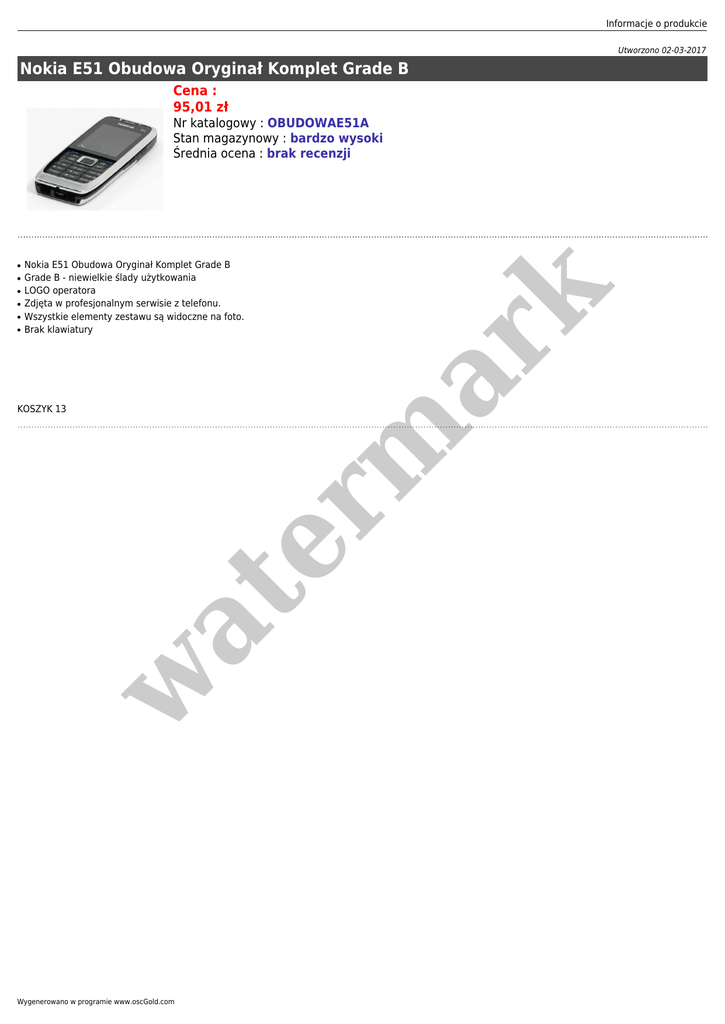 Informacje o produkcie Utworzono 02-03-2017 Nokia E51 Obudowa Oryginał Komplet Grade B Cena : 95,01 zł Nr katalogowy : OBUDOWAE51A Stan magazynowy : bardzo wysoki Średnia ocena : brak recenzji ● ● ● ● ● Nokia E51 Obudowa Oryginał Komplet Grade B Grade B - niewielkie ślady użytkowania LOGO operatora Zdjęta w profesjonalnym serwisie z telefonu. Wszystkie elementy zestawu są widoczne na foto. Brak klawiatury er m ar k ● w at KOSZYK 13 Wygenerowano w programie www.oscGold.com