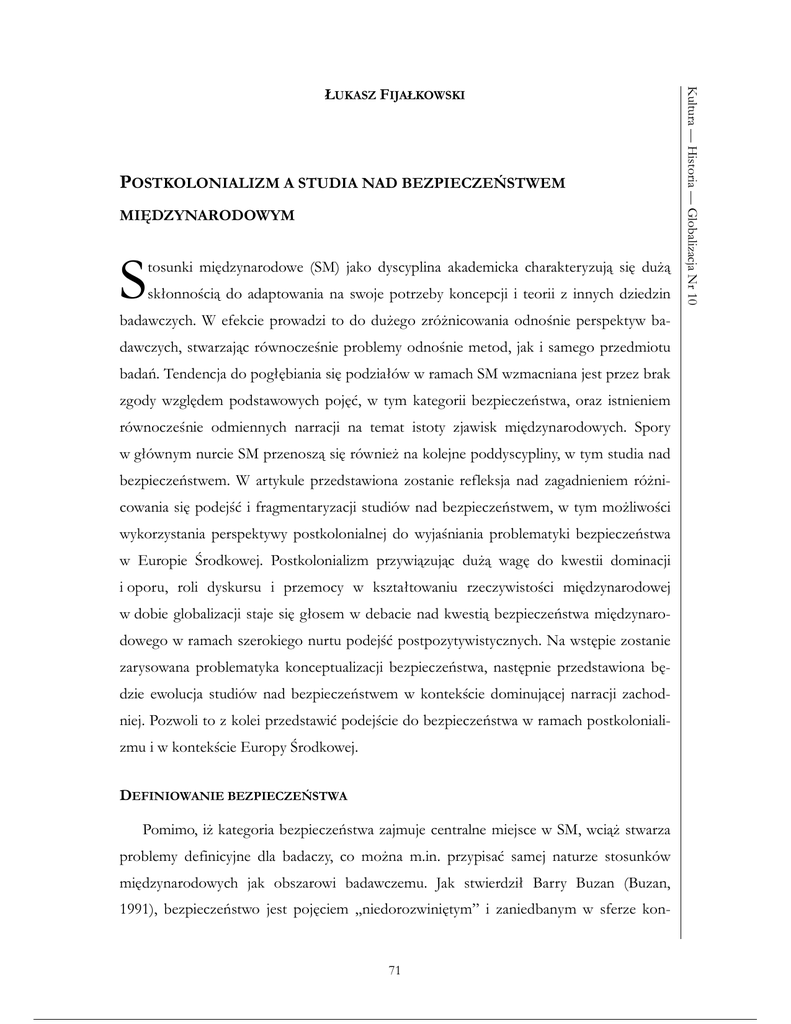 POSTKOLONIALIZM A STUDIA NAD BEZPIECZEŃSTWEM MIĘDZYNARODOWYM S tosunki międzynarodowe (SM) jako dyscyplina akademicka charakteryzują się duŜą skłonnością do adaptowania na swoje potrzeby koncepcji i teorii z innych dziedzin badawczych. W efekcie prowadzi to do duŜego zróŜnicowania odnośnie perspektyw badawczych, stwarzając równocześnie problemy odnośnie metod, jak i samego przedmiotu badań. Tendencja do pogłębiania się podziałów w ramach SM wzmacniana jest przez brak zgody względem podstawowych pojęć, w tym kategorii bezpieczeństwa, oraz istnieniem równocześnie odmiennych narracji na temat istoty zjawisk międzynarodowych. Spory w głównym nurcie SM przenoszą się równieŜ na kolejne poddyscypliny, w tym studia nad bezpieczeństwem. W artykule przedstawiona zostanie refleksja nad zagadnieniem róŜnicowania się podejść i fragmentaryzacji studiów nad bezpieczeństwem, w tym moŜliwości wykorzystania perspektywy postkolonialnej do wyjaśniania problematyki bezpieczeństwa w Europie Środkowej. Postkolonializm przywiązując duŜą wagę do kwestii dominacji i oporu, roli dyskursu i przemocy w kształtowaniu rzeczywistości międzynarodowej w dobie globalizacji staje się głosem w debacie nad kwestią bezpieczeństwa międzynarodowego w ramach szerokiego nurtu podejść postpozytywistycznych. Na wstępie zostanie zarysowana problematyka konceptualizacji bezpieczeństwa, następnie przedstawiona będzie ewolucja studiów nad bezpieczeństwem w kontekście dominującej narracji zachodniej. Pozwoli to z kolei przedstawić podejście do bezpieczeństwa w ramach postkolonializmu i w kontekście Europy Środkowej. DEFINIOWANIE BEZPIECZEŃSTWA Pomimo, iŜ kategoria bezpieczeństwa zajmuje centralne miejsce w SM, wciąŜ stwarza problemy definicyjne dla badaczy, co moŜna m.in. przypisać samej naturze stosunków międzynarodowych jak obszarowi badawczemu. Jak stwierdził Barry Buzan (Buzan, 1991), bezpieczeństwo jest pojęciem „niedorozwiniętym” i zaniedbanym w sferze kon- 71 Kultura — Historia — Globalizacja Nr 10 ŁUKASZ FIJAŁKOWSKI Łukasz Fijałkowski, Postkolonializm a studia nad bezpieczeństwem międzynarodowym cepcyjnej. Niemniej od lat 90. mamy do czynienia z licznymi próbami zredefiniowania bezpieczeństwa wykraczającymi poza wąskie militarne rozumienie tego pojęcia charakterystyczne dla okresu zimnowojennego. Pojawiły się w związku z tym opinie o kontestowaniu bezpieczeństwa, wraz z głosami „kontestującymi samo kontestowanie” (Baldwin, 1997, 10-12). W związku z tym David Baldwin określa bezpieczeństwo raczej jako pojęcie niedostatecznie wyjaśnione i będące obiektem ogólnego pomieszania pojęć. Wynika to choćby z faktu nie tyle szerokiej debaty na temat bezpieczeństwa, co ignorowania pewnych głosów w dyskusji (Baldwin, 1997, 11). PoniewaŜ bezpieczeństwo bezpośrednio dotyka kwestii egzystencjalnych (Zięba, 2008, 15), automatycznie zyskuje na znaczeniu a wszelkie zagroŜenia mogą przez to zostać uznane za egzystencjalne, co prowadzi do odwoływania się do pojęcia bezpieczeństwa (i pozwala m.in. na podejmowanie nadzwyczajnych działań). Stąd uwagę często poświęca się nie tyle samej kategorii, co zagroŜeniom i strategiom zapewnienia bezpieczeństwa. Tym samym pojęcie bezpieczeństwa jest uznawane za zdefiniowane a priori i nie wymagające powaŜniejszej dyskusji. Prowadzi to do przyjmowania definicji bezpieczeństwa, rozumianego jako brak zagroŜeń dla podstawowych wartości. Aby osiągnąć bezpieczeństwo, naleŜy skoncentrować się na wyeliminowaniu zagroŜeń lub ich powaŜnym zmniejszeniu. Szczególnie widoczne jest to w przypadku, gdy zagroŜenia są postrzegane przez pryzmat uŜycia siły. Tym samym głębsza refleksja na temat bezpieczeństwa zostaje podporządkowana strategiom zapewniania bezpieczeństwa. Uwzględniając koncentrację na środowisku międzynarodowym, zdefiniowanie bezpieczeństwa międzynarodowego nie jest zadaniem łatwym. Uznanie, iŜ bezpieczeństwo międzynarodowe to suma bezpieczeństwa narodowego poszczególnych państw plus coś więcej nadmiernie upraszcza sytuację (Mikiewicz, 2005, 32-40). Dodatkowo w obliczu narastającego kryzysu państwa jako podstawowego (lub w skrajnym ujęciu jedynego) podmiotu SM, koncentracja na bezpieczeństwie narodowym utoŜsamianym z bezpieczeństwem państwowym staje się obiektem krytyki. Propozycja, iŜ „bezpieczeństwo międzynarodowe oznacza w istocie stan braku zagroŜeń dla wartości wyznawanych przez elity władzy państw wchodzących w skład danego systemu międzynarodowego” (Mikiewicz, 2005, 39), świadomie zawęŜa podmiotowy obszar bezpieczeństwa, starając się nadać mu pewien zakres uŜyteczności. Jednocześnie obok bezpieczeństwa międzynarodowego pojawia się koncepcja bezpieczeństwa światowego lub globalnego, oraz ludzkiego, które pomimo róŜnych nazw w praktyce zajmują się odmiennymi wymiarami bezpieczeństwa, lecz nie 72 czy w zaleŜności od okoliczności, zabiegiem który pozwala na odpowiednie doprecyzowanie kategorii bezpieczeństwa jest jego kontekstualizacja. Pozwala ona na zachowanie ogólnej wyjściowej definicji, by następnie stworzyć moŜliwą do zastosowania w konkretnym przypadku definicję operacyjną (Williams, 2008, 5-10; Baldwin, 1997, 13-18). STUDIA NAD BEZPIECZEŃSTWEM Sposób dominującego pojmowania bezpieczeństwa moŜna uznać za bezpośrednio związany z ewolucją badań nad bezpieczeństwem i ich instytucjonalizacją (Buzan, Hansen, 2009). Podkreśla ona rolę zachodnich ośrodków i dominację dyskursu państwocentrycznego w tej kwestii. Od początku (tzn. rozpoczęcia zimnej wojny) doszło tutaj do istotnego zawęŜenia tematyki i koncentracji na czterech podstawowych kwestiach: państwie, studiach strategicznych, utrzymaniu status quo i kwestii naukowości (Williams, 2008, 3). Podstawową perspektywą analizy stał się poziom międzynarodowy, zdominowany przez rywaliza