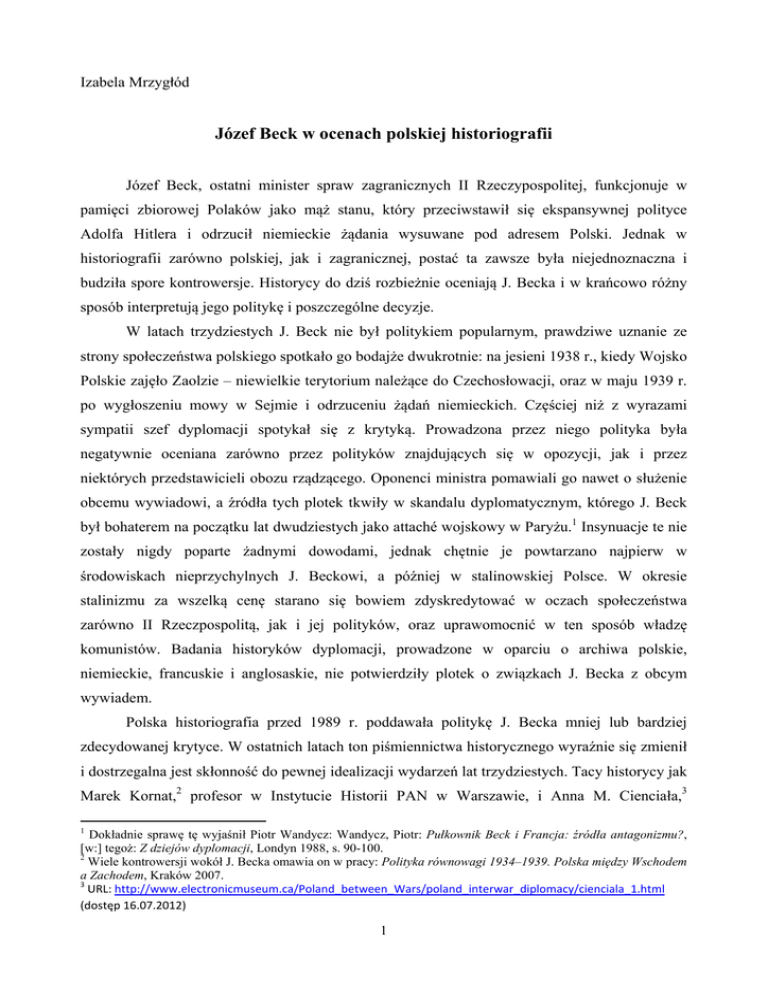 Izabela Mrzygłód Józef Beck w ocenach polskiej historiografii Józef Beck, ostatni minister spraw zagranicznych II Rzeczypospolitej, funkcjonuje w pamięci zbiorowej Polaków jako mąż stanu, który przeciwstawił się ekspansywnej polityce Adolfa Hitlera i odrzucił niemieckie żądania wysuwane pod adresem Polski. Jednak w historiografii zarówno polskiej, jak i zagranicznej, postać ta zawsze była niejednoznaczna i budziła spore kontrowersje. Historycy do dziś rozbieżnie oceniają J. Becka i w krańcowo różny sposób interpretują jego politykę i poszczególne decyzje. W latach trzydziestych J. Beck nie był politykiem popularnym, prawdziwe uznanie ze strony społeczeństwa polskiego spotkało go bodajże dwukrotnie: na jesieni 1938 r., kiedy Wojsko Polskie zajęło Zaolzie – niewielkie terytorium należące do Czechosłowacji, oraz w maju 1939 r. po wygłoszeniu mowy w Sejmie i odrzuceniu żądań niemieckich. Częściej niż z wyrazami sympatii szef dyplomacji spotykał się z krytyką. Prowadzona przez niego polityka była negatywnie oceniana zarówno przez polityków znajdujących się w opozycji, jak i przez niektórych przedstawicieli obozu rządzącego. Oponenci ministra pomawiali go nawet o służenie obcemu wywiadowi, a źródła tych plotek tkwiły w skandalu dyplomatycznym, którego J. Beck był bohaterem na początku lat dwudziestych jako attaché wojskowy w Paryżu.1 Insynuacje te nie zostały nigdy poparte żadnymi dowodami, jednak chętnie je powtarzano najpierw w środowiskach nieprzychylnych J. Beckowi, a później w stalinowskiej Polsce. W okresie stalinizmu za wszelką cenę starano się bowiem zdyskredytować w oczach społeczeństwa zarówno II Rzeczpospolitą, jak i jej polityków, oraz uprawomocnić w ten sposób władzę komunistów. Badania historyków dyplomacji, prowadzone w oparciu o archiwa polskie, niemieckie, francuskie i anglosaskie, nie potwierdziły plotek o związkach J. Becka z obcym wywiadem. Polska historiografia przed 1989 r. poddawała politykę J. Becka mniej lub bardziej zdecydowanej krytyce. W ostatnich latach ton piśmiennictwa historycznego wyraźnie się zmienił i dostrzegalna jest skłonność do pewnej idealizacji wydarzeń lat trzydziestych. Tacy historycy jak Marek Kornat,2 profesor w Instytucie Historii PAN w Warszawie, i Anna M. Cienciała,3 1 Dokładnie sprawę tę wyjaśnił Piotr Wandycz: Wandycz, Piotr: Pułkownik Beck i Francja: źródła antagonizmu?, [w:] tegoż: Z dziejów dyplomacji, Londyn 1988, s. 90-100. 2 Wiele kontrowersji wokół J. Becka omawia on w pracy: Polityka równowagi 1934–1939. Polska między Wschodem a Zachodem, Kraków 2007. 3 URL: http://www.electronicmuseum.ca/Poland_between_Wars/poland_interwar_diplomacy/cienciala_1.html (dostęp 16.07.2012) 1 emerytowana profesor University of Kansas, prezentują postać ministra w zdecydowanie jasnych barwach i pozytywnie oceniają jego politykę. Stanowczym krytykiem J. Becka i jego działań pozostaje profesor Stanisław Żerko,4 pracownik Instytutu Zachodniego w Poznaniu. Pośród zagadnień polskiej polityki zagranicznej okresu 1932–1939 wiele spraw doczekało się rozbieżnych sądów i interpretacji. Kolejni historycy poddawali ocenie zarówno stosunek J. Becka do poszczególnych państw (w pierwszej kolejności do Francji, Czechosłowacji, Wielkiej Brytanii i ZSRR) i do Ligii Narodów, działania przeciw projektom bezpieczeństwa zbiorowego i porozumieniom multilateralnym, jak i aspirowanie Polski do statusu mocarstwa. Rozważali, jaki wpływ na polską dyplomację miała postawa samego J. Becka i jego negatywny wizerunek na arenie międzynarodowej. Zastanawiali się, czy minister zdawał sobie sprawę z nadchodzącego zagrożenia i czy rozumiał istotę systemu hitlerowskiego, wielokrotnie też padało pytanie, czy istniał w 1939 r. jakikolwiek inny scenariusz dla Polski. Ten ostatni problem podjął niedawno Tomasz Łubieński w najnowszym eseju historycznym, przytoczył tam również wiele mało pochlebnych opinii swojego stryja Michała Łubieńskiego (dyrektora gabinetu ministra) na temat J. Becka.5 Różnorodne wątki tych dyskusji historiograficznych koncentrują się na pojęciu „polityki równowagi”.6 Koncepcja ta krystalizowała się w Warszawie od 1933/1934 r. w odpowiedzi na ugodowe tendencje mocarstw zachodnich wobec Niemiec, jej architektem był faktyczny szef państwa Józef Piłsudski, a wykonawcą – Józef Beck. Zasadniczym założeniem „polityki równowagi” miało być utrzymanie równej odległości pomiędzy Niemcami i Rosją, niewchodzenie z żadnym z tych mocarstw w sojusz wymierzony przeciwko drugiemu z nich i zapewnienie bezpieczeństwa Polsce za pomocą układów bilateralnych. Ze Związkiem Radzieckim pakt o nieagresji zawarto 25 lipca 1932 r. Natomiast z Niemcami udało się doprowadzić do odprężenia stosunków przez podpisanie 26 stycznia 1934 r. deklaracji o niestosowaniu przemocy. Jednocześnie fundamentem i gwarancją dla Polski miał pozostać układ sojuszniczy z Francją z 1921 r. 4 Czemu dał wyraz w swej pracy: Żerko, Stanisław: Stosunki polsko-niemieckie 1938–1939, Poznań 1998. Łubieński, Tomasz: 1939. Zaczęło się we wrześniu, Warszawa 2009. Wydanie niemieckie: 1939. Noch war Polen nicht verloren, Berlin 2010. 6 Obszerna dyskusja na ten temat miała miejsce m.in. na łamach czasopisma naukowego „Dzieje Najnowsze” w latach 2000–2002 po opublikowaniu książki S. Żerki: Żerko, Stanisław: Stosunki polsko-niemieckie 1938–1939, Poznań 1998. Polemika toczyła się wówczas pomiędzy Markiem Kornatem, Stanisławem Żerką i Michałem Zachariasem. 5 2 Beck a Berlin To właśnie sposób rozumienia „polityki równowagi” i postrzegania relacji na linii Warszawa–Berlin / Moskwa / Paryż odgrywa kluczową rolę w ocenie działań ministra J. Becka. Zwrot w stosunkach polsko-niemieckich, który się dokonał wraz z podpisaniem deklaracji 26 stycznia 1934 r., był ogromnym zaskocz