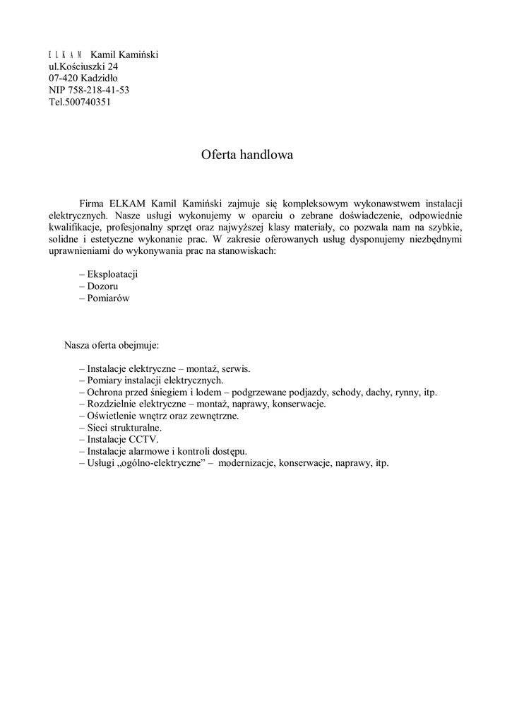 ELKAM Kamil Kami ski ul.Ko ciuszki 24 07-420 Kadzid o NIP 758-218-41-53 Tel.500740351 Oferta handlowa Firma ELKAM Kamil Kami ski zajmuje si kompleksowym wykonawstwem instalacji elektrycznych. Nasze us ugi wykonujemy w oparciu o zebrane do wiadczenie, odpowiednie kwalifikacje, profesjonalny sprz t oraz najwy szej klasy materia y, co pozwala nam na szybkie, solidne i estetyczne wykonanie prac. W zakresie oferowanych us ug dysponujemy niezb dnymi uprawnieniami do wykonywania prac na stanowiskach: – Eksploatacji – Dozoru – Pomiarów Nasza oferta obejmuje: – Instalacje elektryczne – monta , serwis. – Pomiary instalacji elektrycznych. – Ochrona przed niegiem i lodem – podgrzewane podjazdy, schody, dachy, rynny, itp. – Rozdzielnie elektryczne – monta , naprawy, konserwacje. – O wietlenie wn trz oraz zewn trzne. – Sieci strukturalne. – Instalacje CCTV. – Instalacje alarmowe i kontroli dost pu. – Us ugi „ogólno-elektryczne” – modernizacje, konserwacje, naprawy, itp.